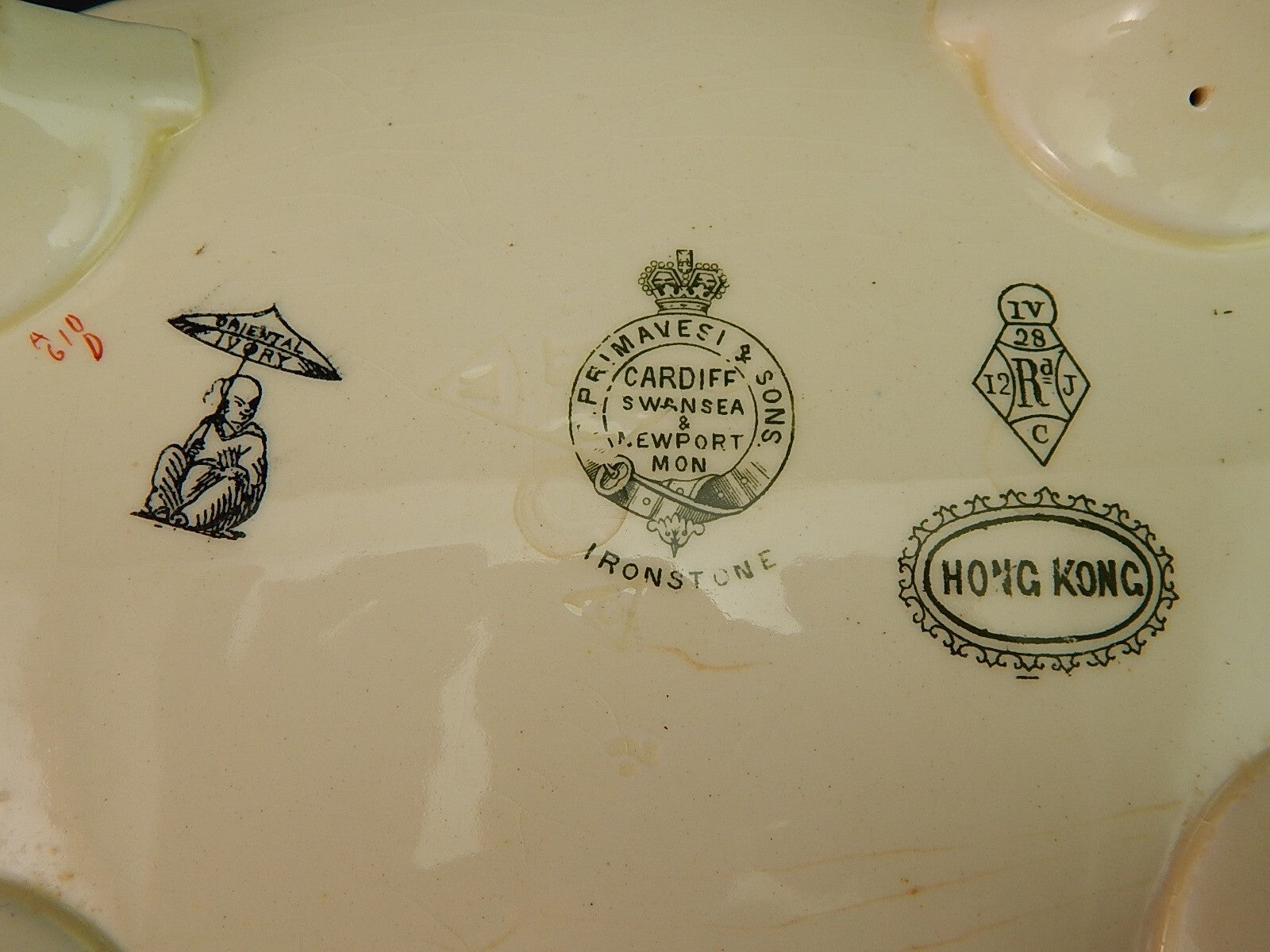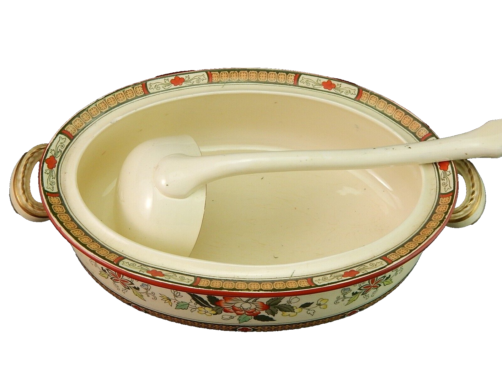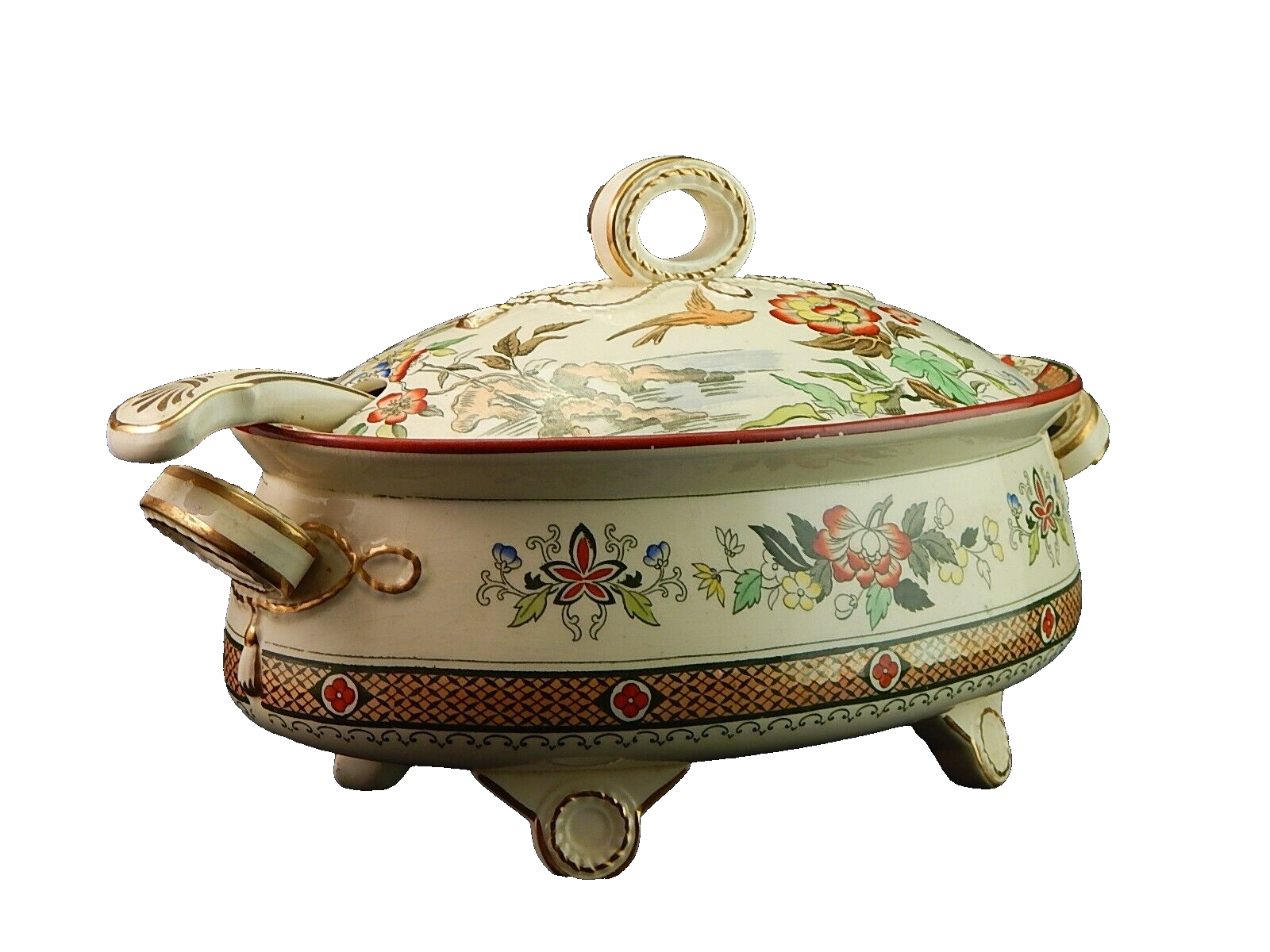 In questa inserzione viene presentata un'antica rarissima zuppiera realizzata nel 1880 dalla manifattura inglese Bishop Powell & Stonier decorata con il disegno denominato Hong Kong Oriental Ivory