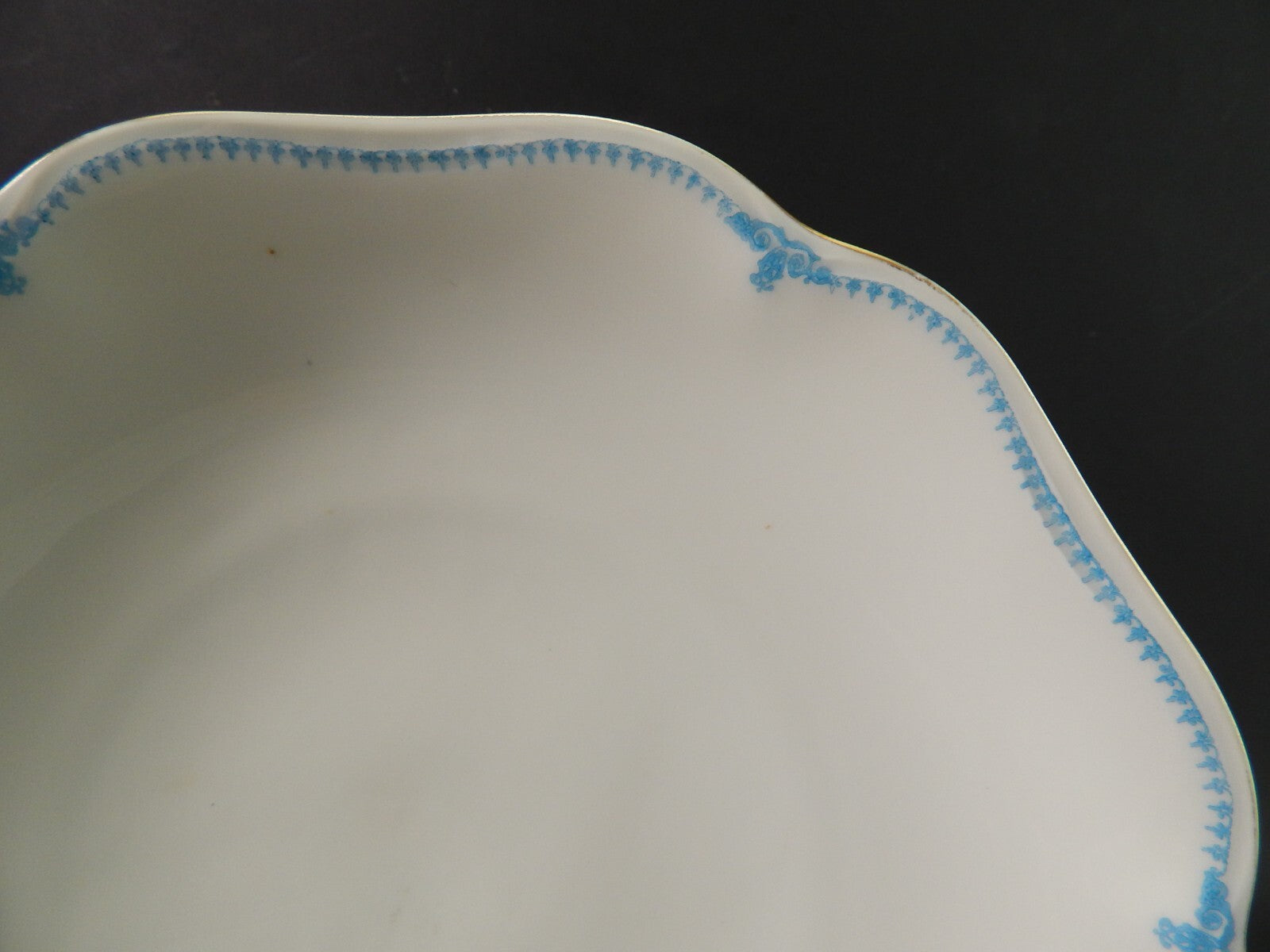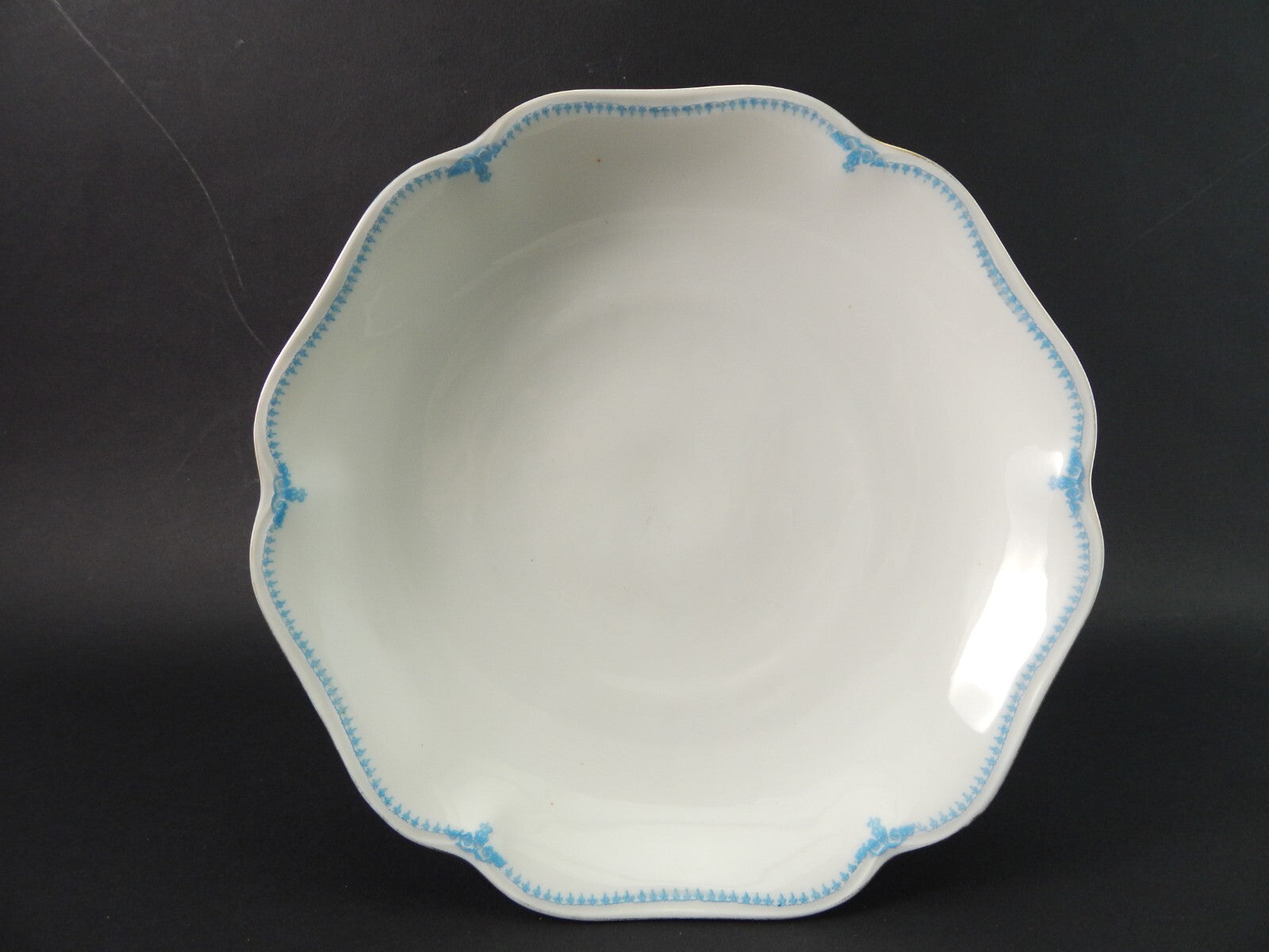 In questa inserzione viene presentata un'antica alzata in porcellana bianca decorata a mano in turchese e oro.