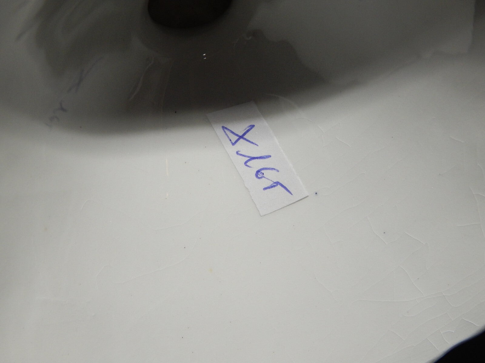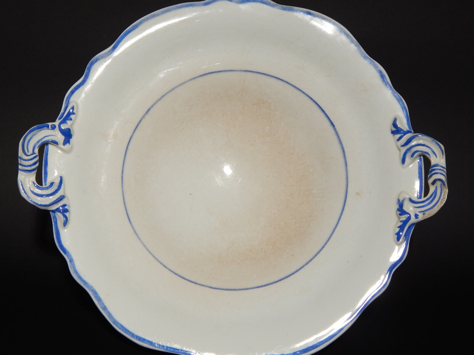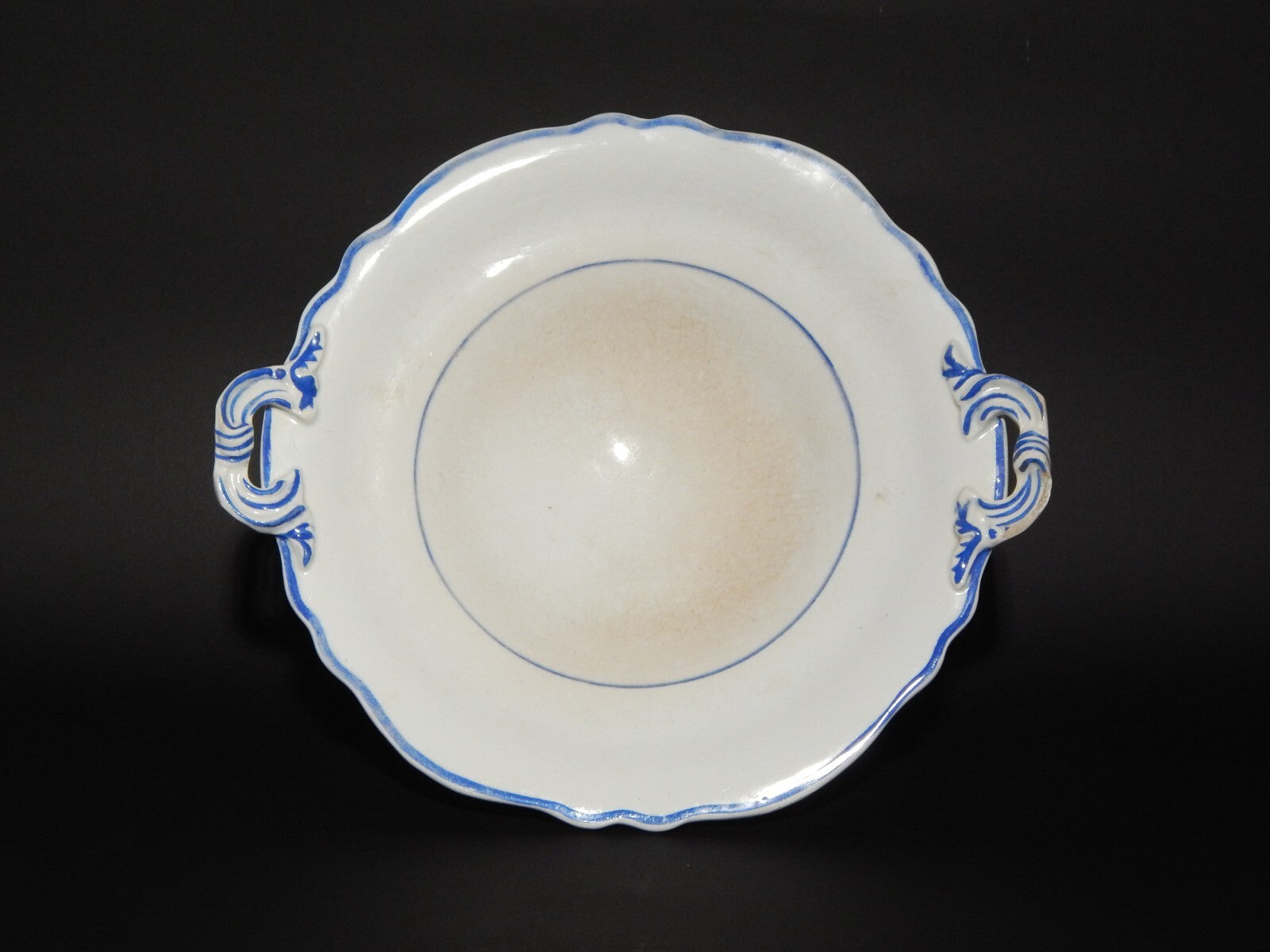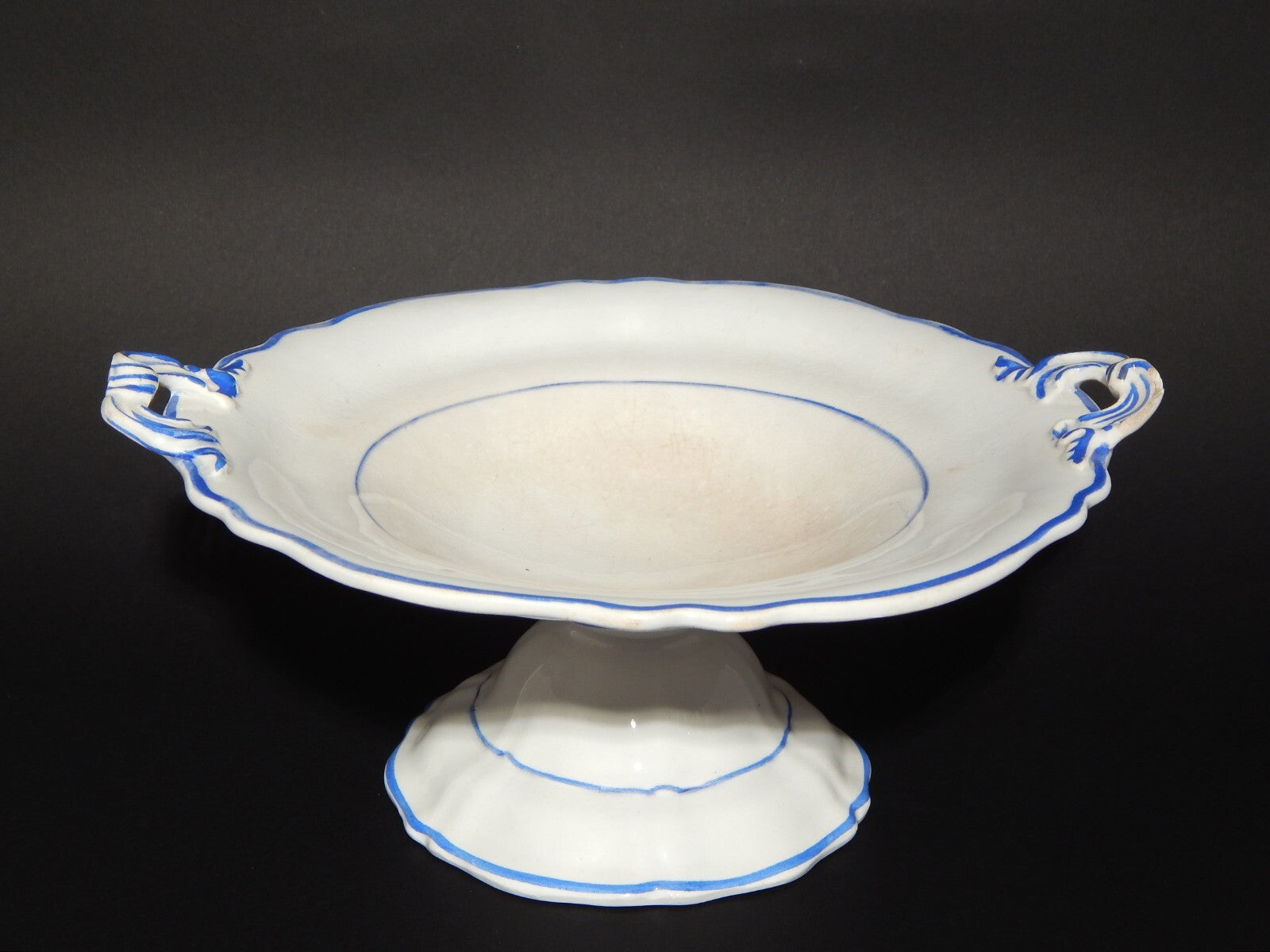 La fruttiera o centrotavola in ceramica bianca decorata in blu cobalto misura 23,5 cm di diametro, 26 cm da ansa ad ansa e 11 cm di altezza, come si può vedere dalle foto presenta alcune macchie e una piccola scheggiatura su un manico