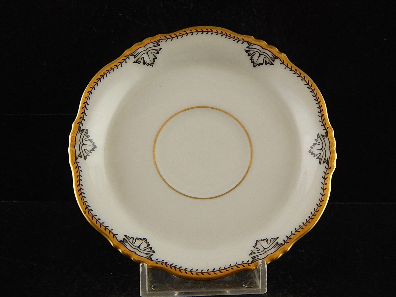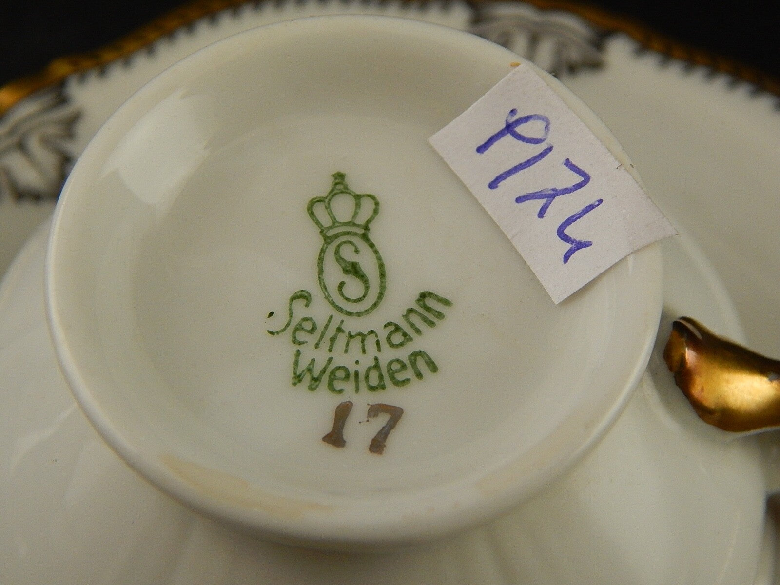 In questa inserzione viene presentata un'antica tazzina da caffè con relativo piattino in porcellana bianca con decori in oro zecchino e nero realizzato negli anni '30 dalla manifattura tedesca Bavaria Seltmann Weiden-E