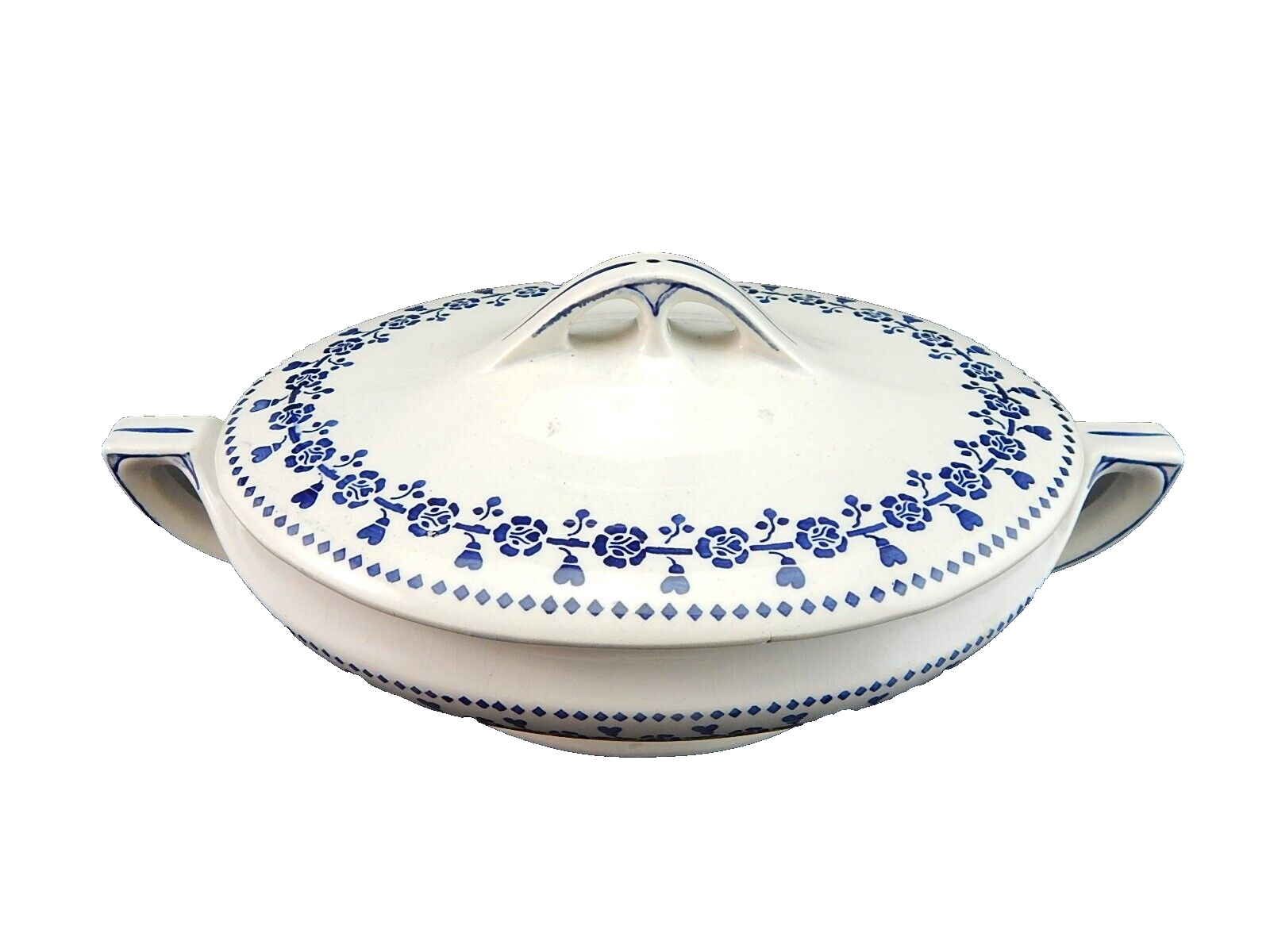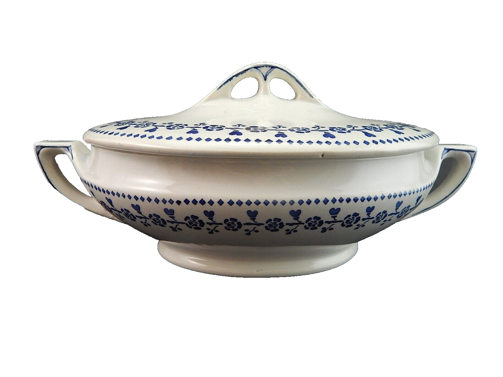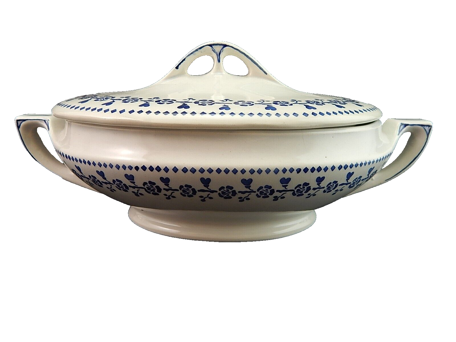 ANTICA ART DECO ZUPPIERA LEGUMIERA SEMI PORCELLANA CECILIE BIANCA E BLU