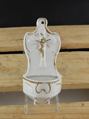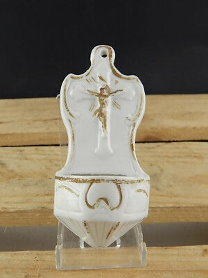 ANTICA ACQUASANTIERA FONT PORCELLANA BIANCA RIFINITA IN ORO