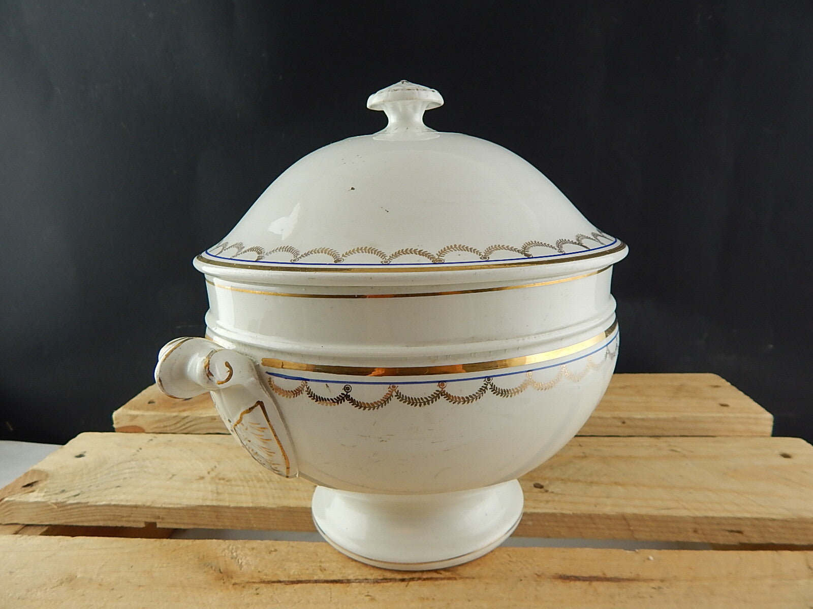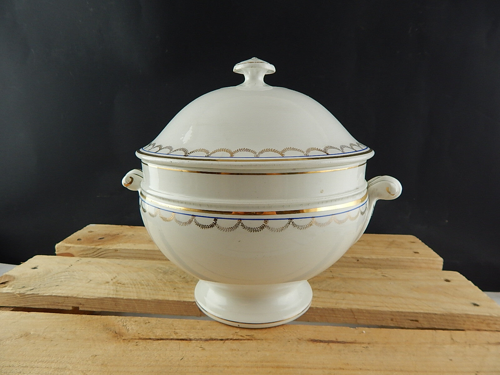 La zuppiera è decorata in oro zecchino e con un profilo blu cobalto, misura 23 cm di altezza e 25 cm da manico a manico.