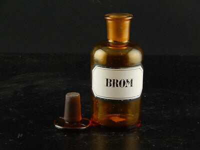 La bottiglia con etichetta Brom misura 12 cm. di altezza e 5 cm. di diametro