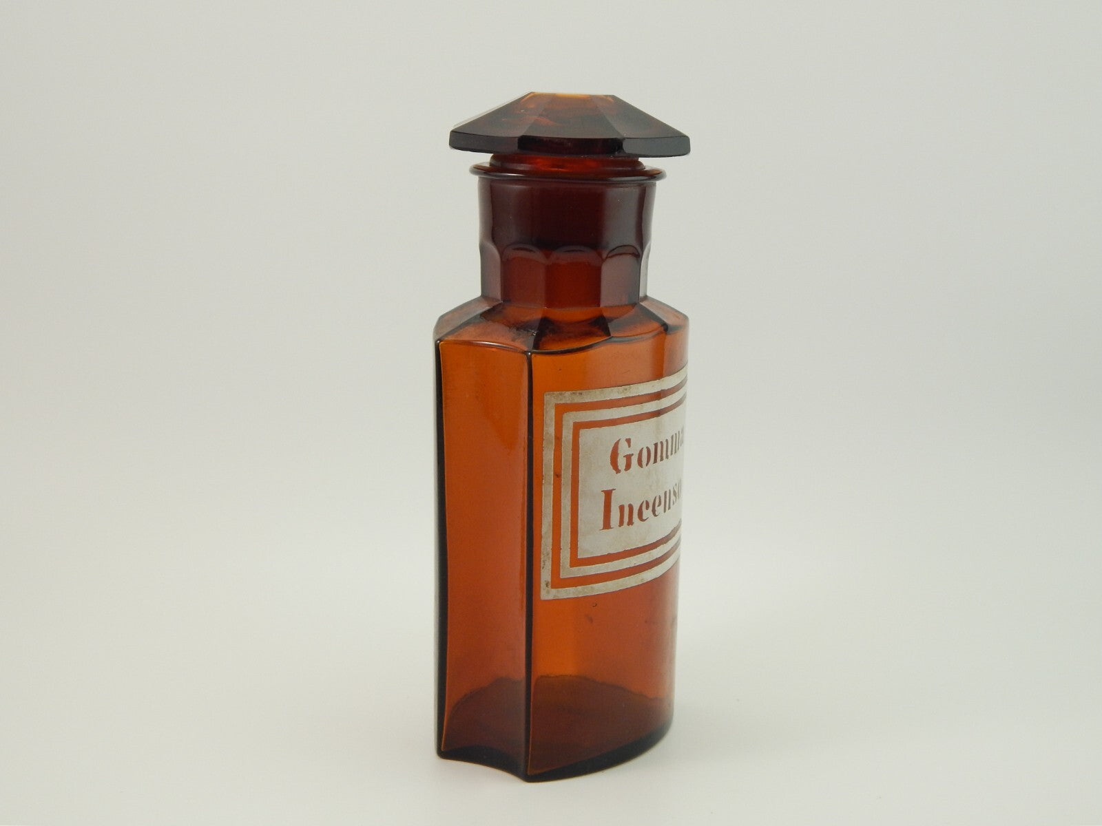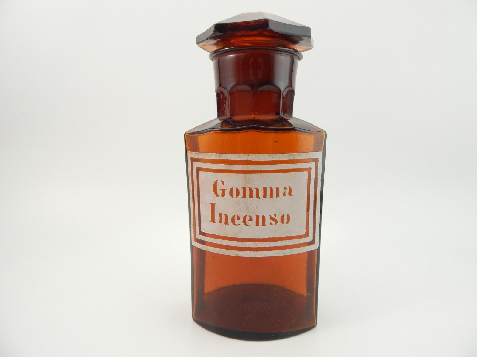 ANTICA BOTTIGLIA VETRO SOFFIATO FARMACIA COLOR AMBRA ETICHETTA GOMMA INCENSO