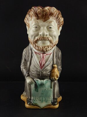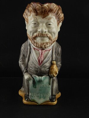 La caraffa raffigura un deputato francese che nei primi anni del 1900 proponeva "la reforme urgente" che consisteva nell'aumento dell'indennità per i deputati
