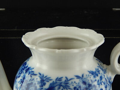 In questa inserzione viene presentata un'antica caffettiera senza coperchio in porcellana bianca con decoro in blu cobalto realizzata negli anni '40 dalla manifattura tedesca Bavaria Seltmann Weiden-E nel modello Theresia