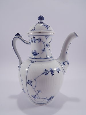 In questa inserzione viene presentata un'antica caffettiera Blue Fluted realizzata dalla rinomata manifattura danese Royal Copenhagen.