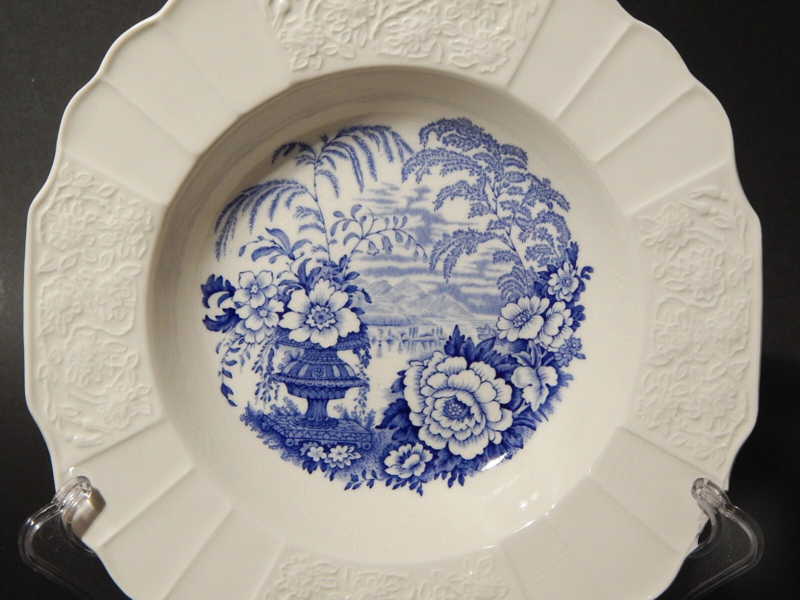 La ciotola stampata a mano sotto smalto misura 24 cm di diametro e 5 cm di altezza, come si può vedere dalle foto presenta una scheggiatura sul bordo