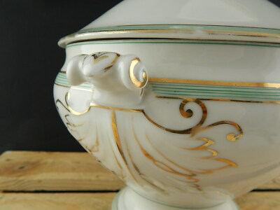 In questa inserzione viene presentata una zuppiera in porcellana bianca decorata a mano con profili verdi e oro zecchino alla fine del 1800