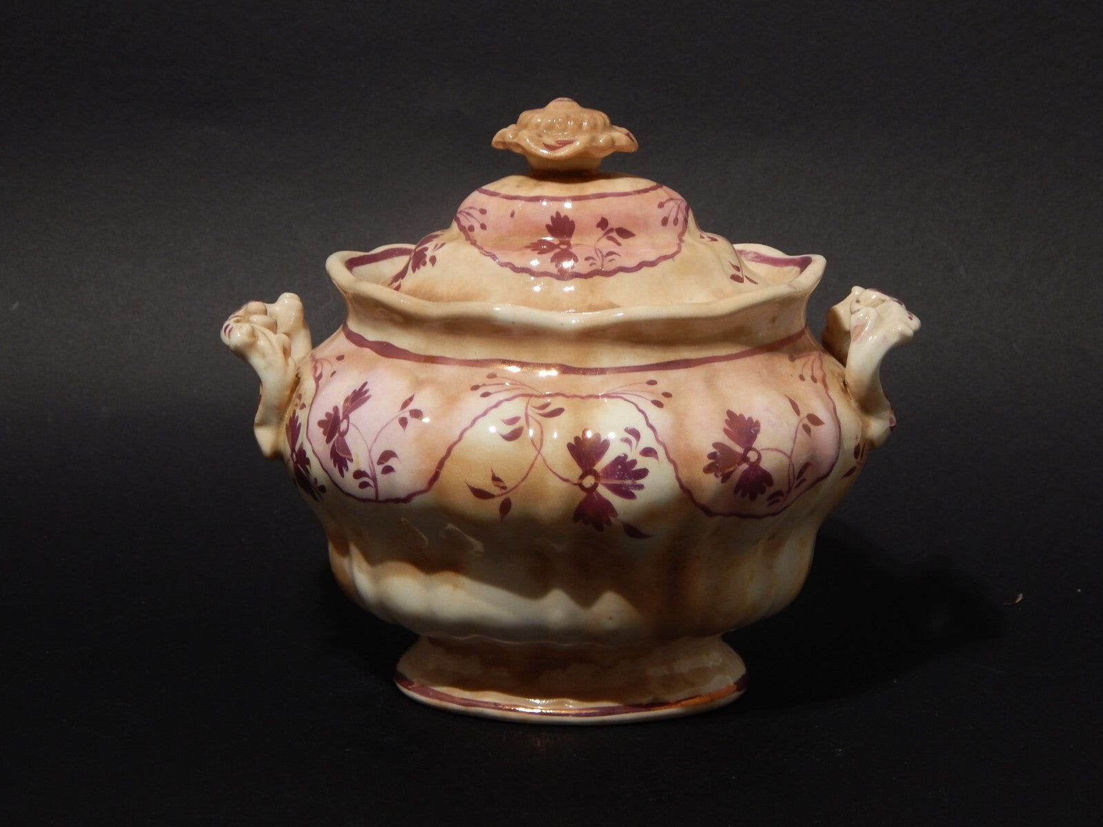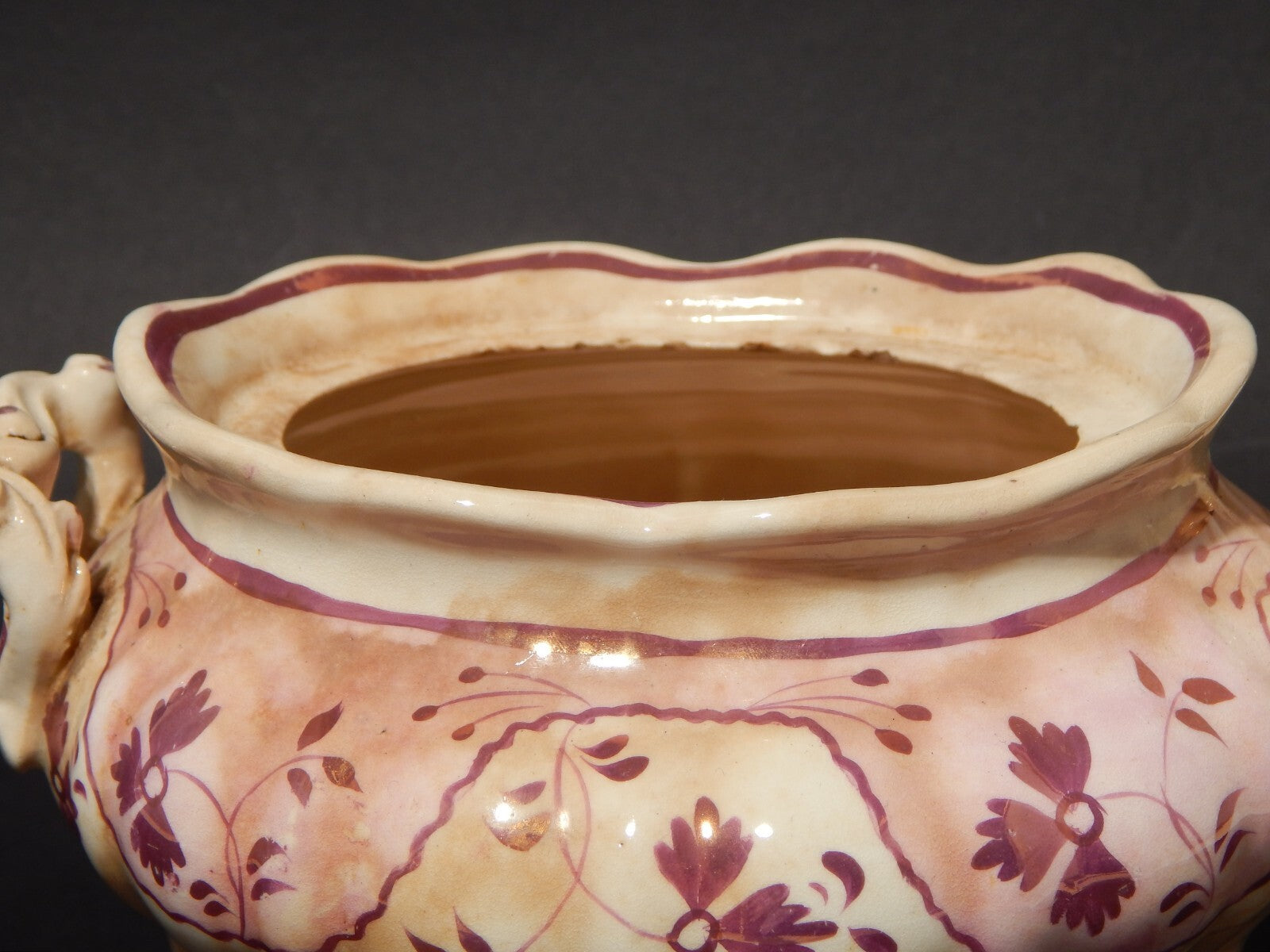 In questa inserzione viene presentata un’antica e rarissima potiche o zuccheriera in porcellana decorata a lustro in rosa da una manifattura inglese dello Staffordshire . La potiche misura 16 x 13 cm, 18,5 cm da manico a manico e 16 cm di altezza, come si può vedere dalle foto presenta i segni del tempo, sono presenti diverse macchie