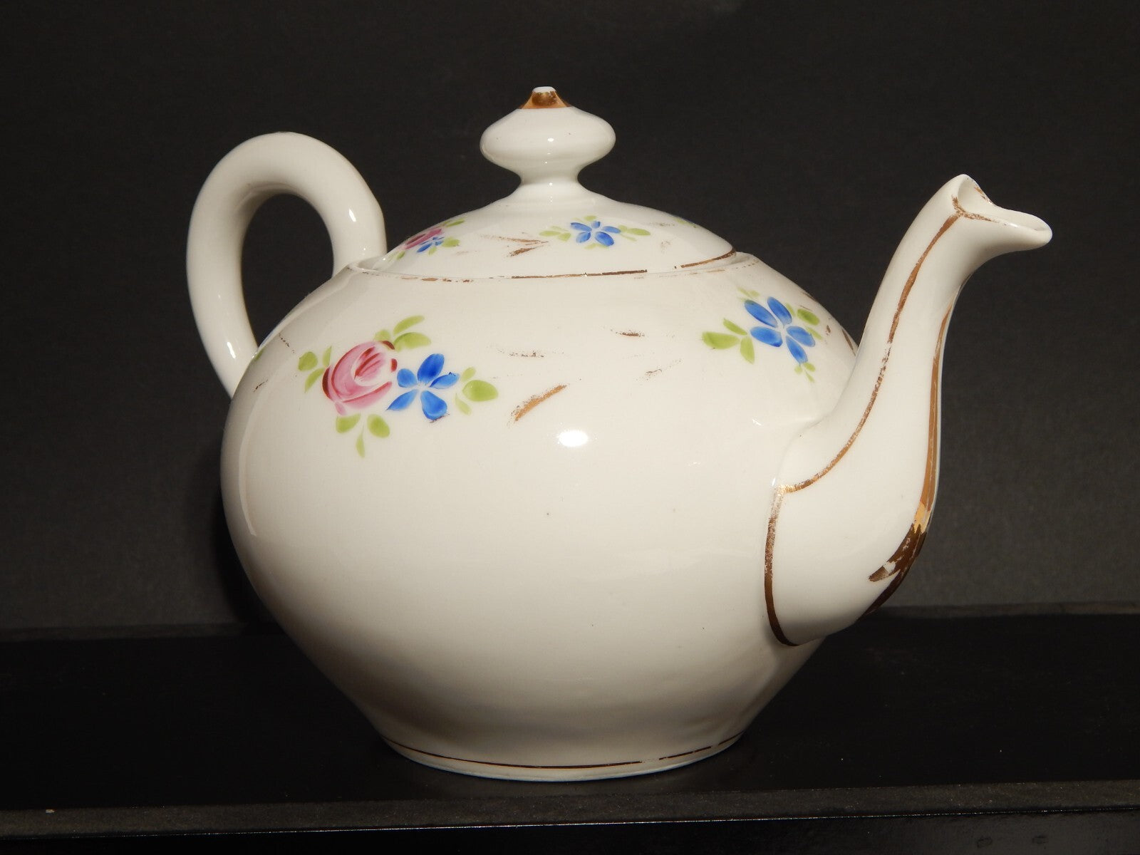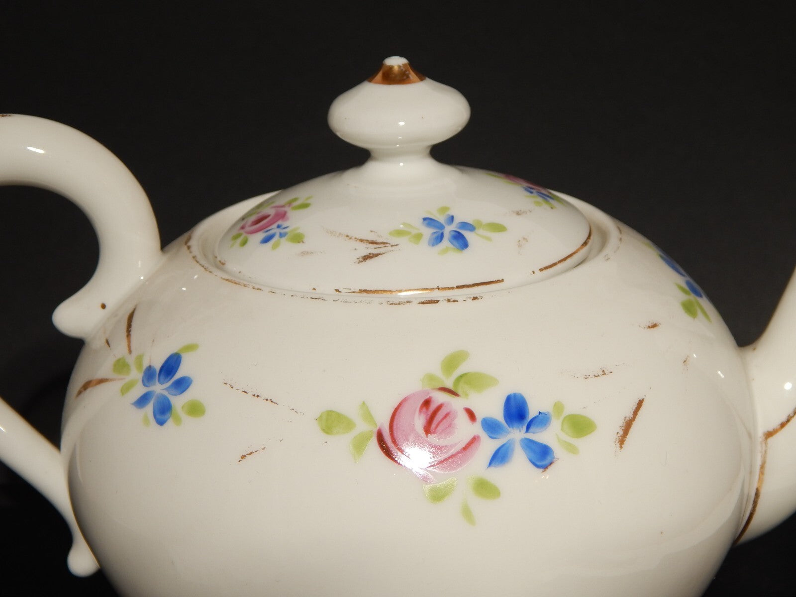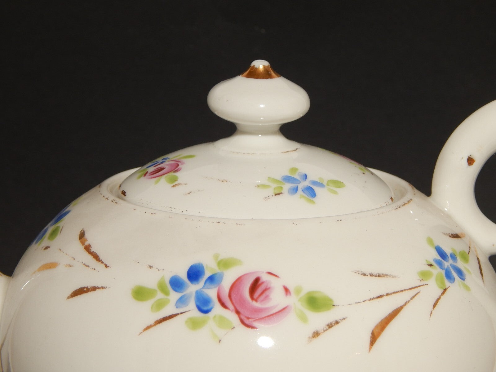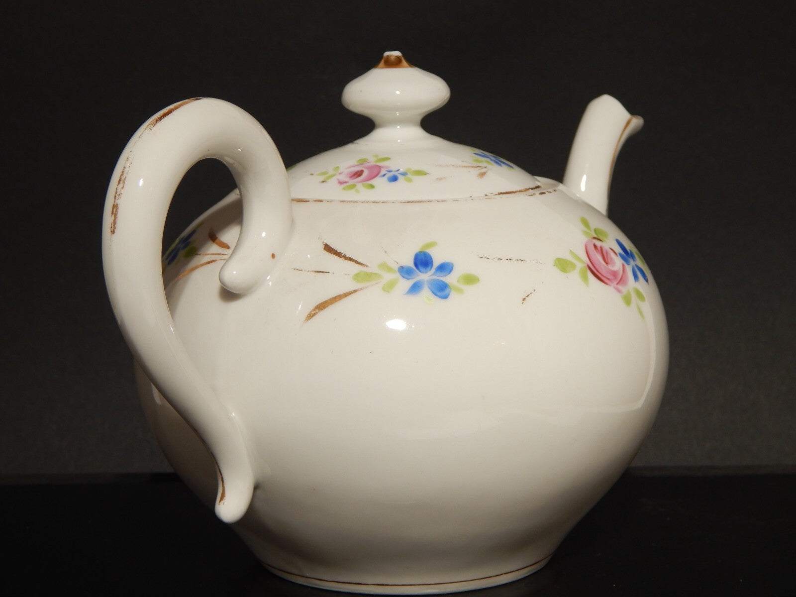 La teiera in porcellana bianca è stata decorata a mano con fiori policromi e oro zecchino