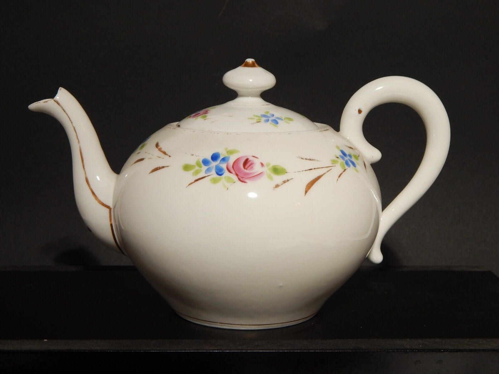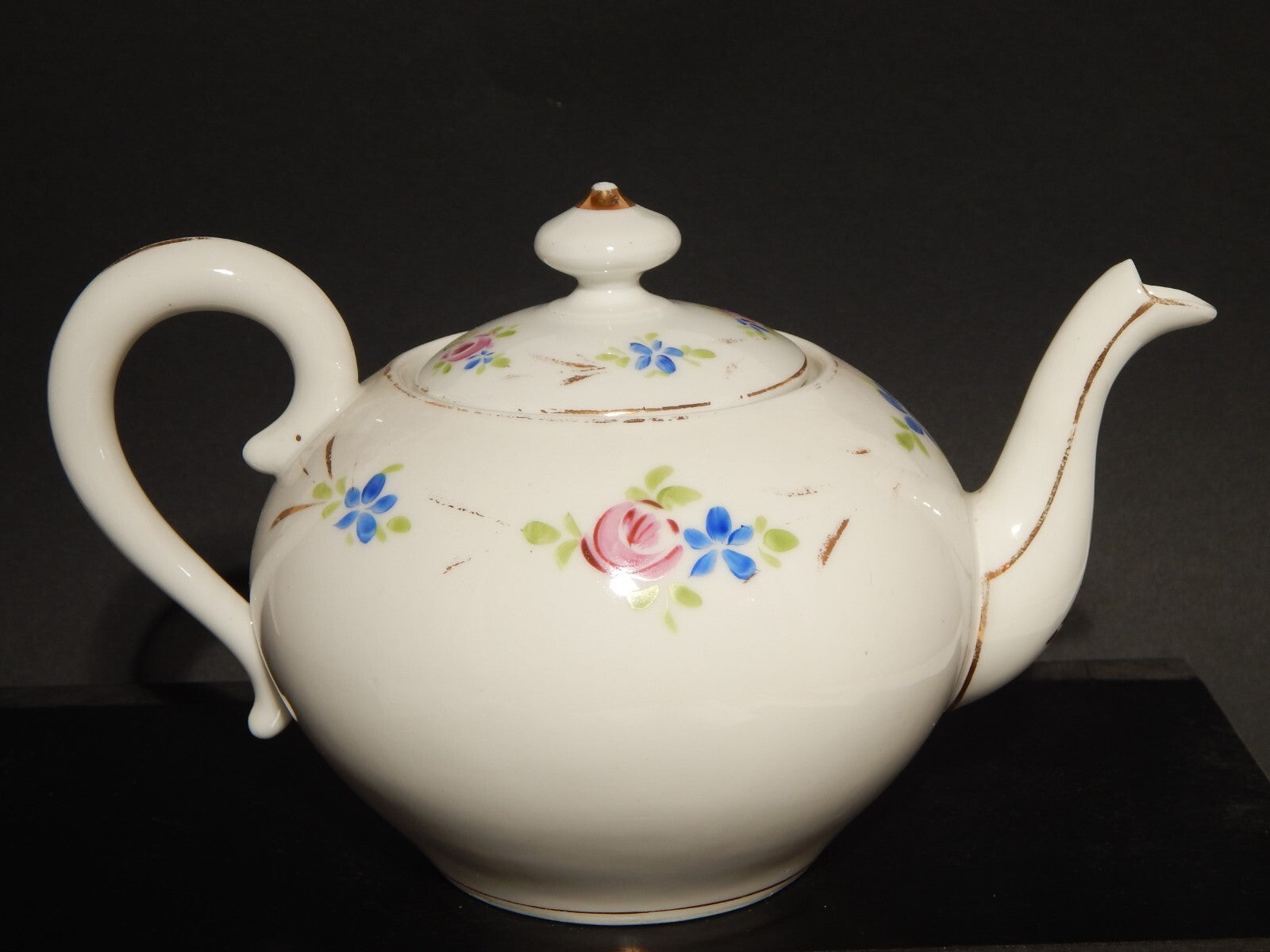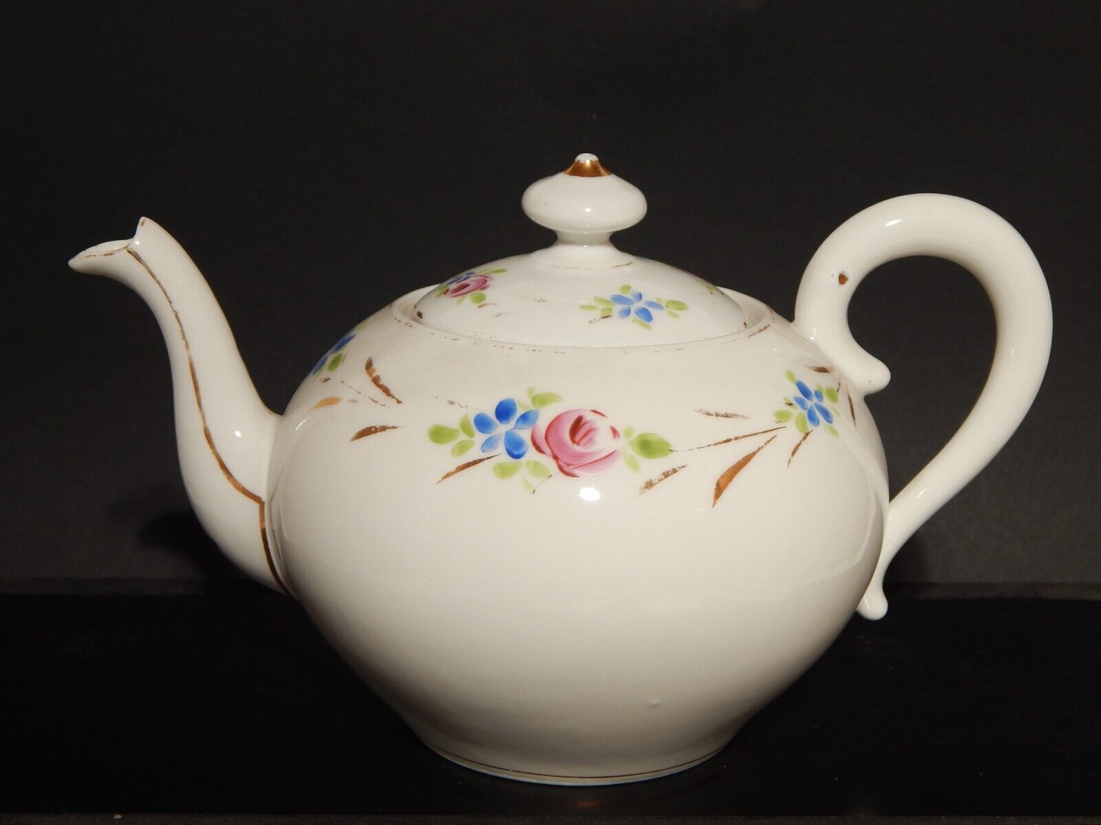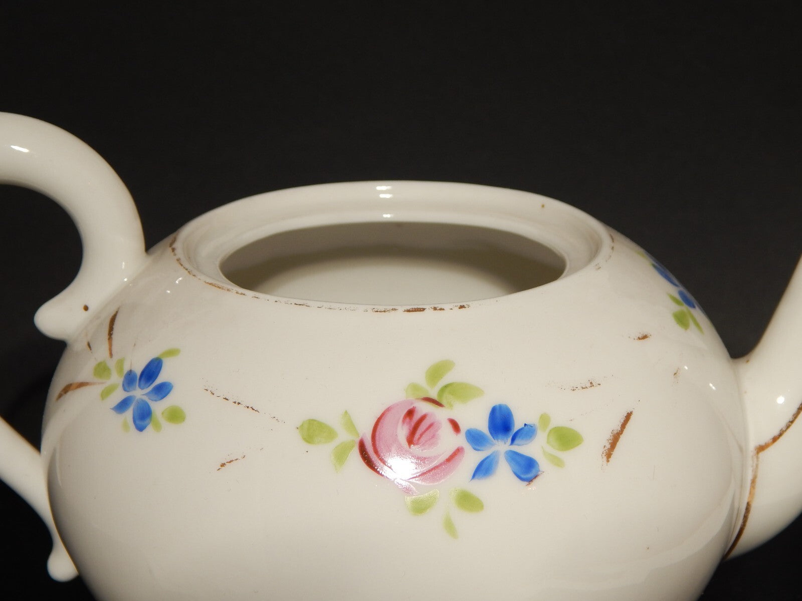 La teiera in porcellana bianca è stata decorata a mano con fiori policromi e oro zecchino
