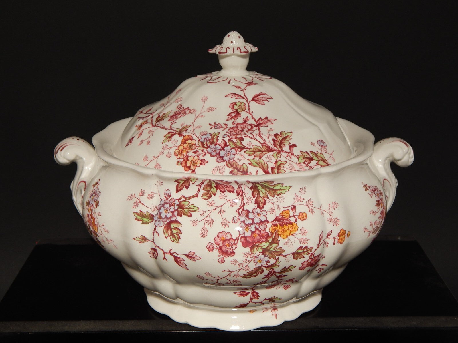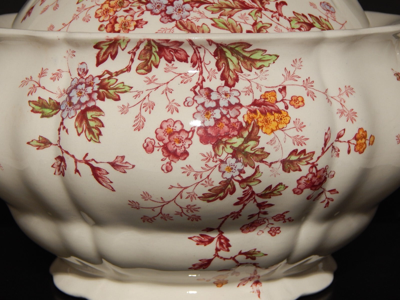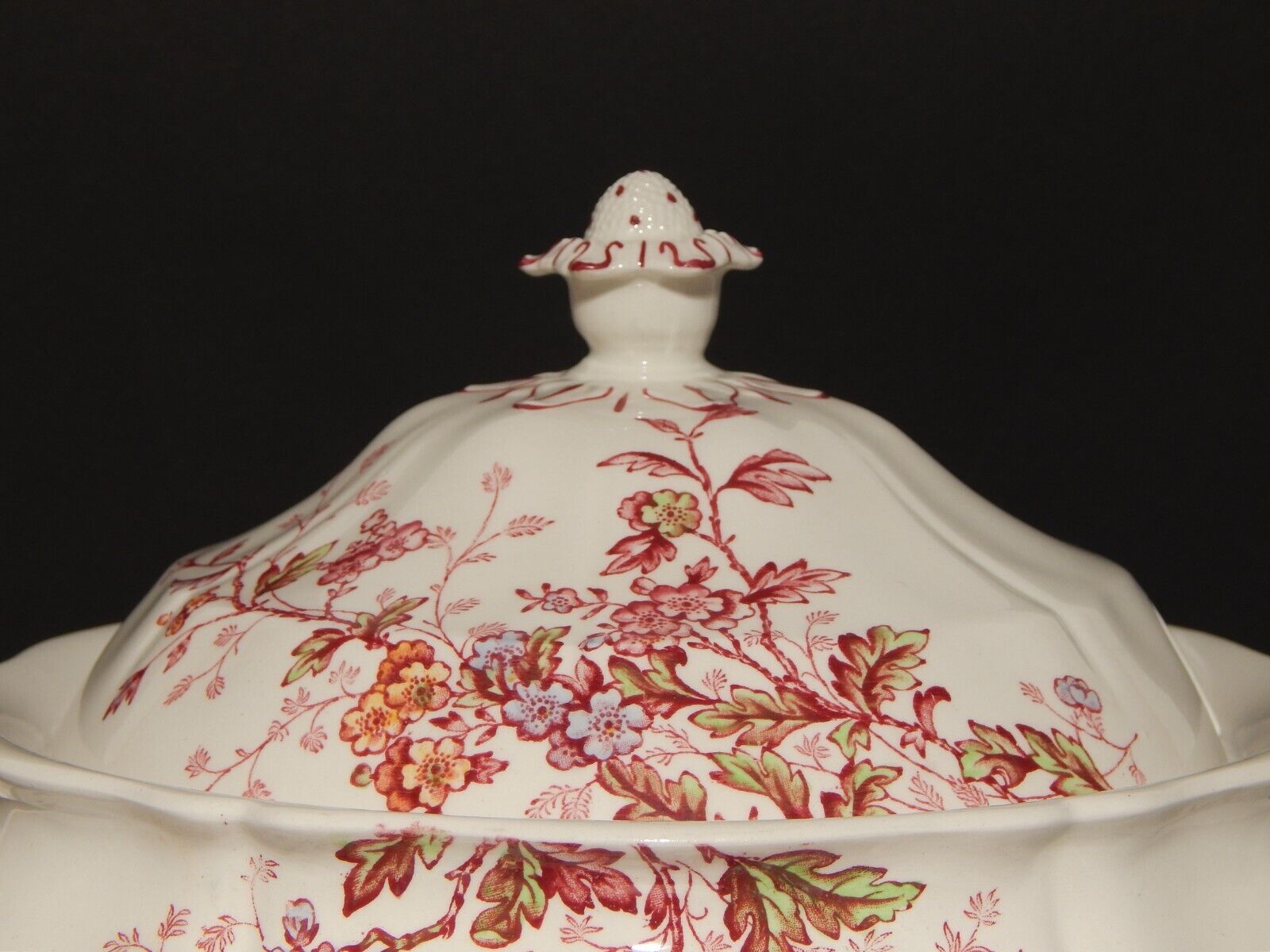 In questa inserzione viene presentata un'antica grande zuppiera o centrotavola realizzata nei primi anni del 1900 dalla rinomata manifattura inglese Booths nel famoso decoro Washington sui toni del rosa