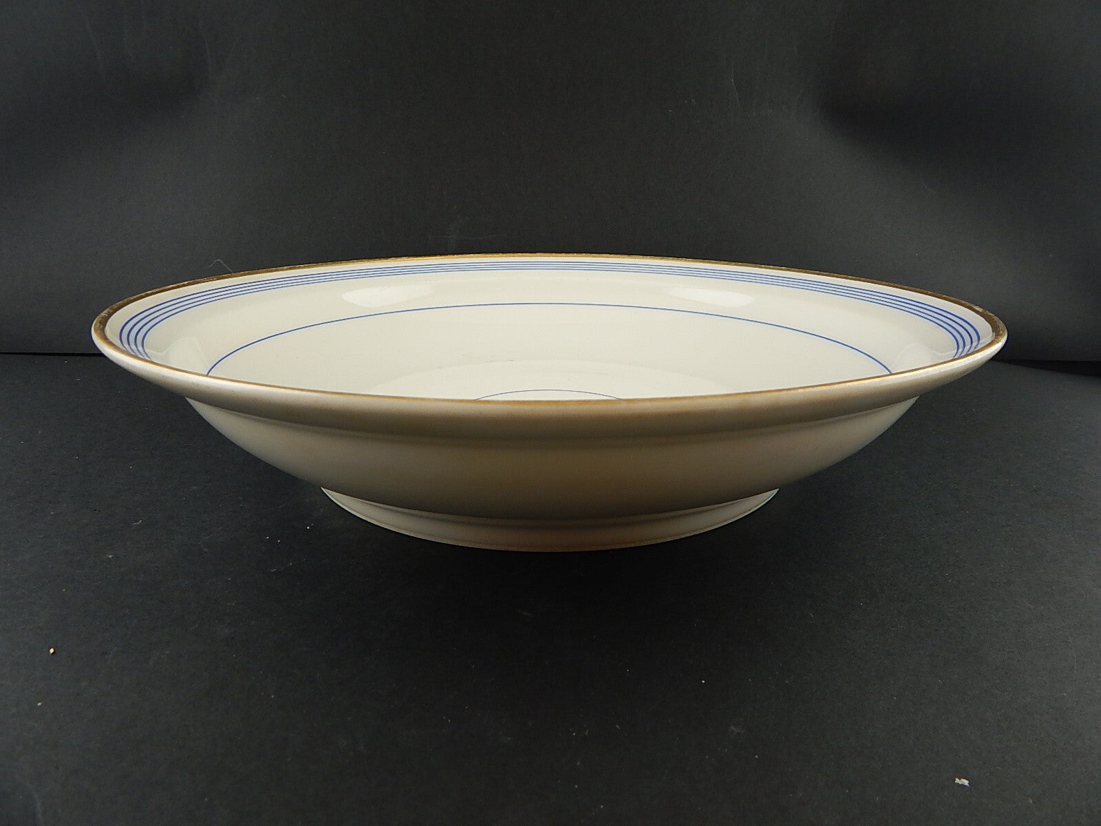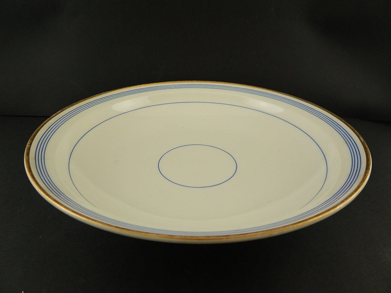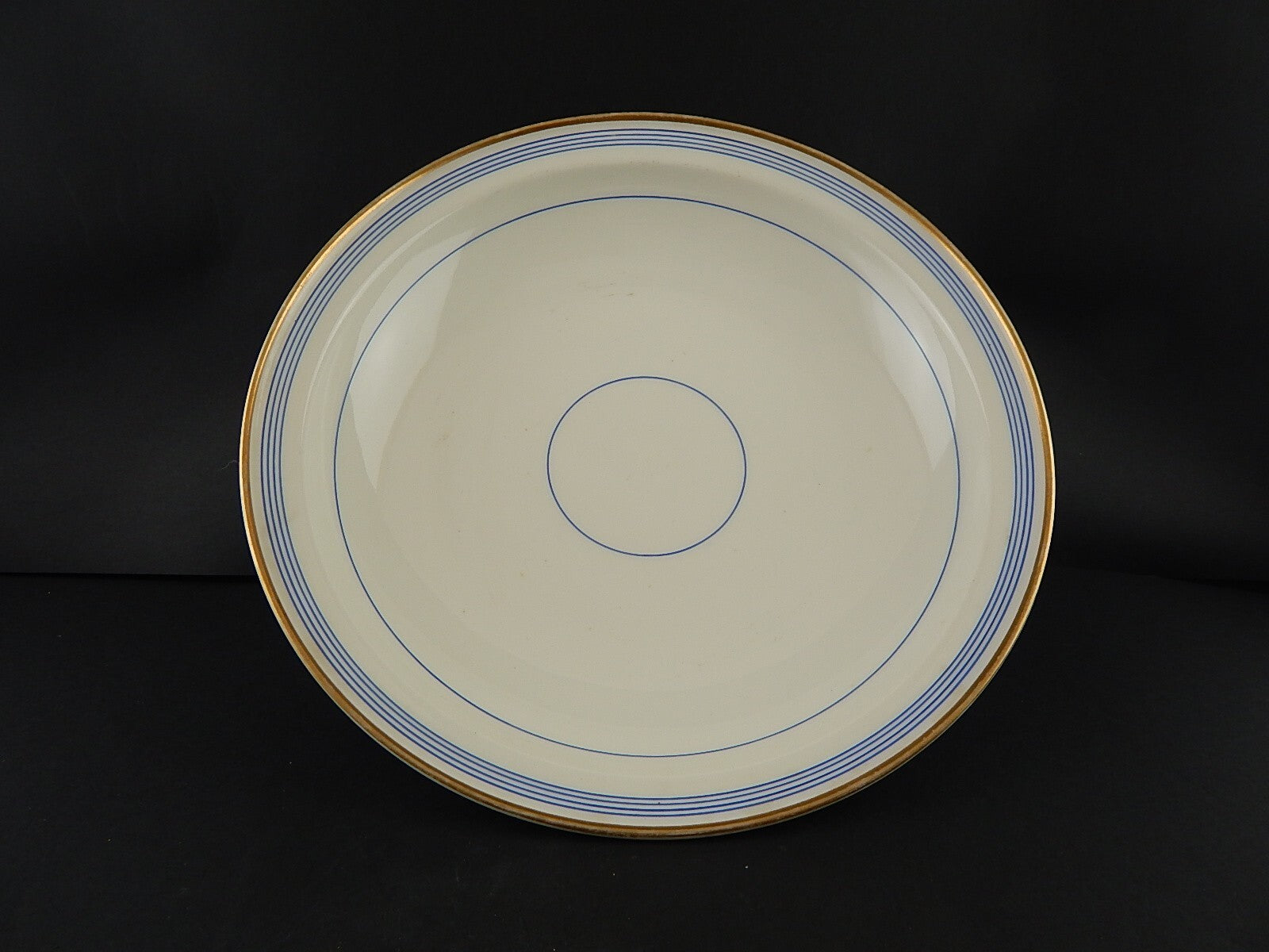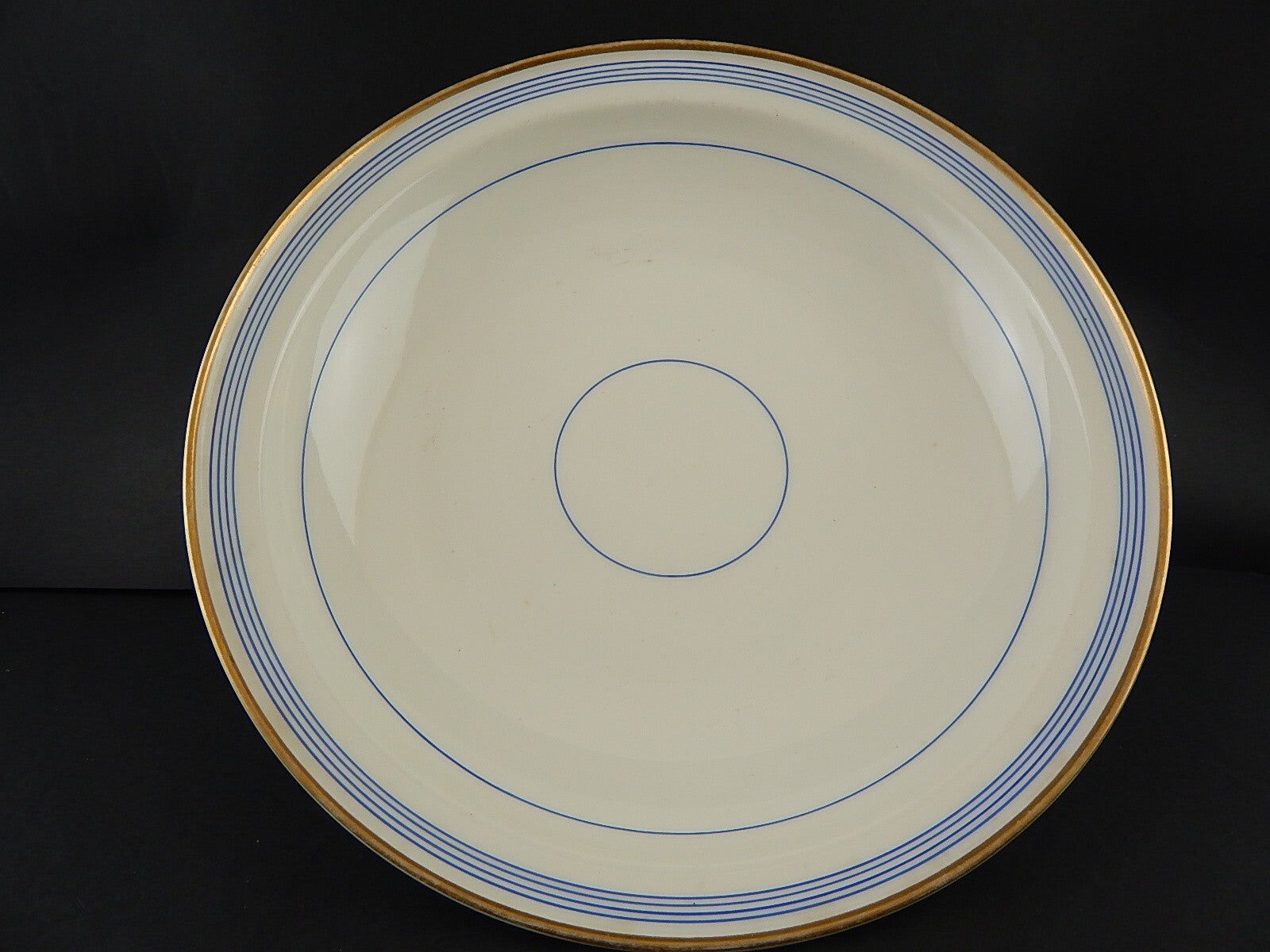 Il centrotavola in porcellana bianca decorato a mano in blu cobalto e oro zecchino è in buone condizioni e misura 34 cm di diametro e 7 cm di altezza