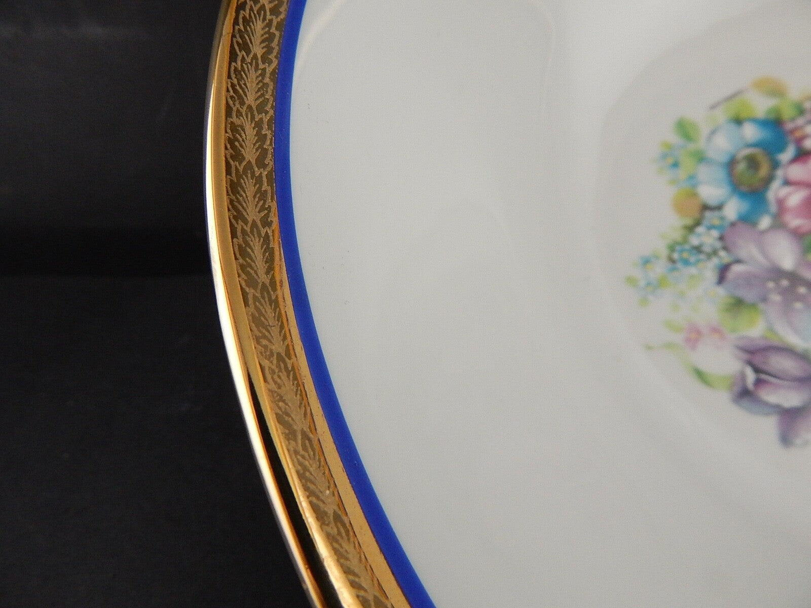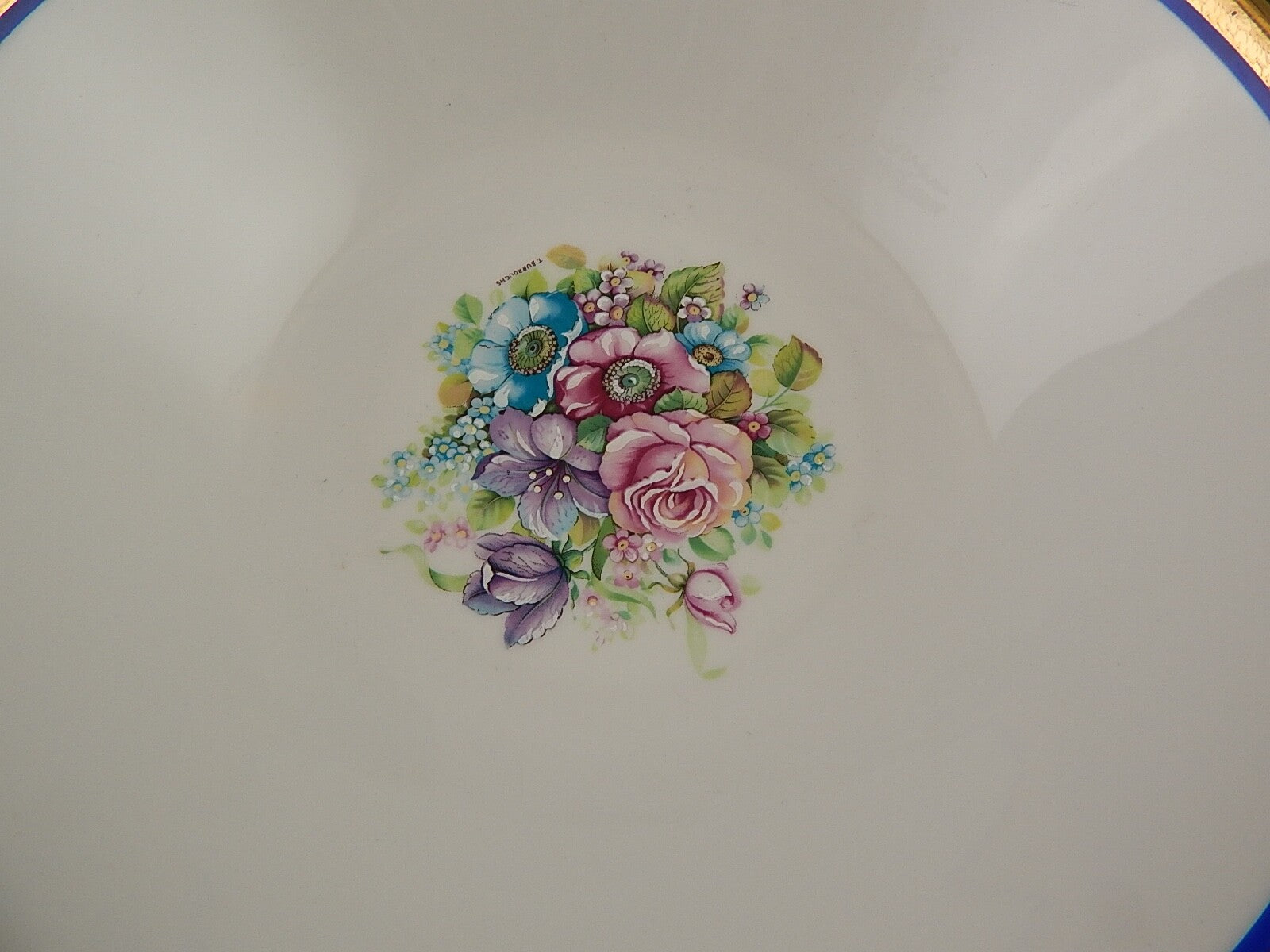 L'insalatiera in porcellana di colore bianco è elegantemente decorata in blu cobalto e oro zecchino e centralmente decorata a mano dall'artista T. Burroughs