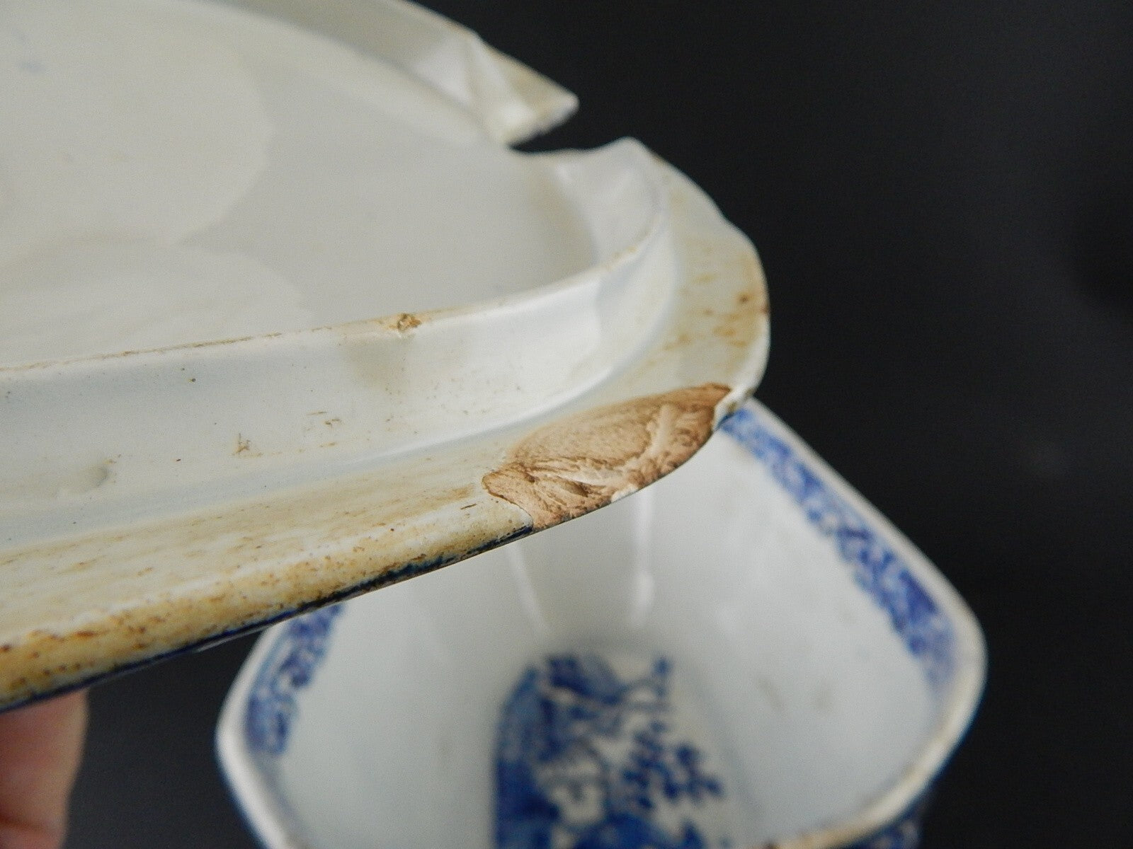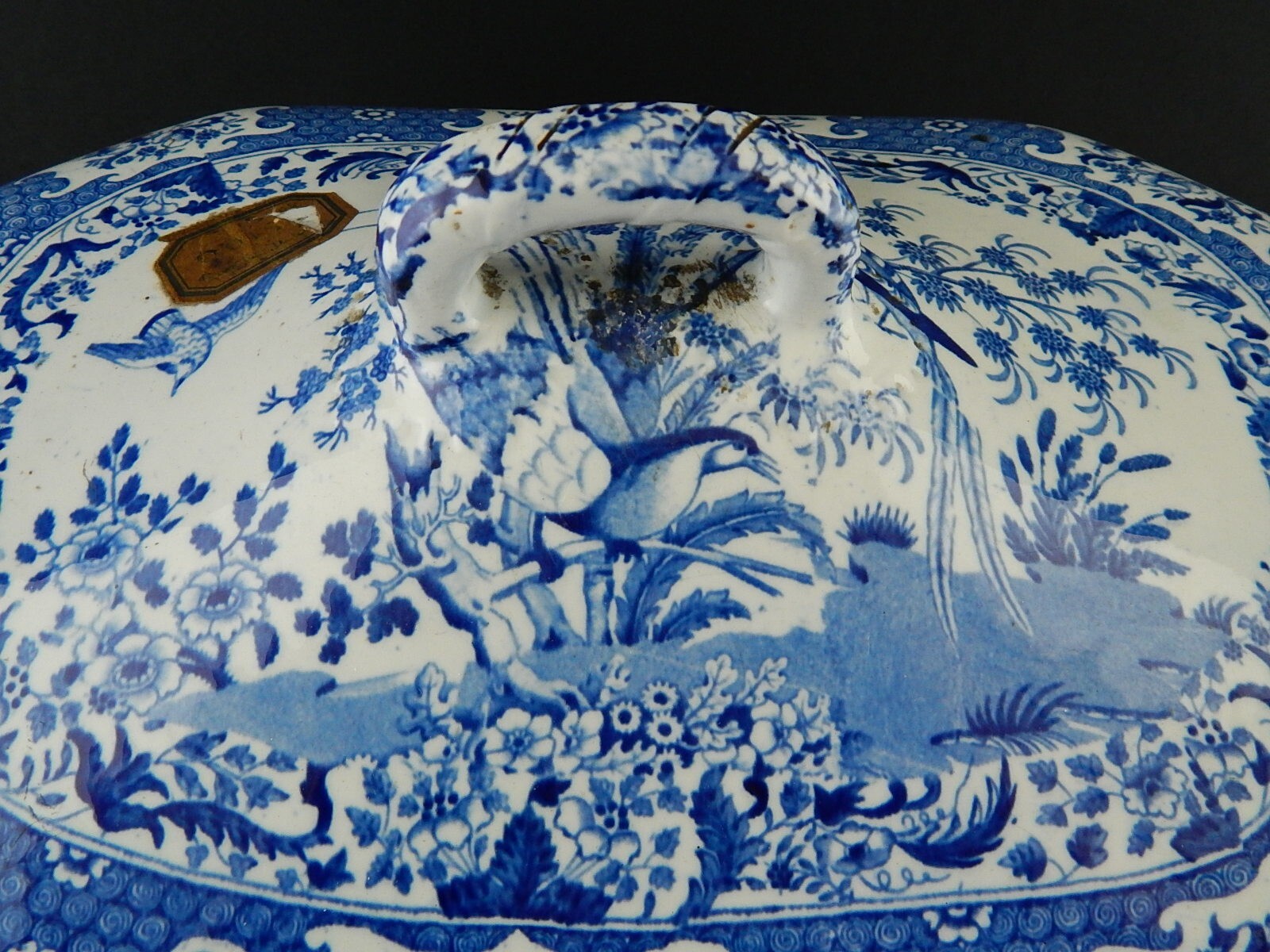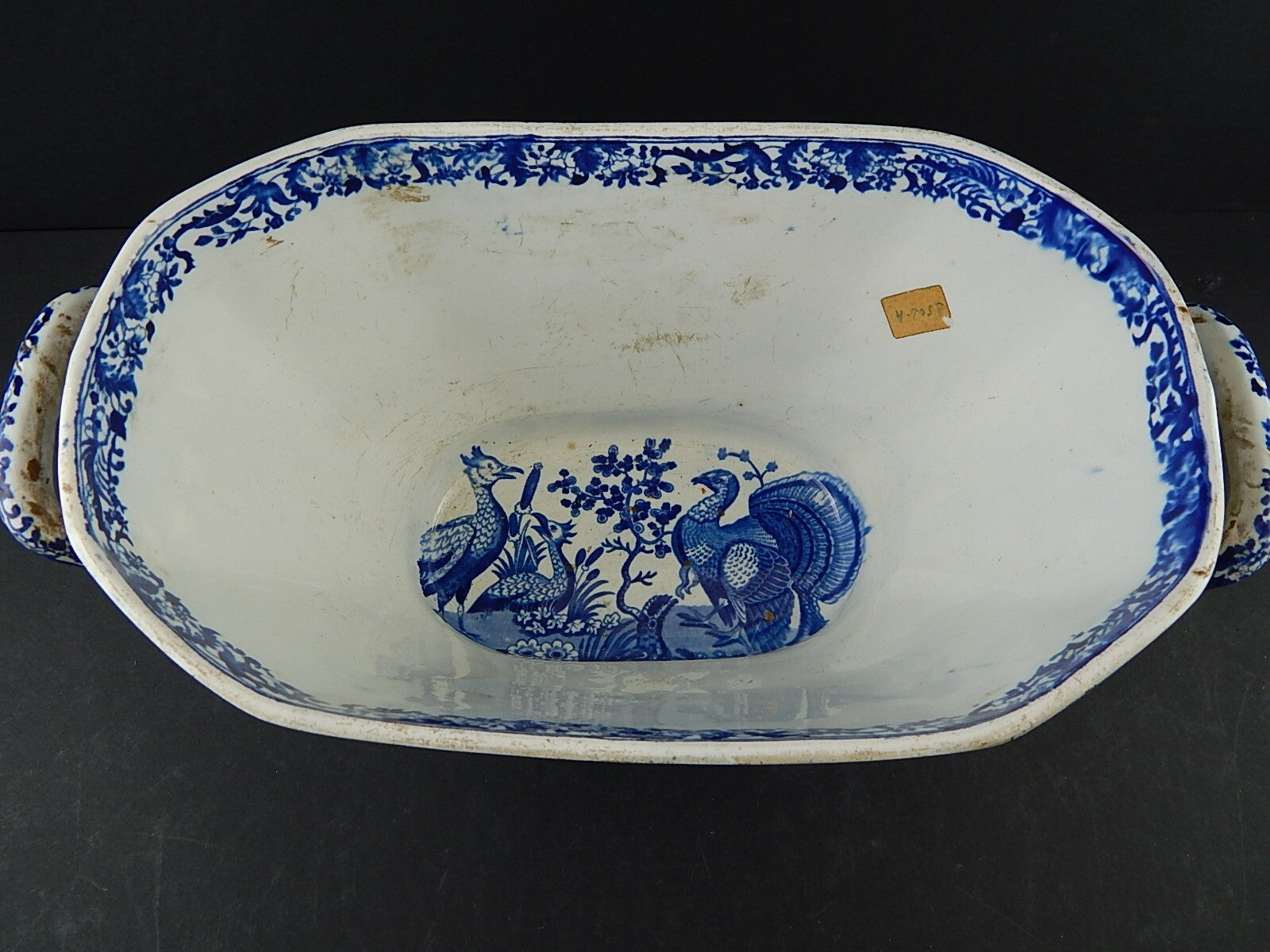 La zuppiera decorata con la tecnica dello transferware in blu cobalto misura 30 x 19,5 cm., 36 cm da manico a manico e 22,5 cm di altezza