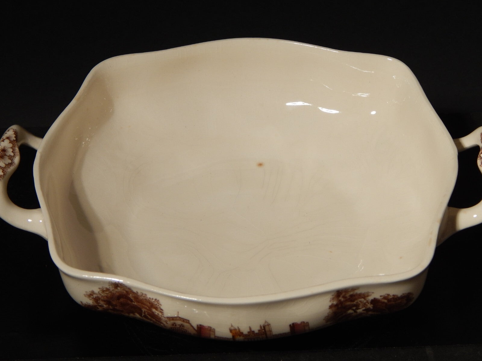 La legumiera stampata a mano, raffigurante Hampton Court Palace misura 22 x 19,5 cm e 12 cm di altezza, 26,5 cm da manico a manico, come si può vedere dalle foto presenta cavillatura