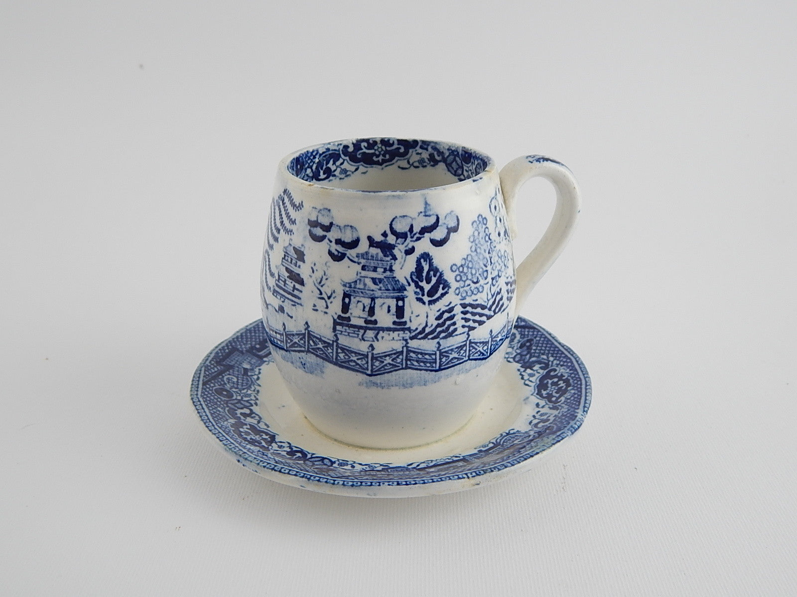 In questa inserzione viene presentata un'antica mostardiera di ceramica inglese con decoro Willow risalente alla metà del 1800.