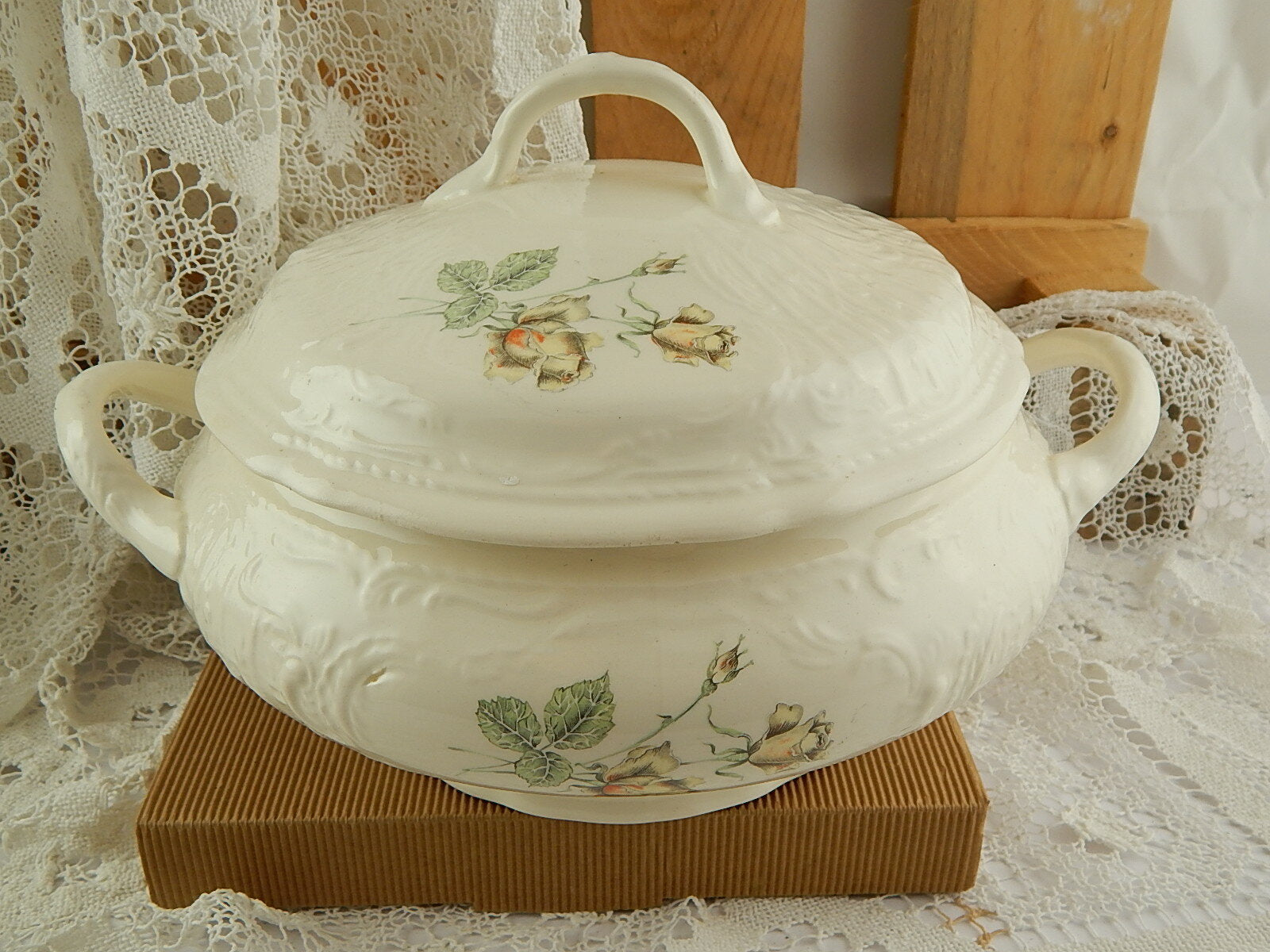 In questa inserzione viene presentata un'antica zuppiera realizzata nella prima metà del 1900 dalla rinomata manifattura Americana Imperial Crown Ivory Stone