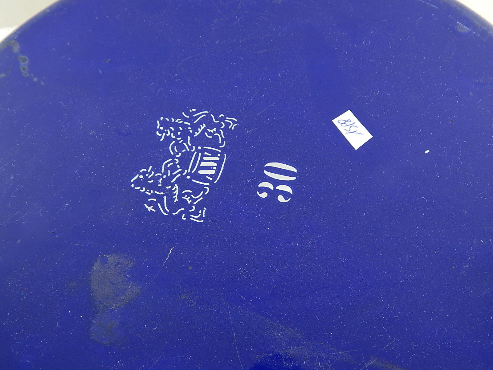 ANTICA PADELLA CON COPERCHIO LATTA METALLO SMALTATA BIANCA E BLU 2 LEONI BASSANO