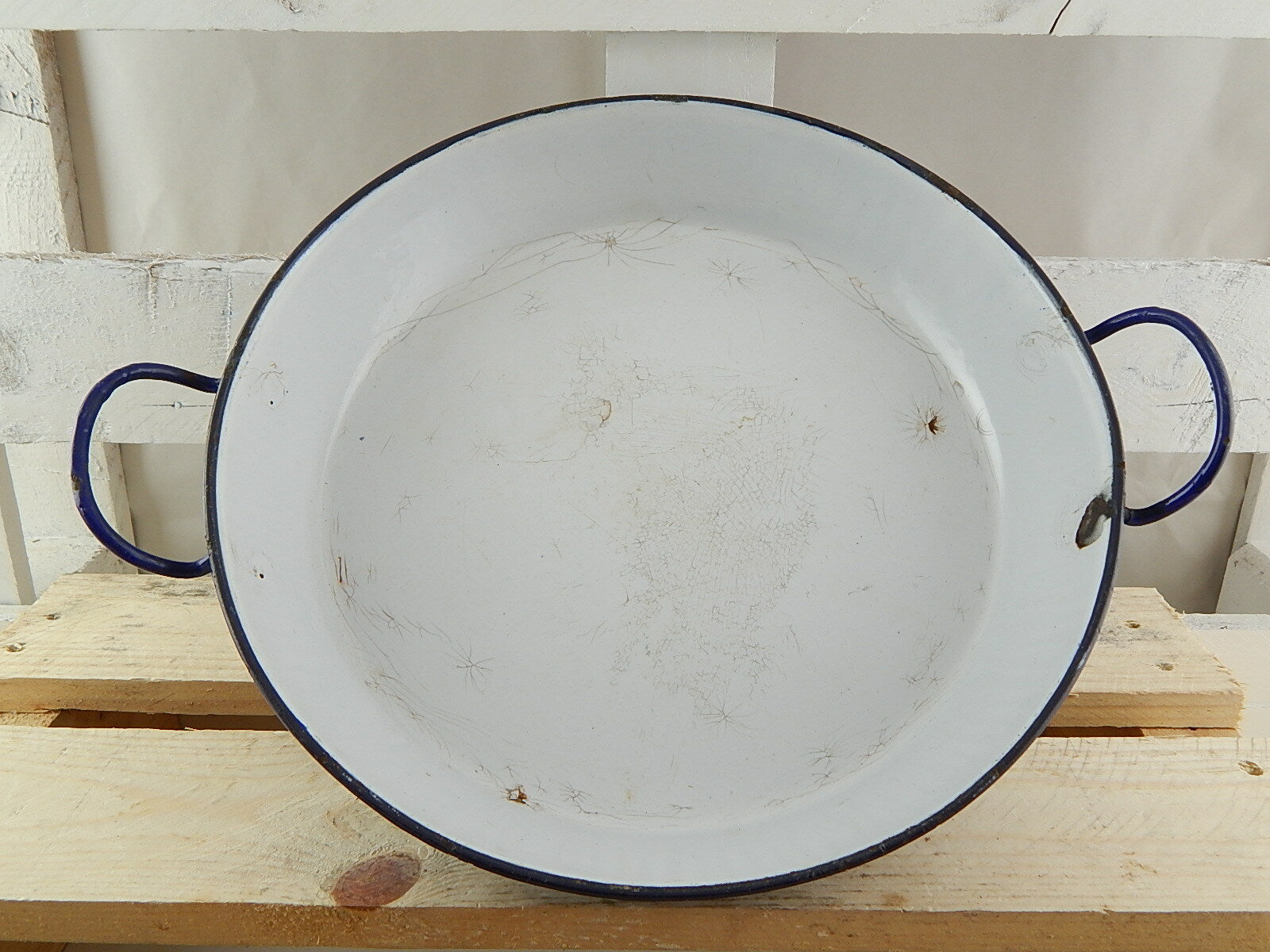 In questa inserzione viene presentato un antica padella in metallo smaltato che misura 30 cm. di diametro, da manico a manico 37 cm e 5 cm. di altezza