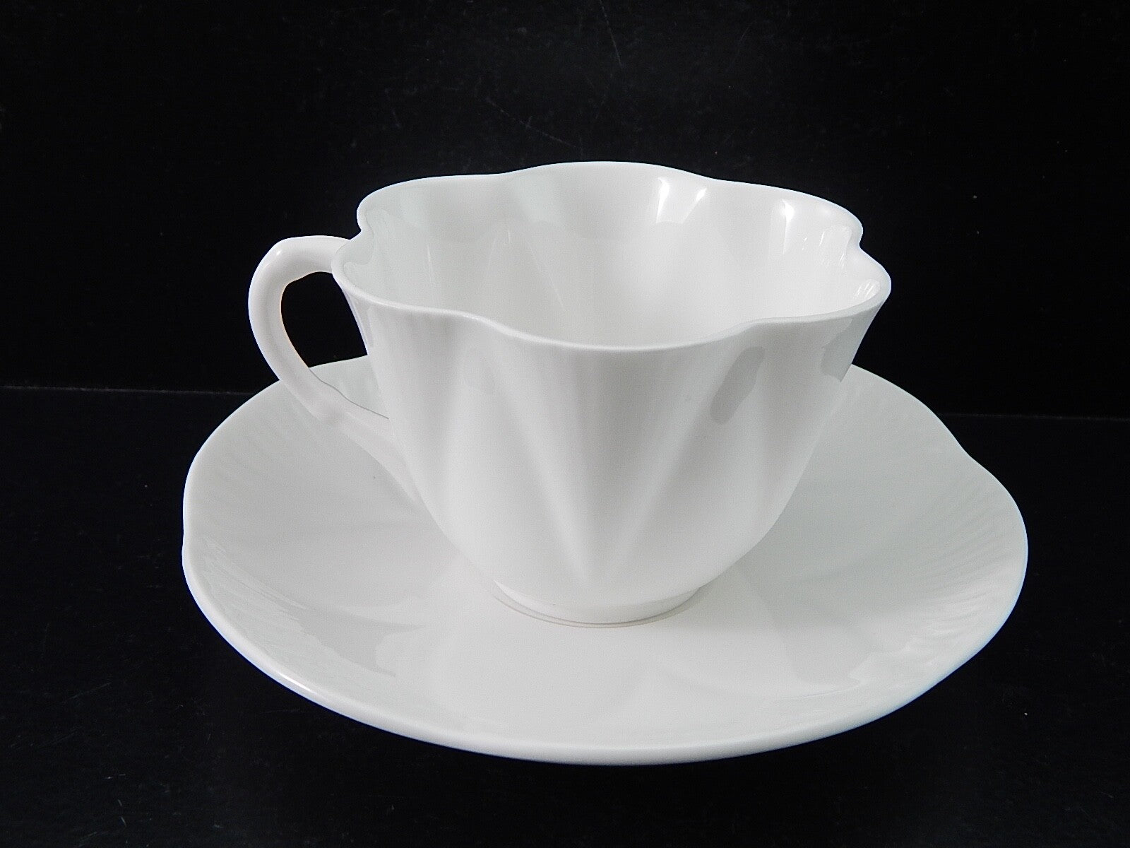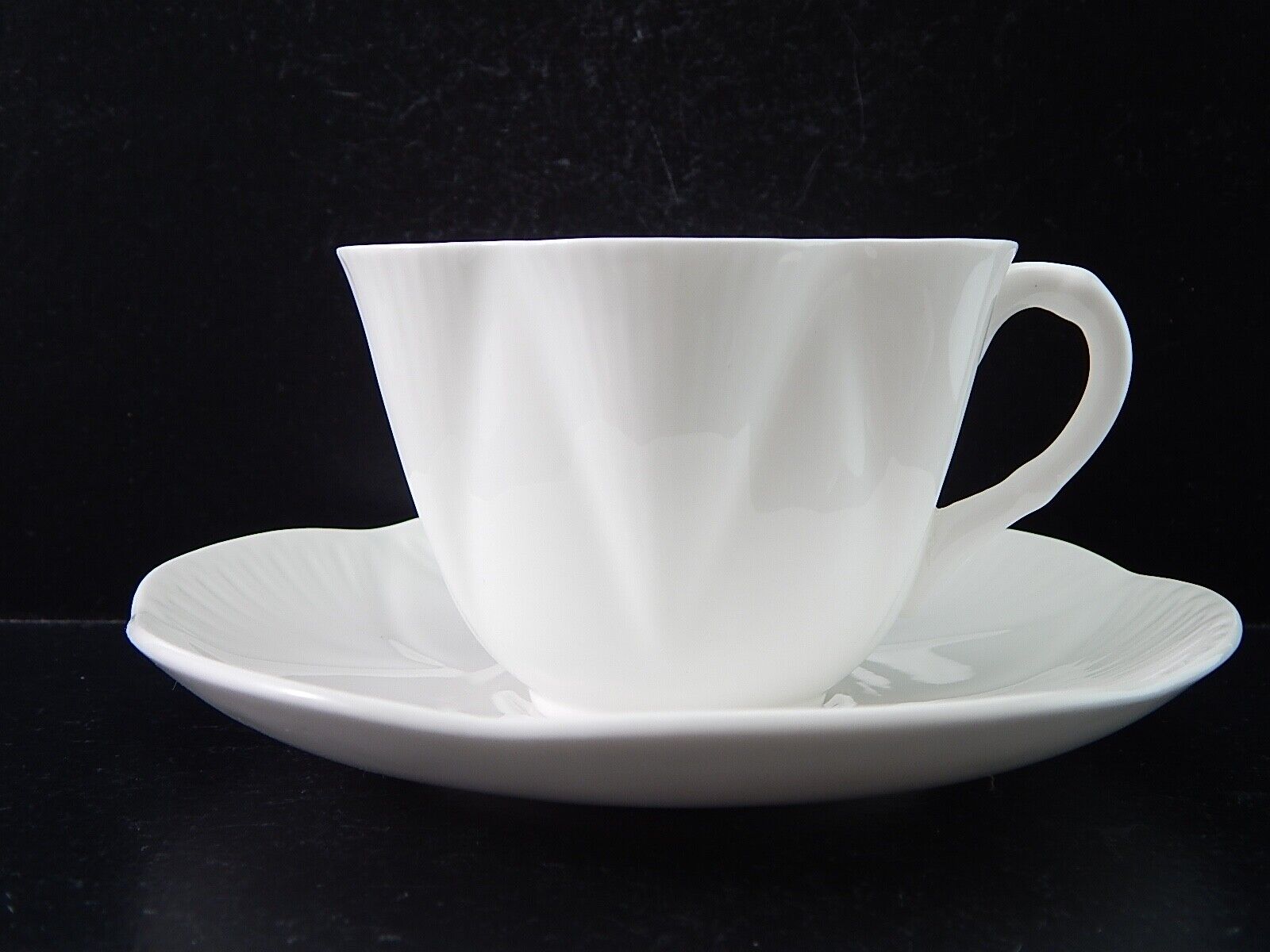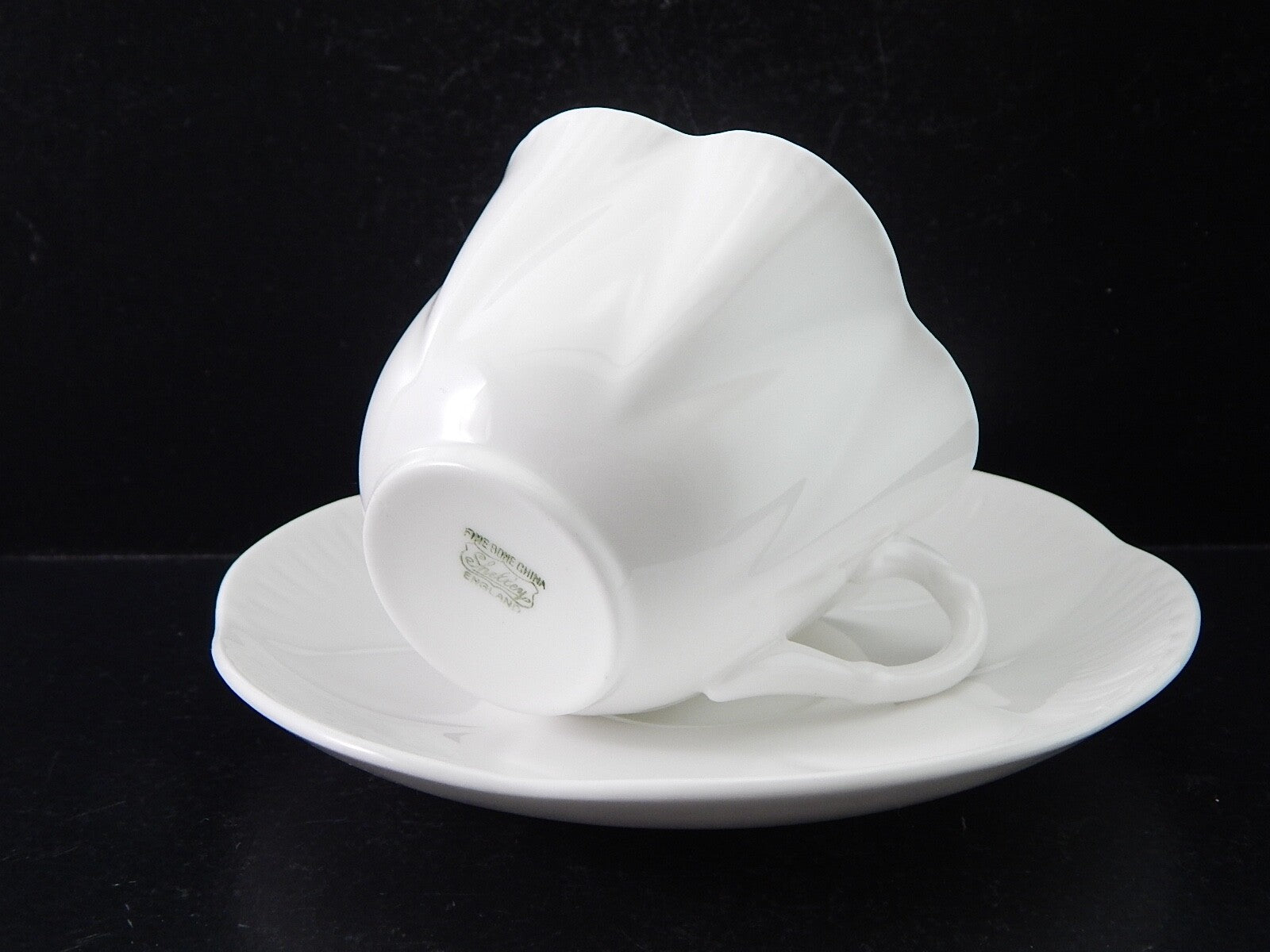 In questa inserzione viene presentata una tazza da tè con relativo piattino di fine porcellana bianca realizzati dalla famosa manifattura inglese Shelley Fine Bone China