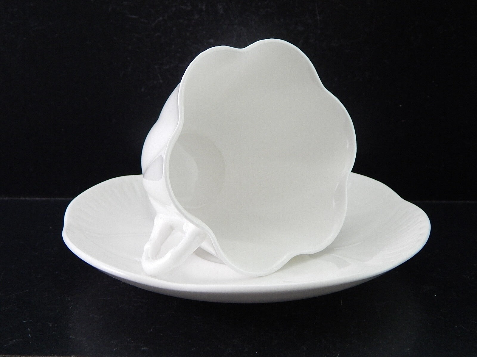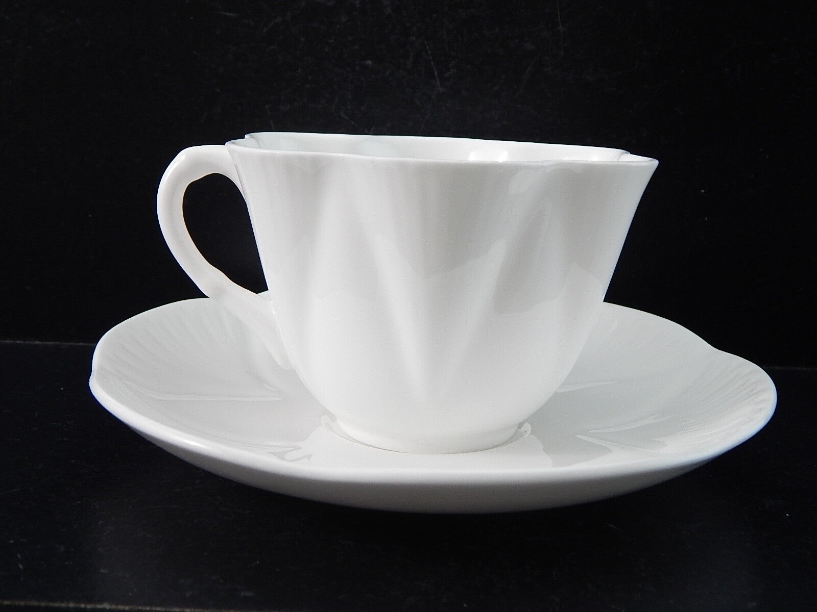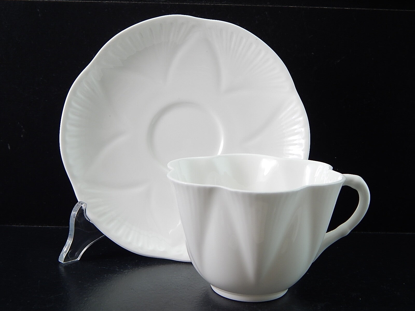 In questa inserzione viene presentata una tazza da tè con relativo piattino di fine porcellana bianca realizzati dalla famosa manifattura inglese Shelley Fine Bone China