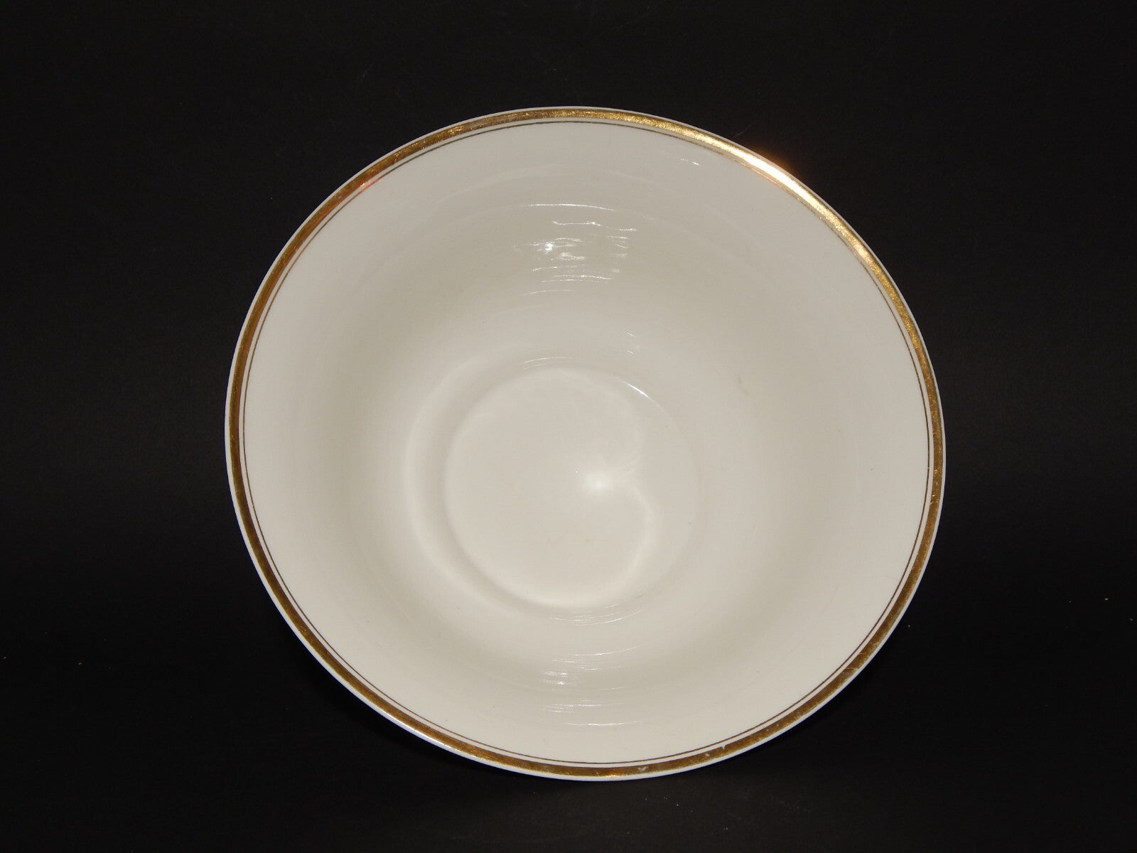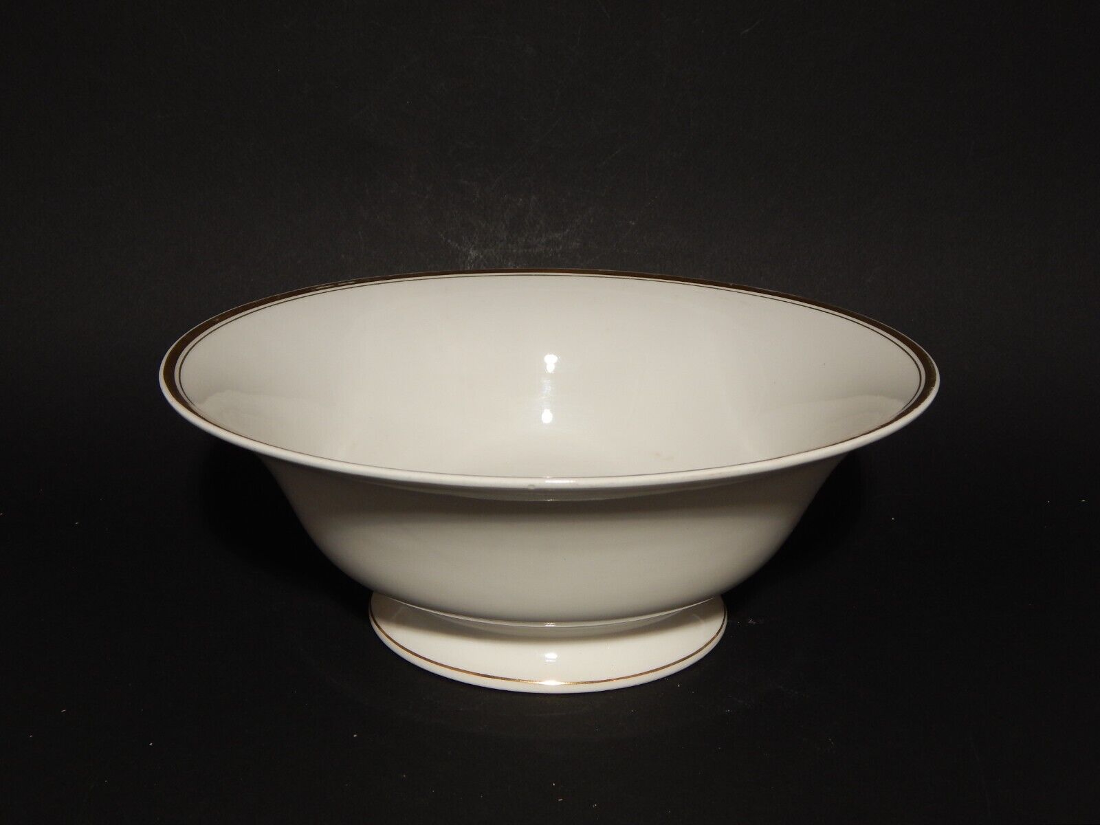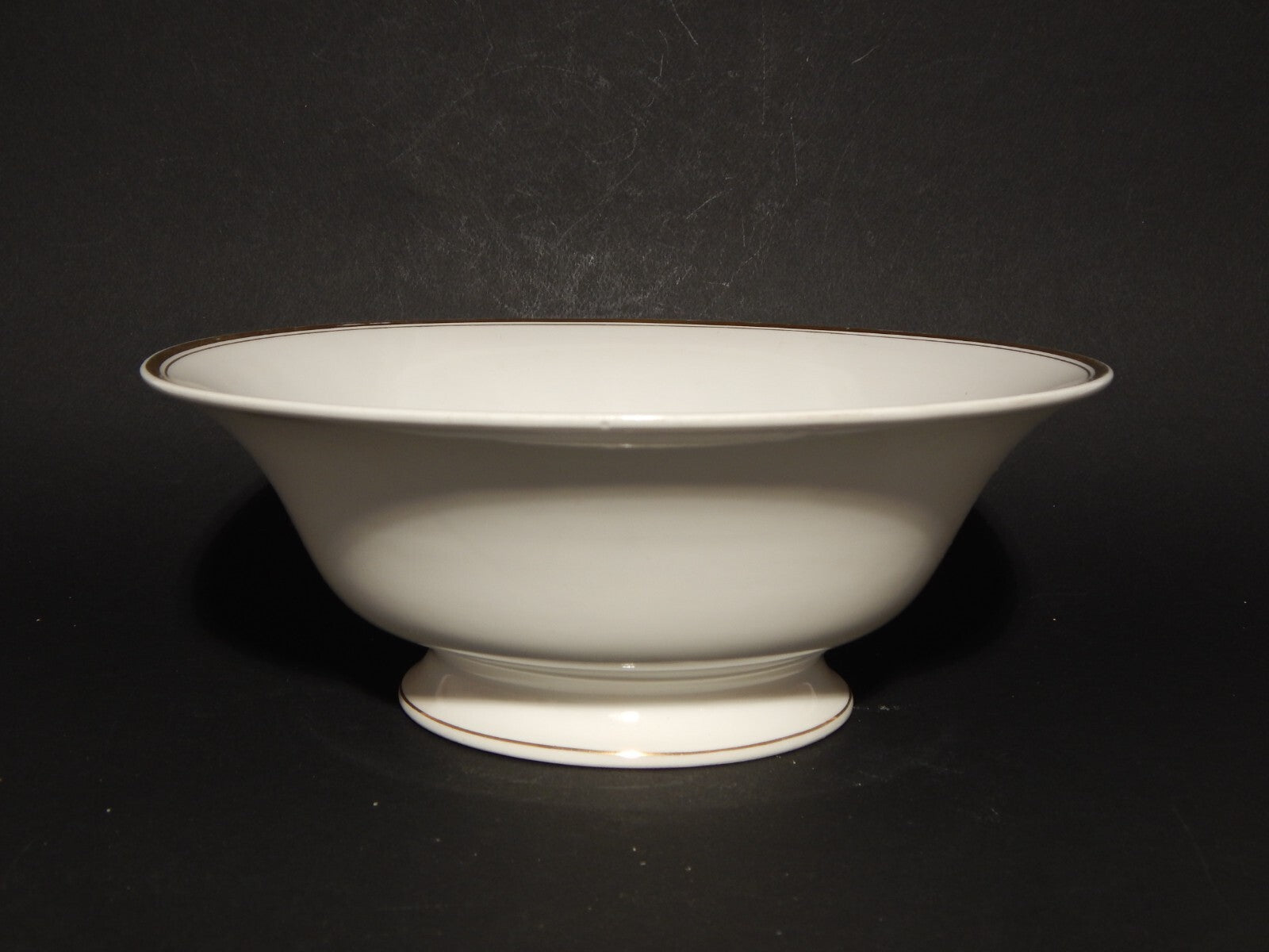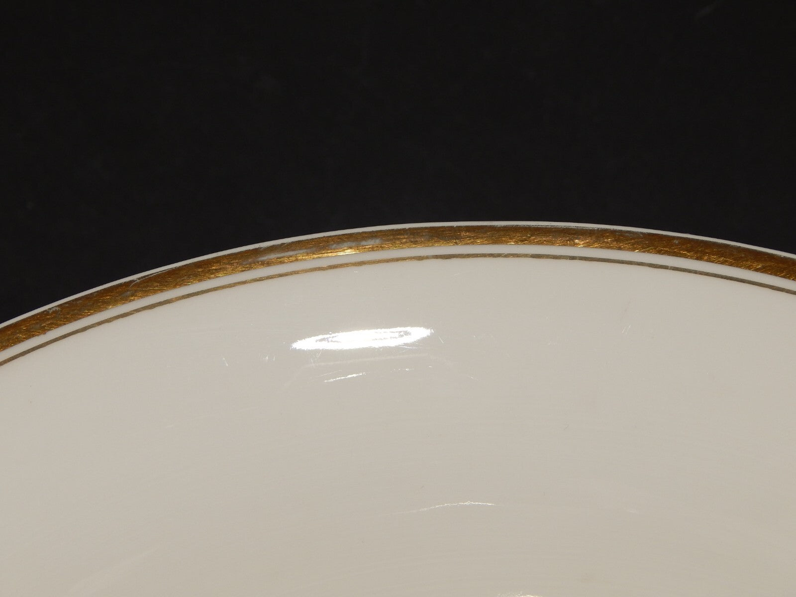 La fruttiera in porcellana bianca è decorata a mano in oro zecchino e misura 28,5 cm di diametro e 11 cm di altezza, come si può vedere dalle foto presenta una fellure sotto la base
