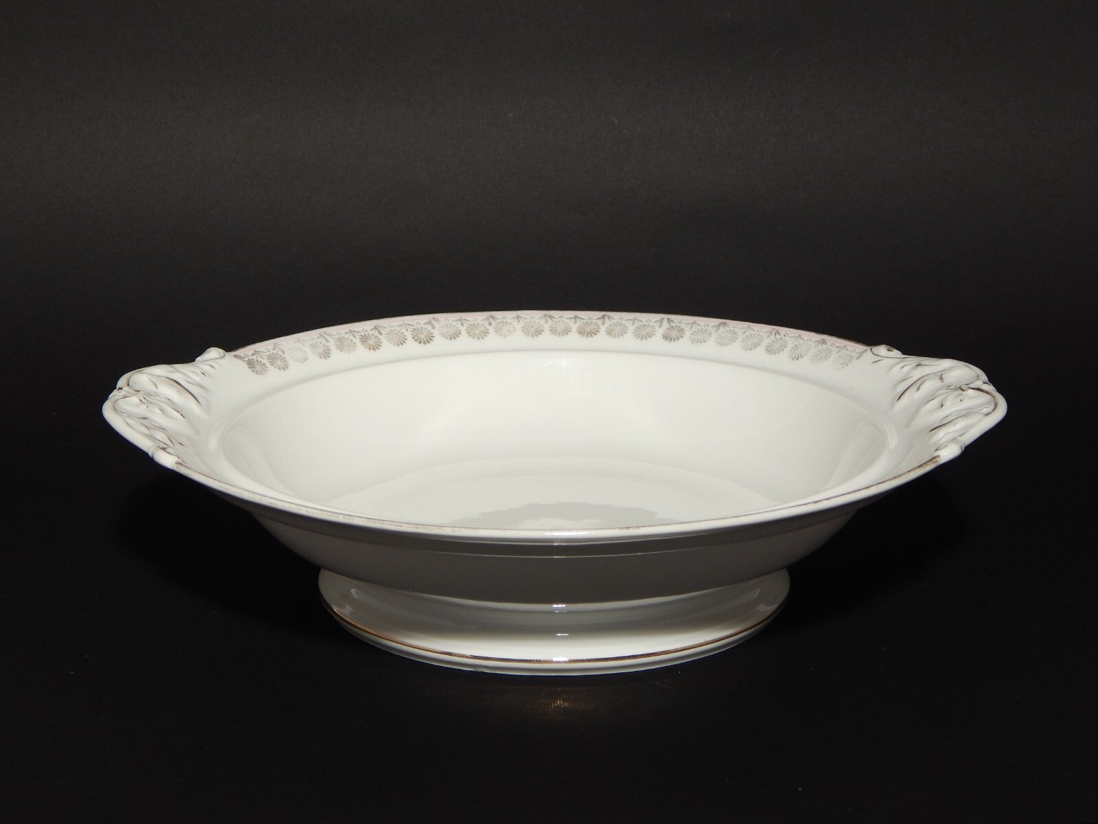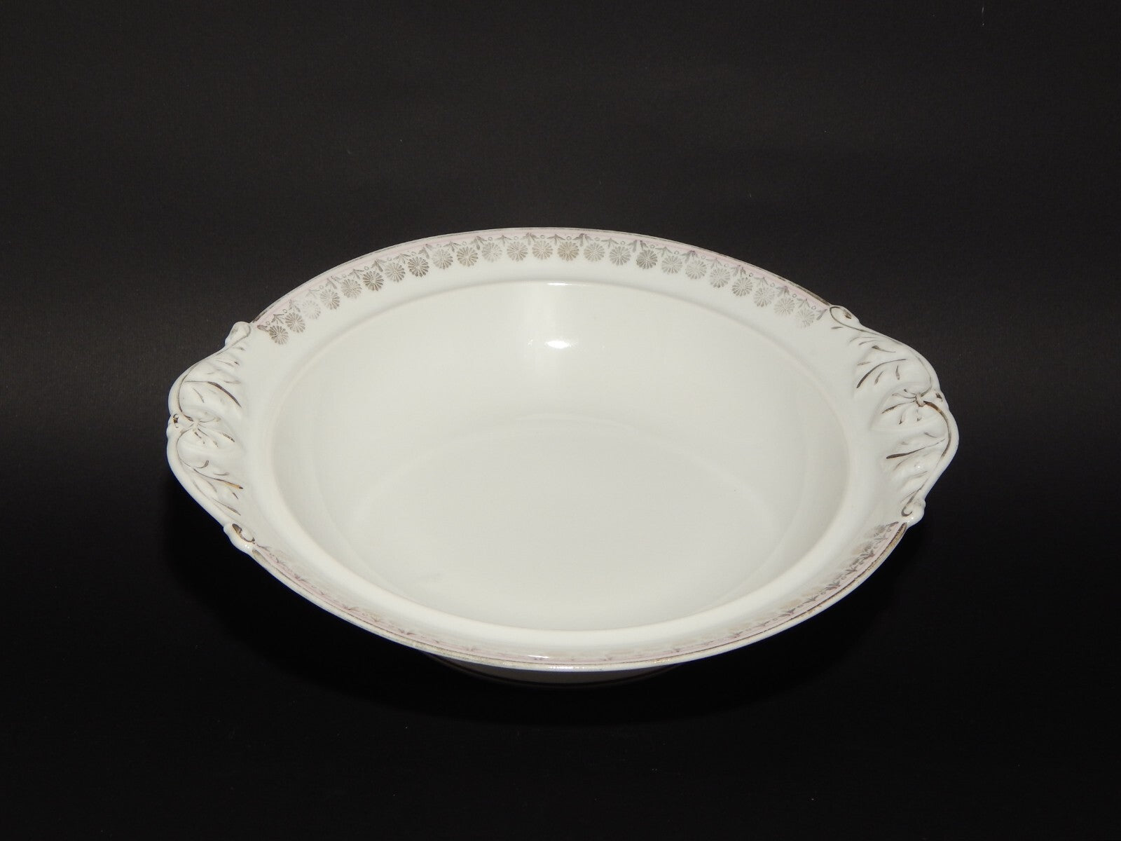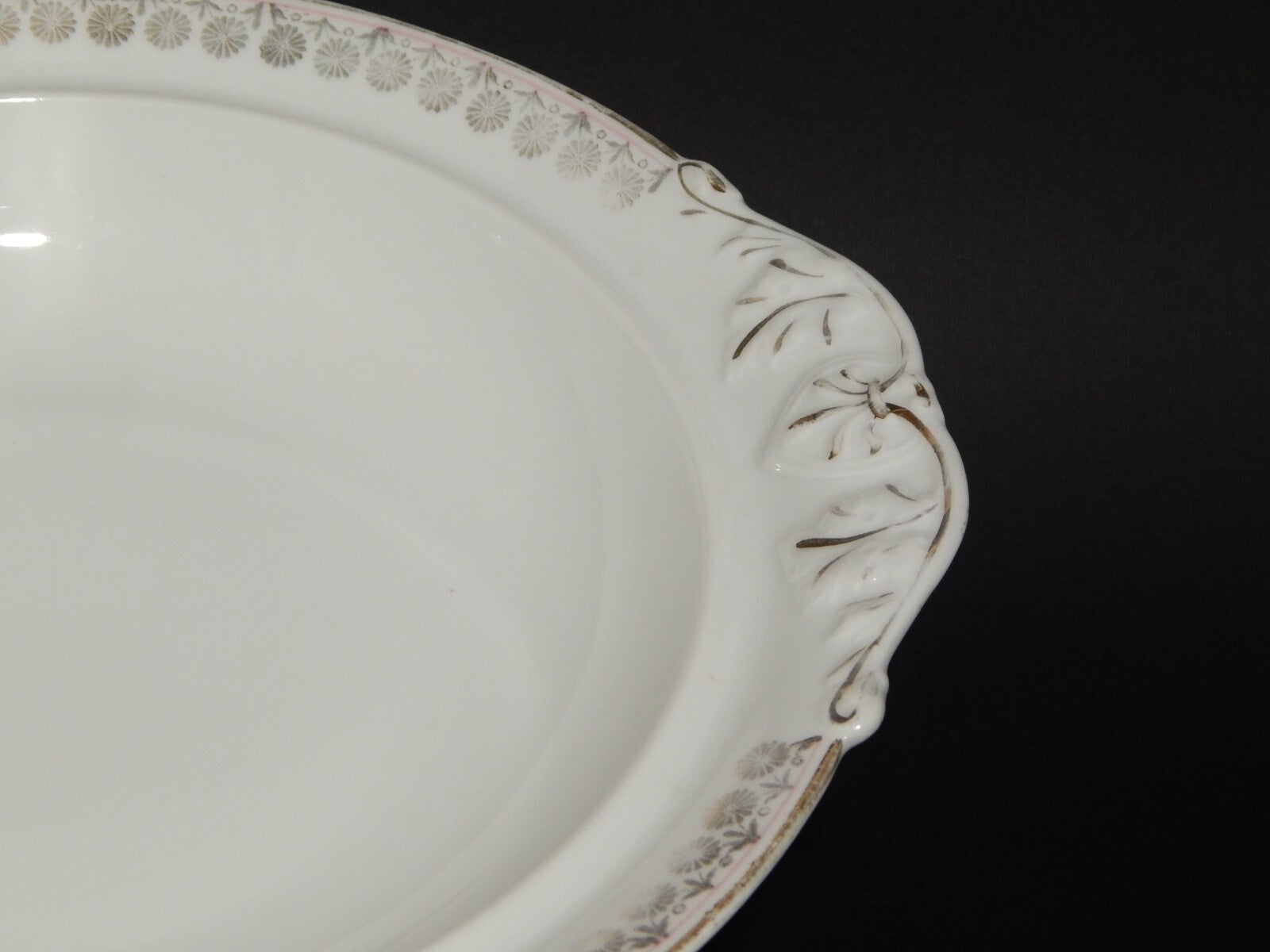 La legumiera in porcellana bianca è decorata a mano con un profilo rosa e disegni in oro zecchino