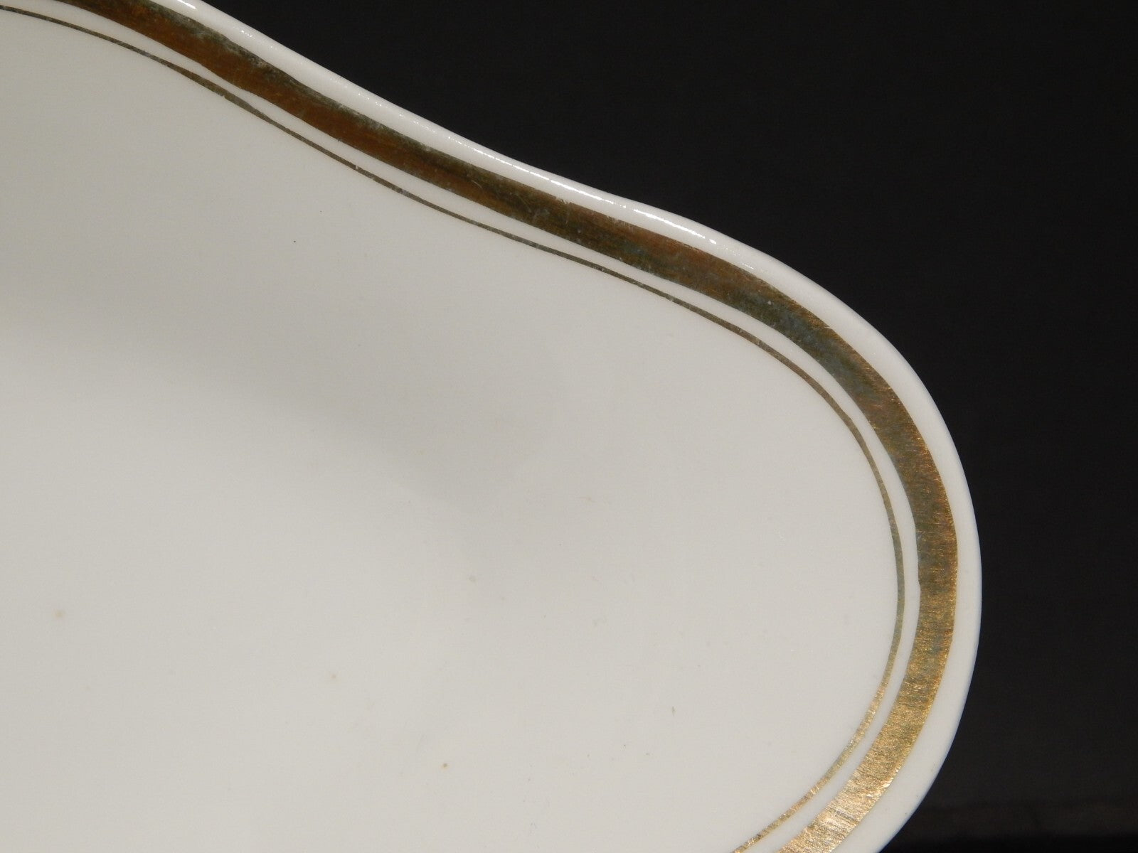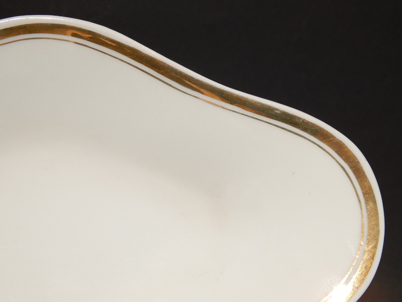 La raviera in porcellana bianca è decorata a mano in oro zecchino e misura 23 x 14,5 cm