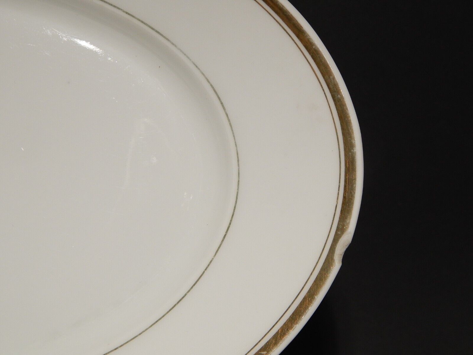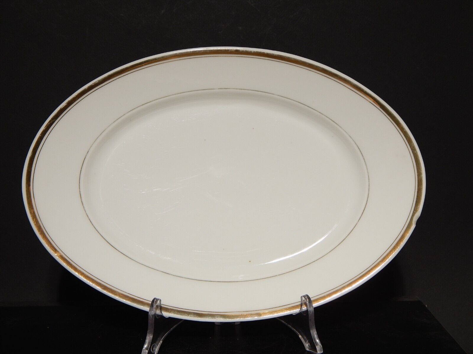 Il vassoio in porcellana bianca è decorato a mano in oro zecchino e misura 29,5 x 20,5 cm, come si può vedere dalle foto presenta una scheggiatura sul bordo