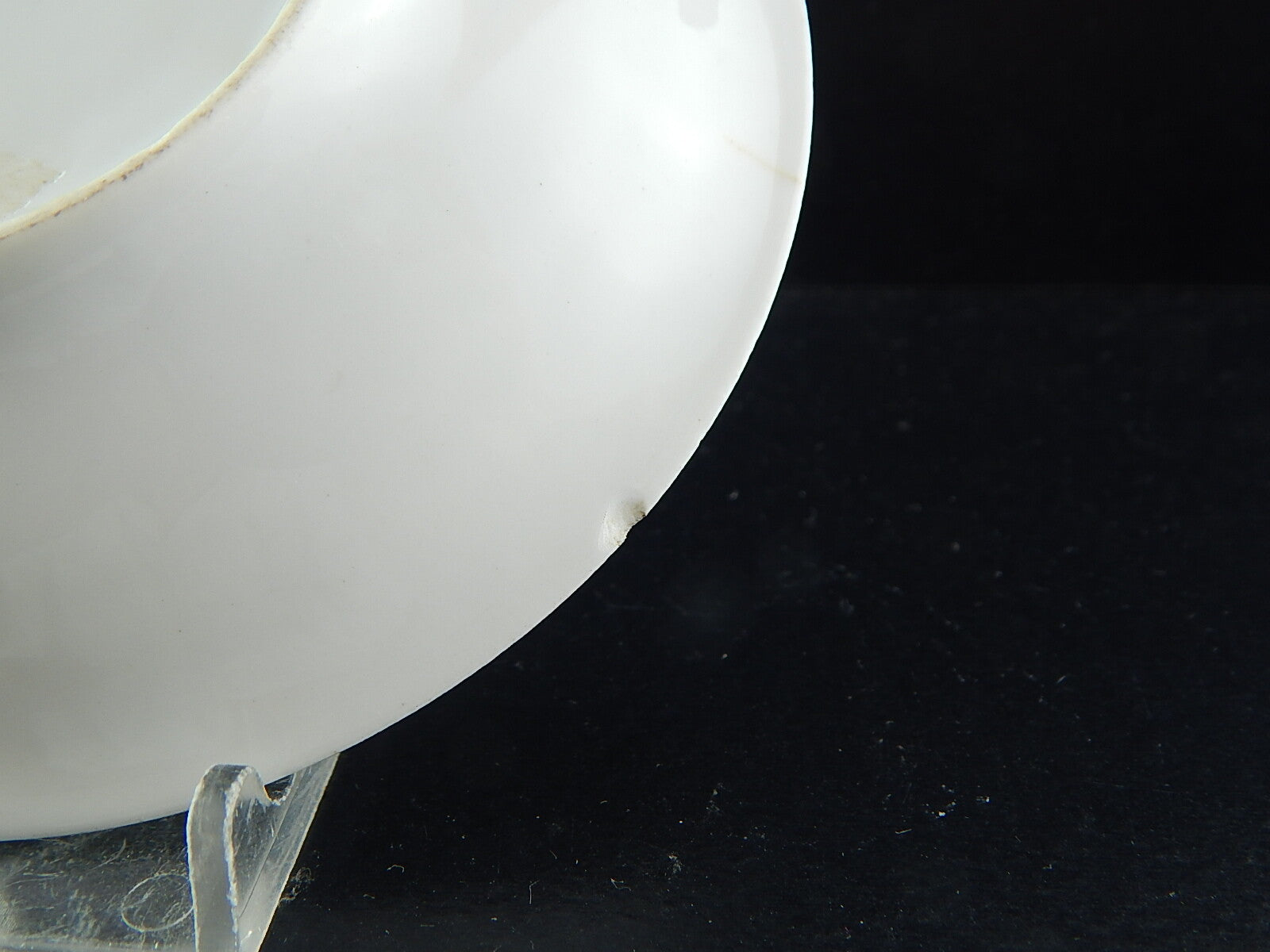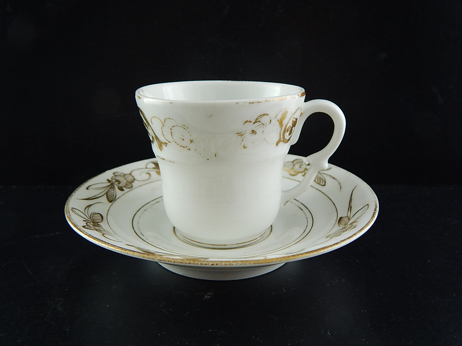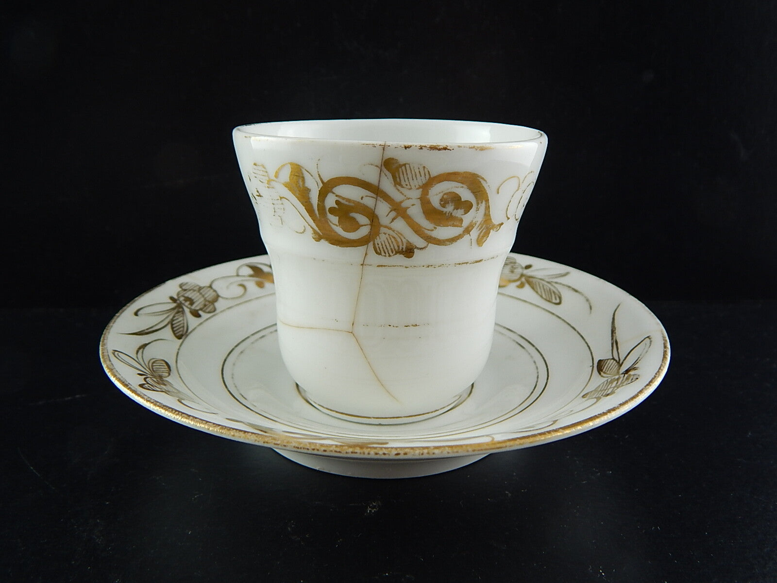 La tazza in porcellana bianca è stata riccamente decorata a mano in oro zecchino, è in buone condizioni e misura 6 cm. di diametro e 6 cm. di altezza, il piattino misura 12 cm di diametro, come si può vedere dalle foto la tazza è danneggiata, il piattino ha una piccola scheggiatura.