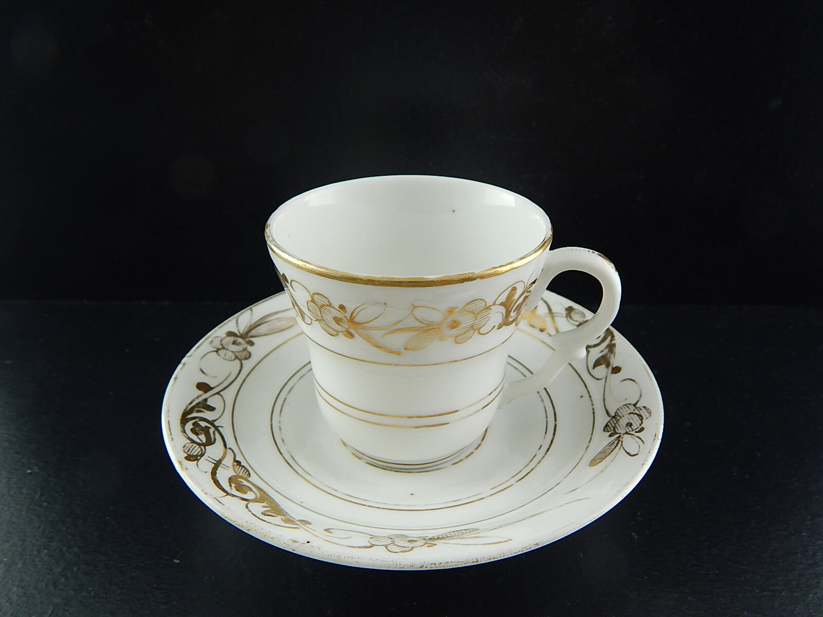 La tazza in porcellana bianca è stata riccamente decorata a mano in oro zecchino, è in buone condizioni e misura 6 cm. di diametro e 6 cm. di altezza, il piattino misura 12 cm di diametro, come si può vedere dalle foto la tazza ha due puntini scuri all’interno, difetti di cottura.