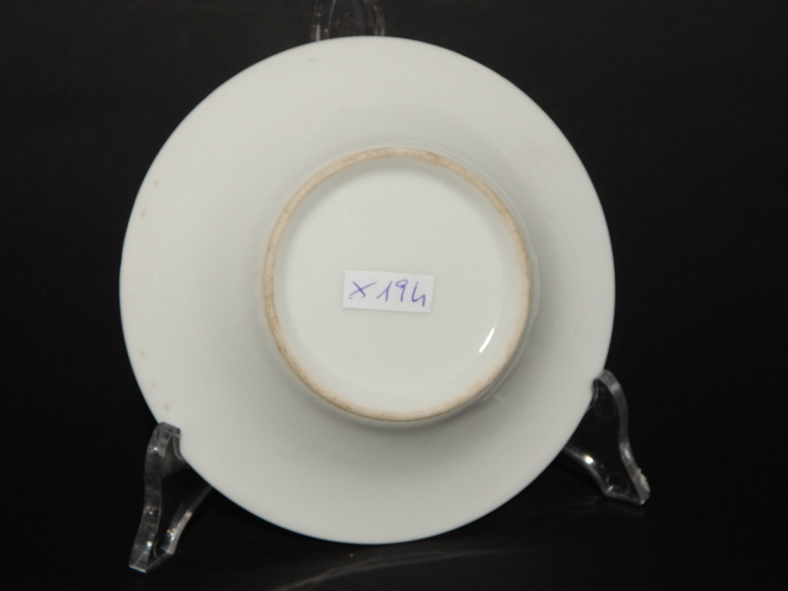 La tazza misura 7,5 cm. di diametro e 6,5 cm. di altezza, il piattino misura 12 cm. di diametro, pur essendo priva di scheggiature e filature presenta qualche segno del tempo come l'oro sbiadito