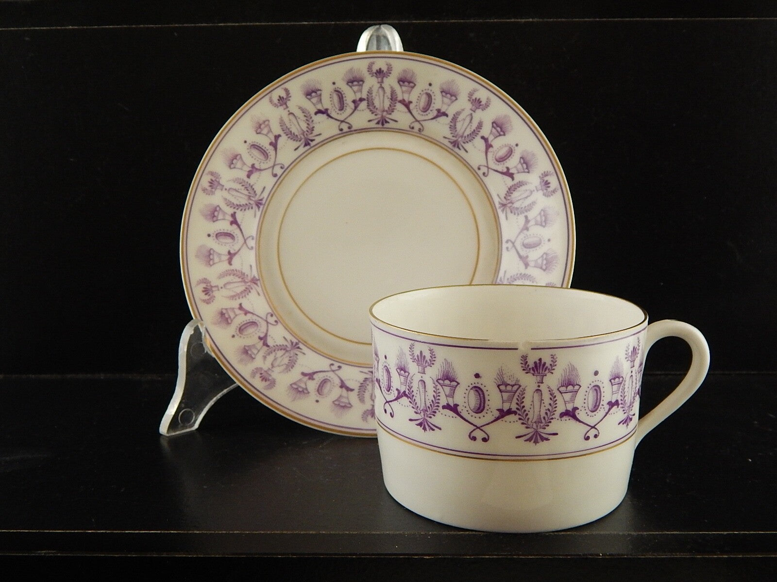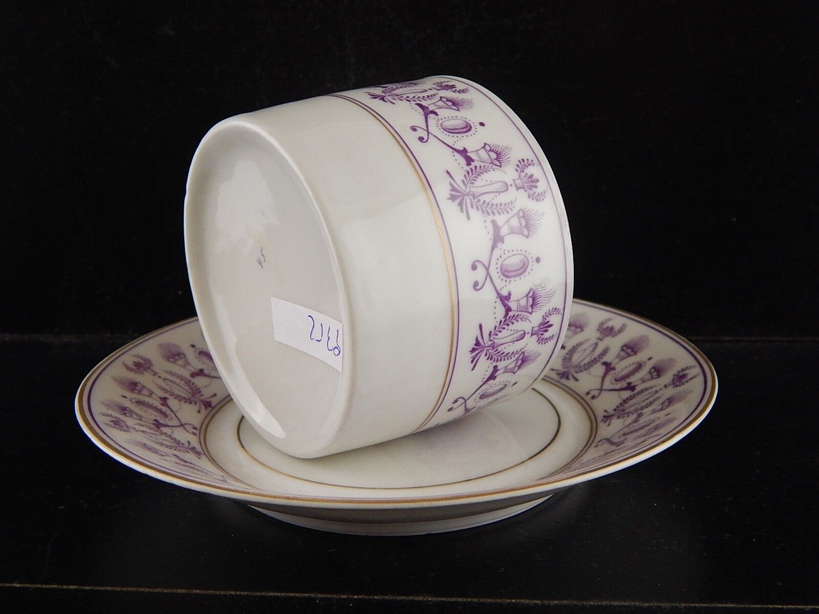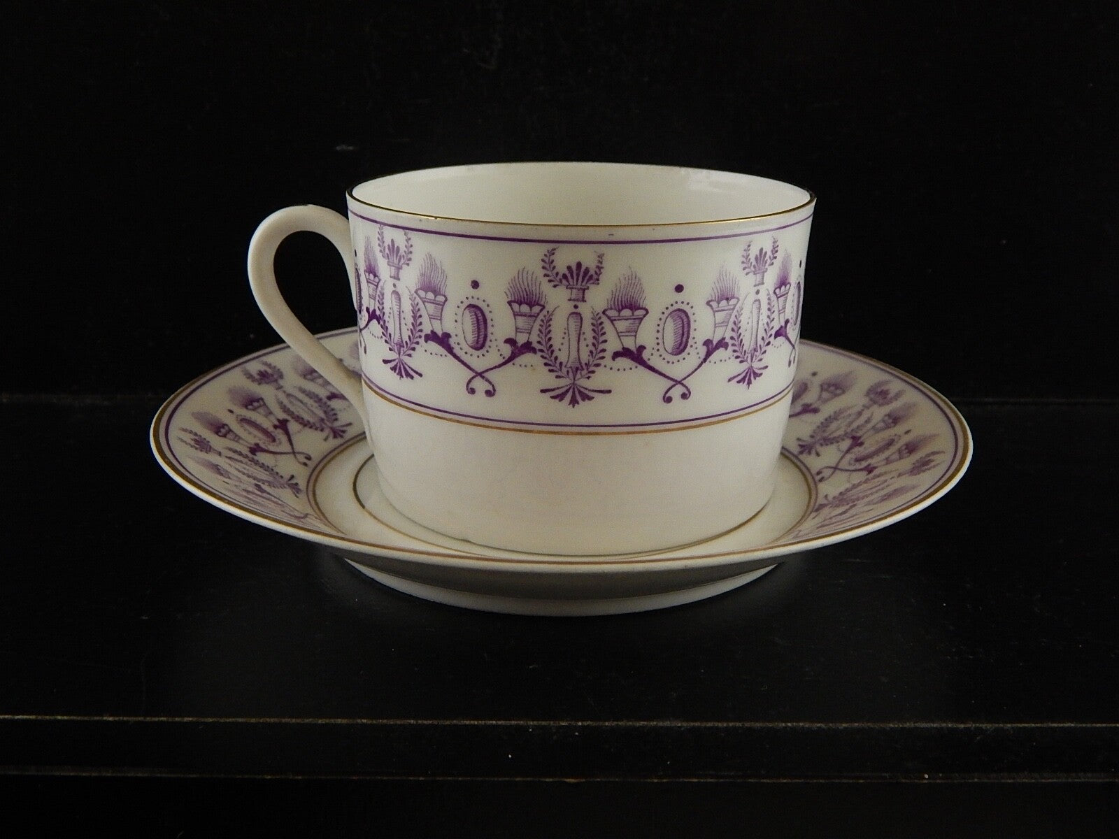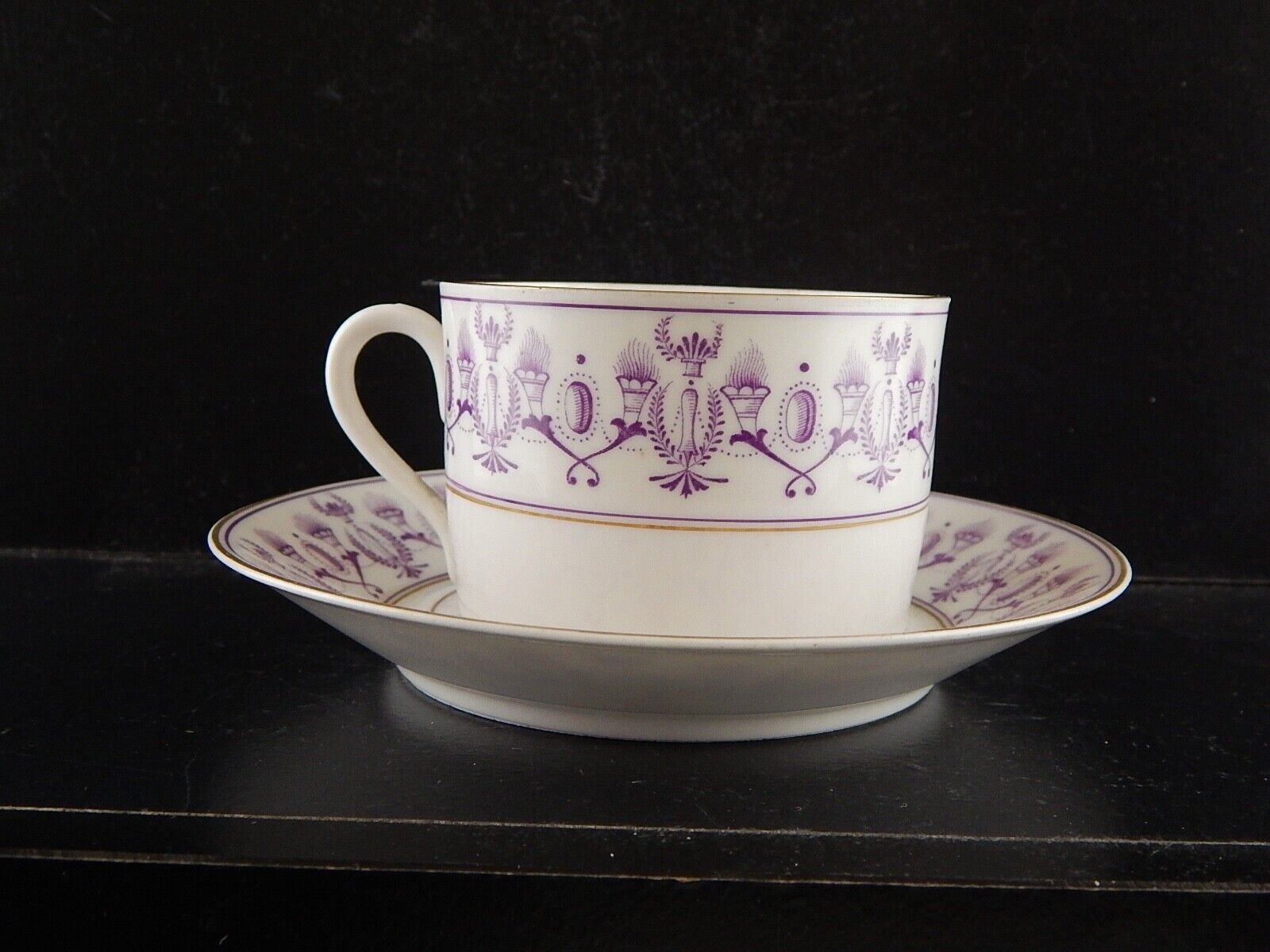 ANTICA PREZIOSA TAZZA TE' STILE IMPERO IN PORCELLANA BIANCA DECORATA VIOLA ORO