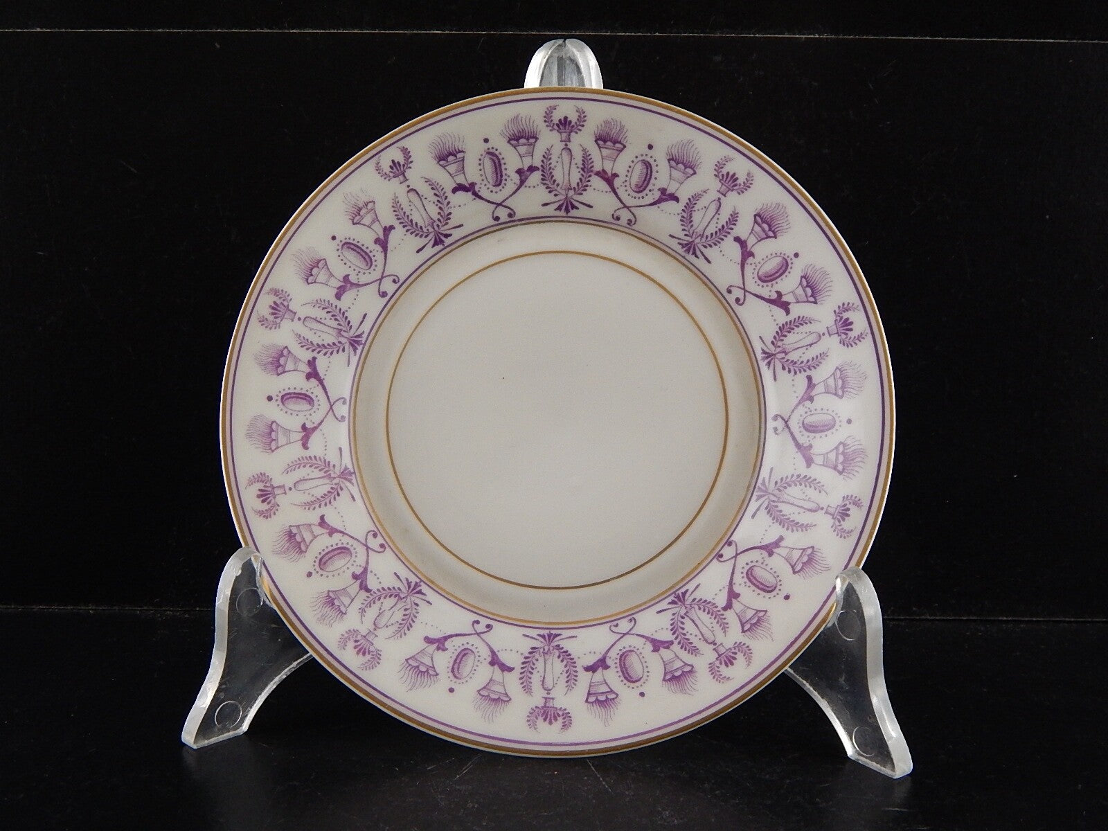 In questa inserzione viene presentata un'antica tazza da tè in stile impero realizzata in porcellana bianca e decorata a mano in viola e oro zecchino