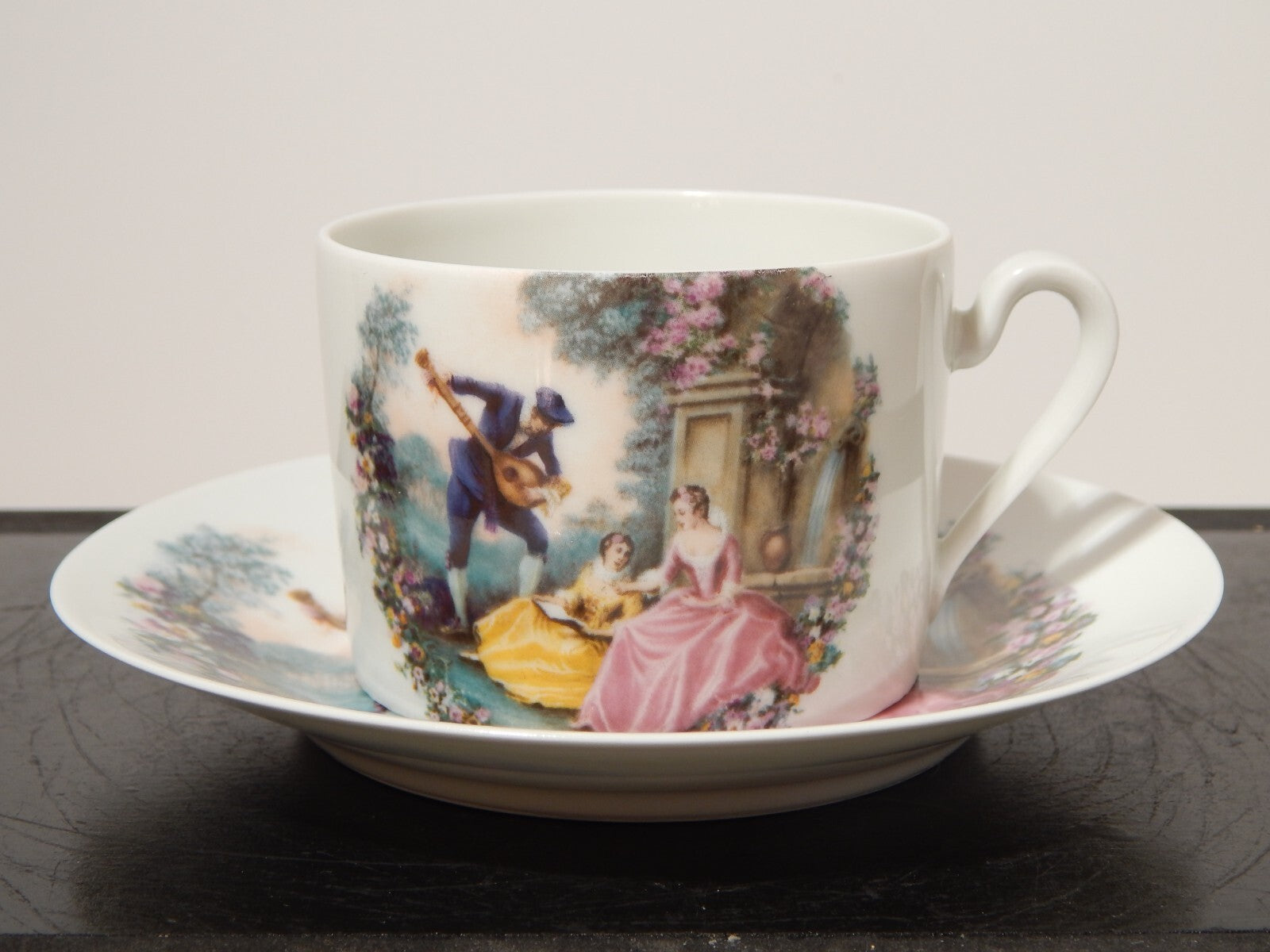 Elegante tazza da tè in autentica porcellana di Limoges completa di piattino abbinato. Un raffinato esempio dell’arte ceramica francese, famosa in tutto il mondo per la sua qualità e la purezza dei materiali. La tazza presenta una linea classica ed è decorata con la riproduzione di una scena galante
