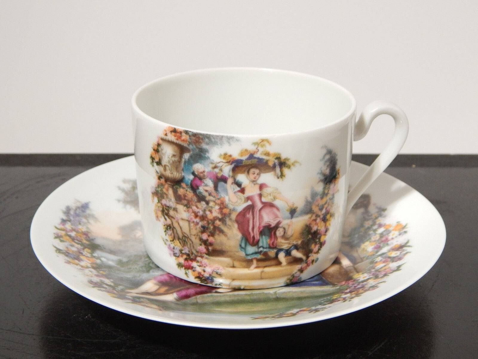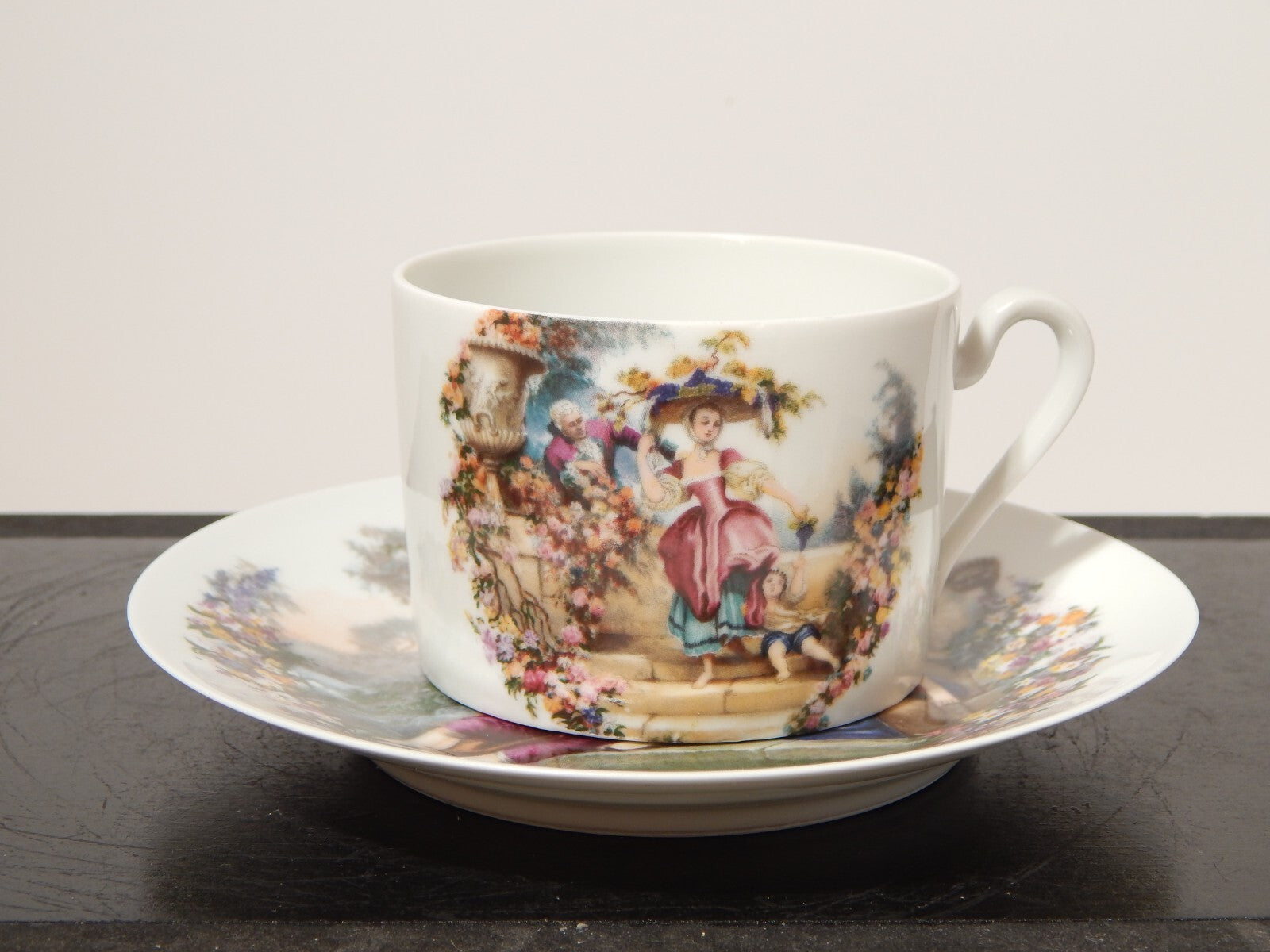 Elegante tazza da tè in autentica porcellana di Limoges completa di piattino abbinato. Un raffinato esempio dell’arte ceramica francese, famosa in tutto il mondo per la sua qualità e la purezza dei materiali. La tazza presenta una linea classica ed è decorata con la riproduzione di una scena galante