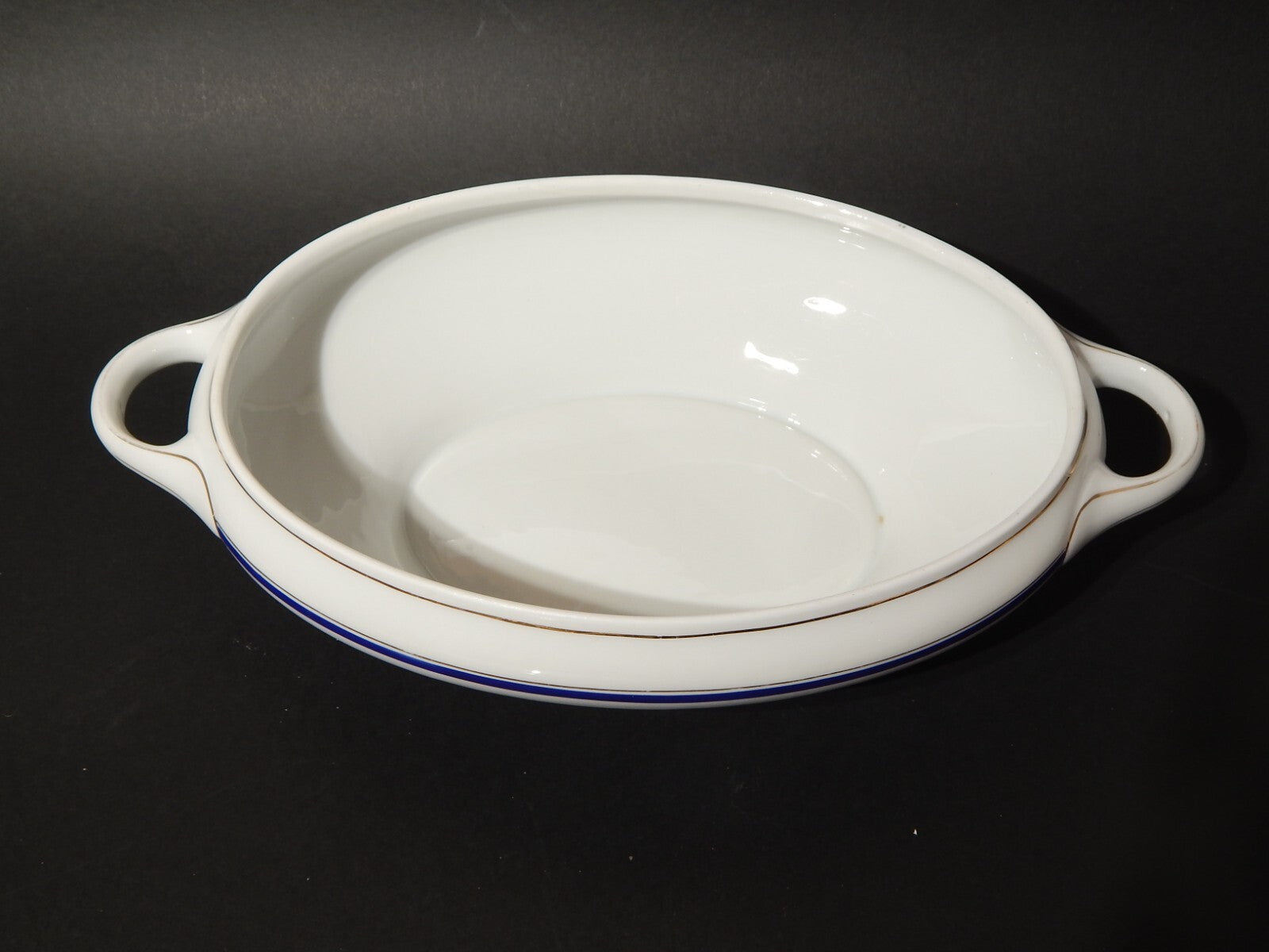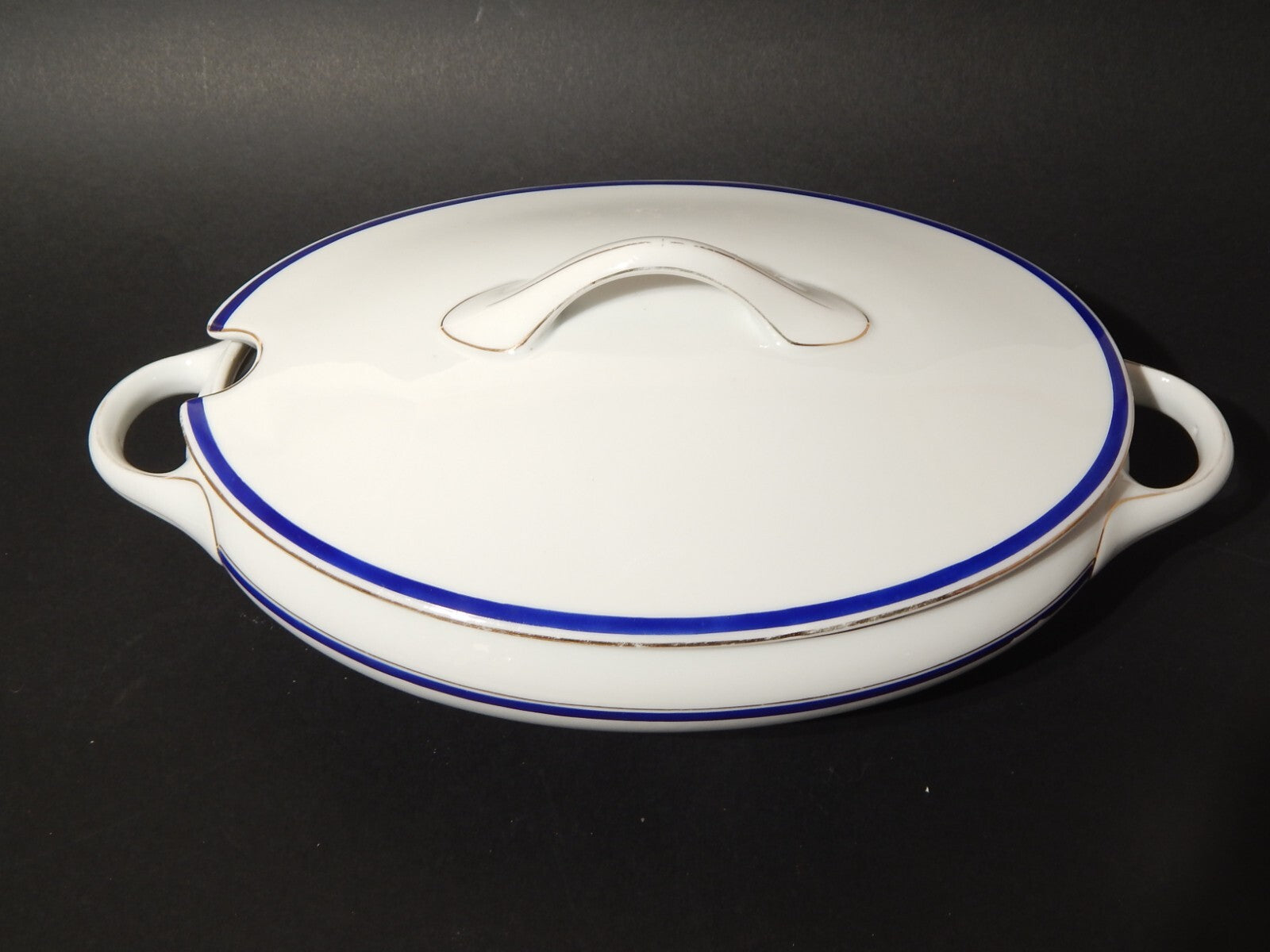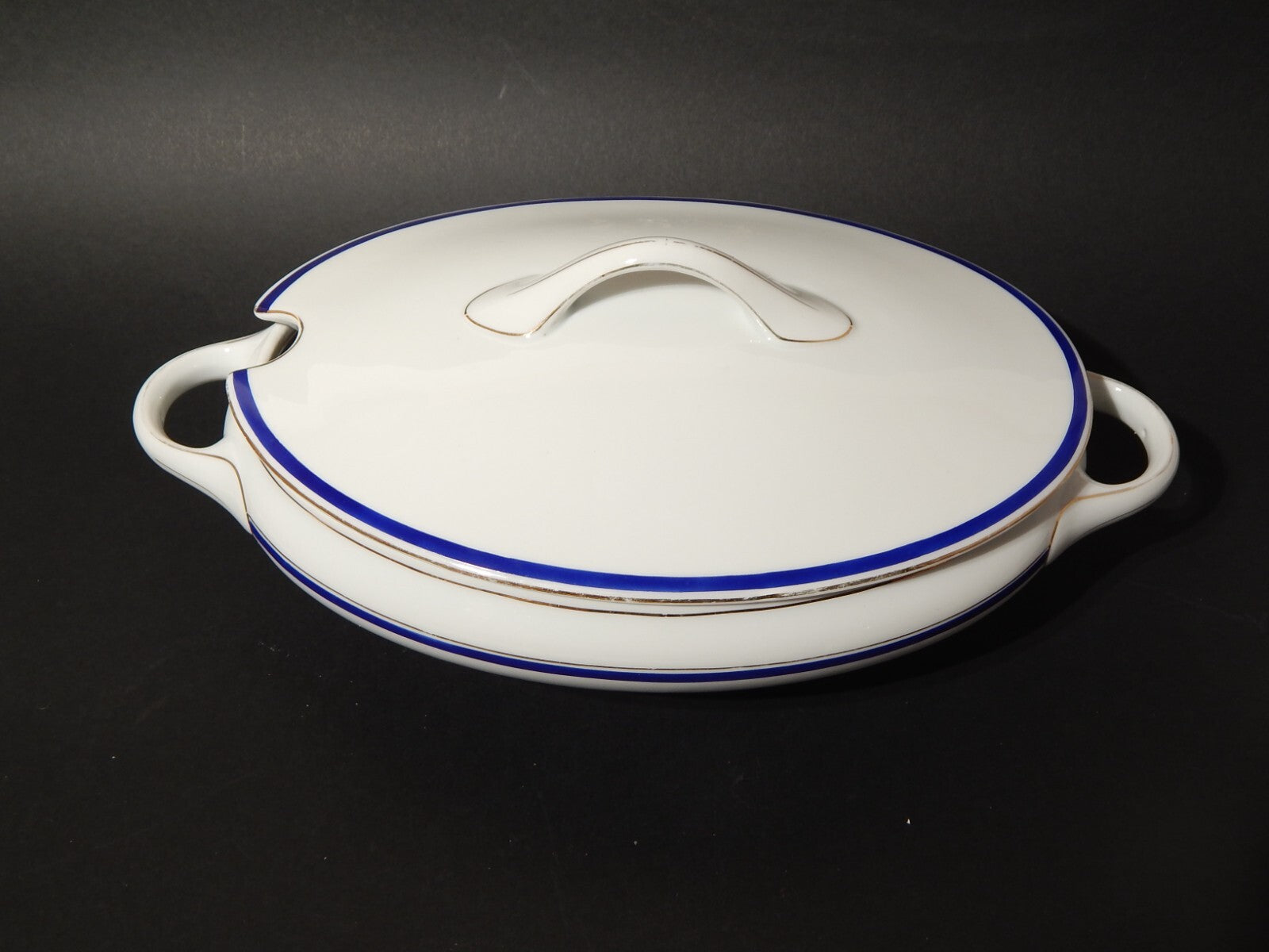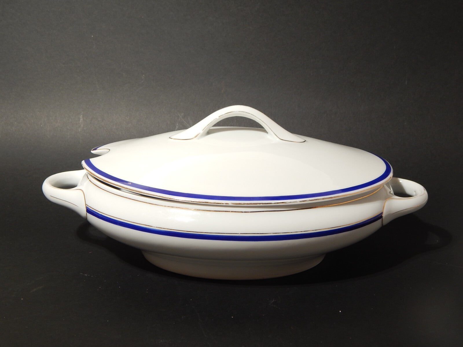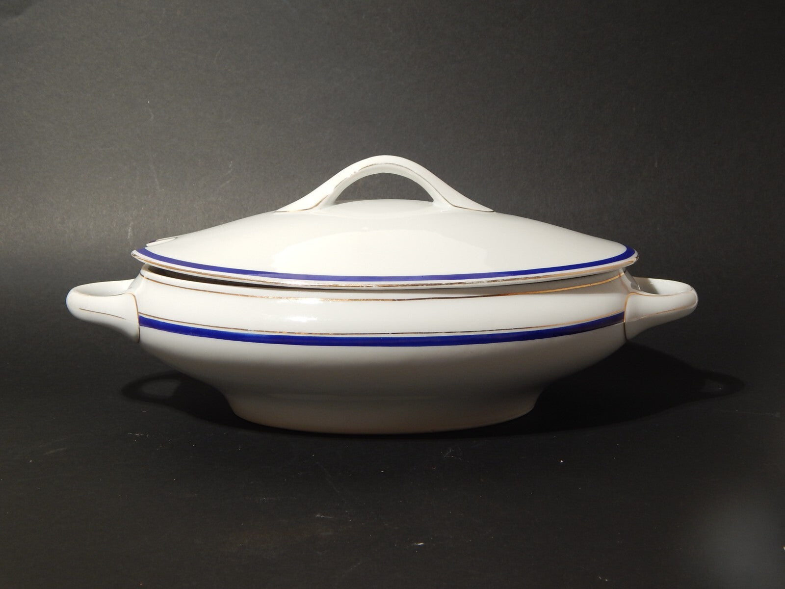 In questa inserzione viene presentata una legumiera o zuppiera antica in porcellana bianca decorata a mano in blu cobalto e oro zecchino realizzata nei primi anni del 1900 in stile impero dalla manifattura tedesca Kpm