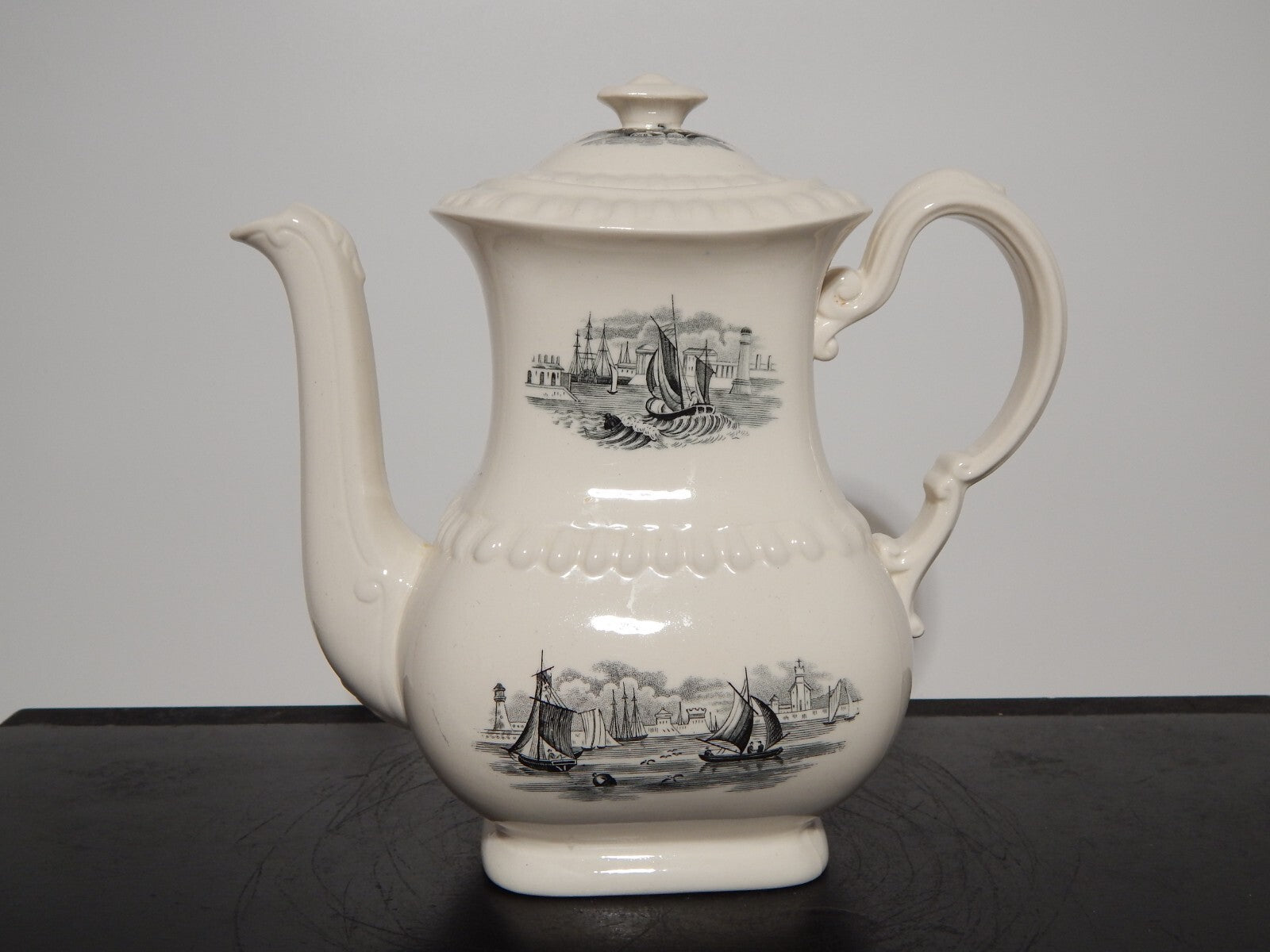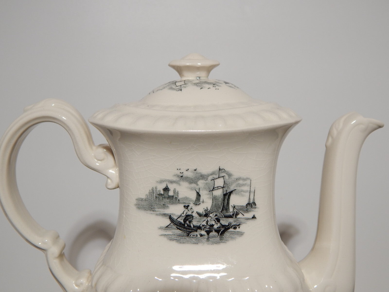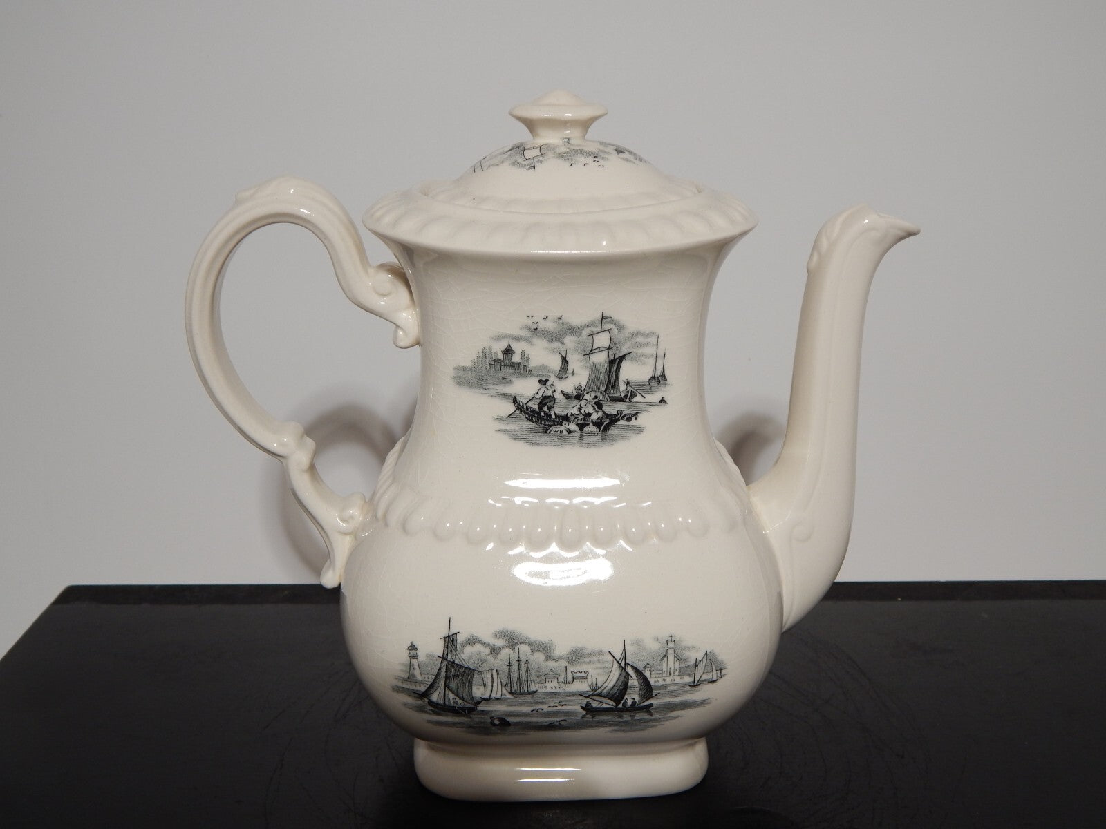 In questa inserzione viene presentata una caffettiera di semi porcellana inglese realizzata dalla rinomata manifattura Spode Copeland decorata con un paesaggio marino