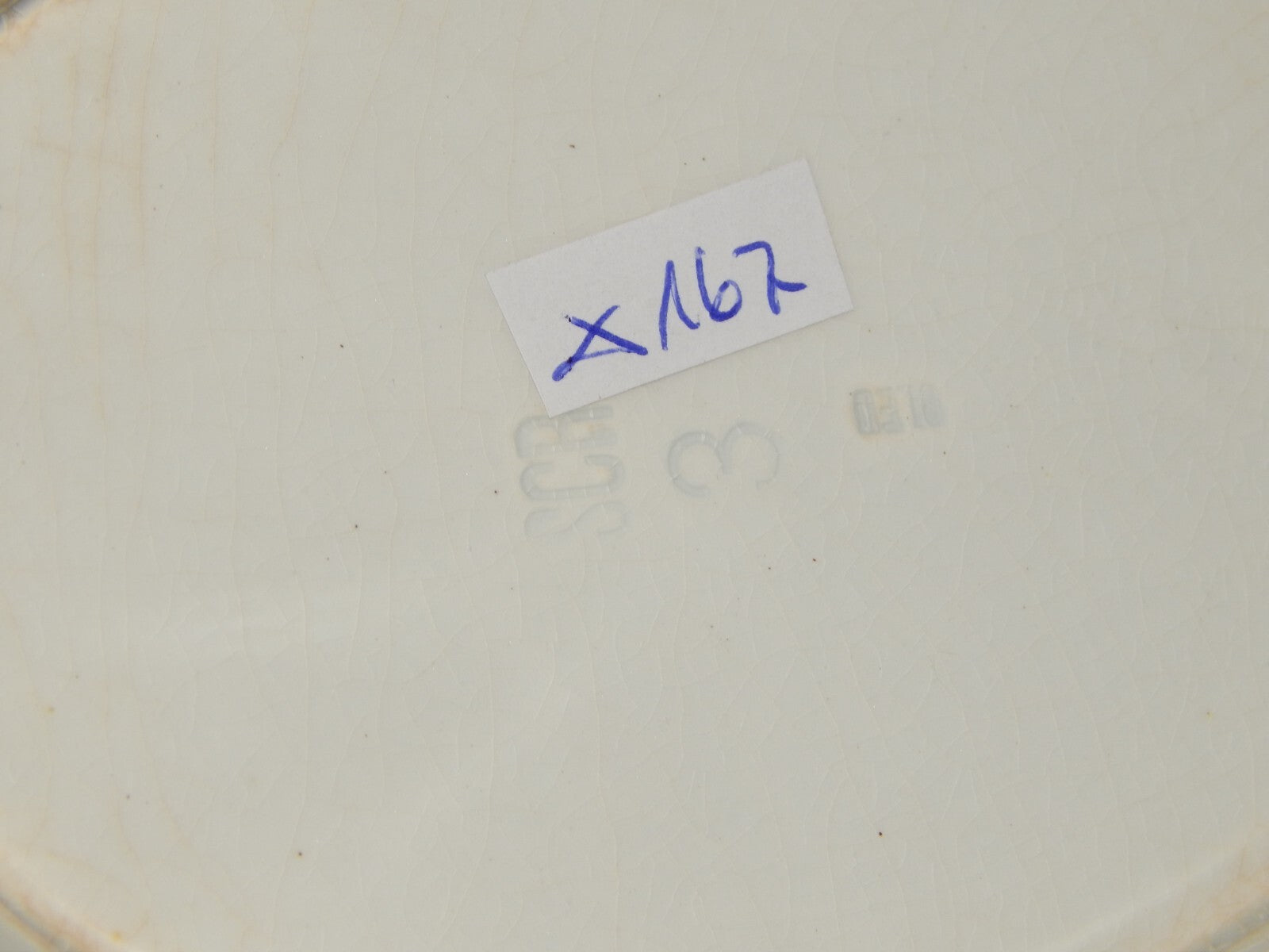 La fruttiera o centrotavola in ceramica bianca decorata in blu cobalto misura 36 x 28,5 cm e 13 cm di altezza, pur essendo priva di scheggiature e filature presenta alcune macchie