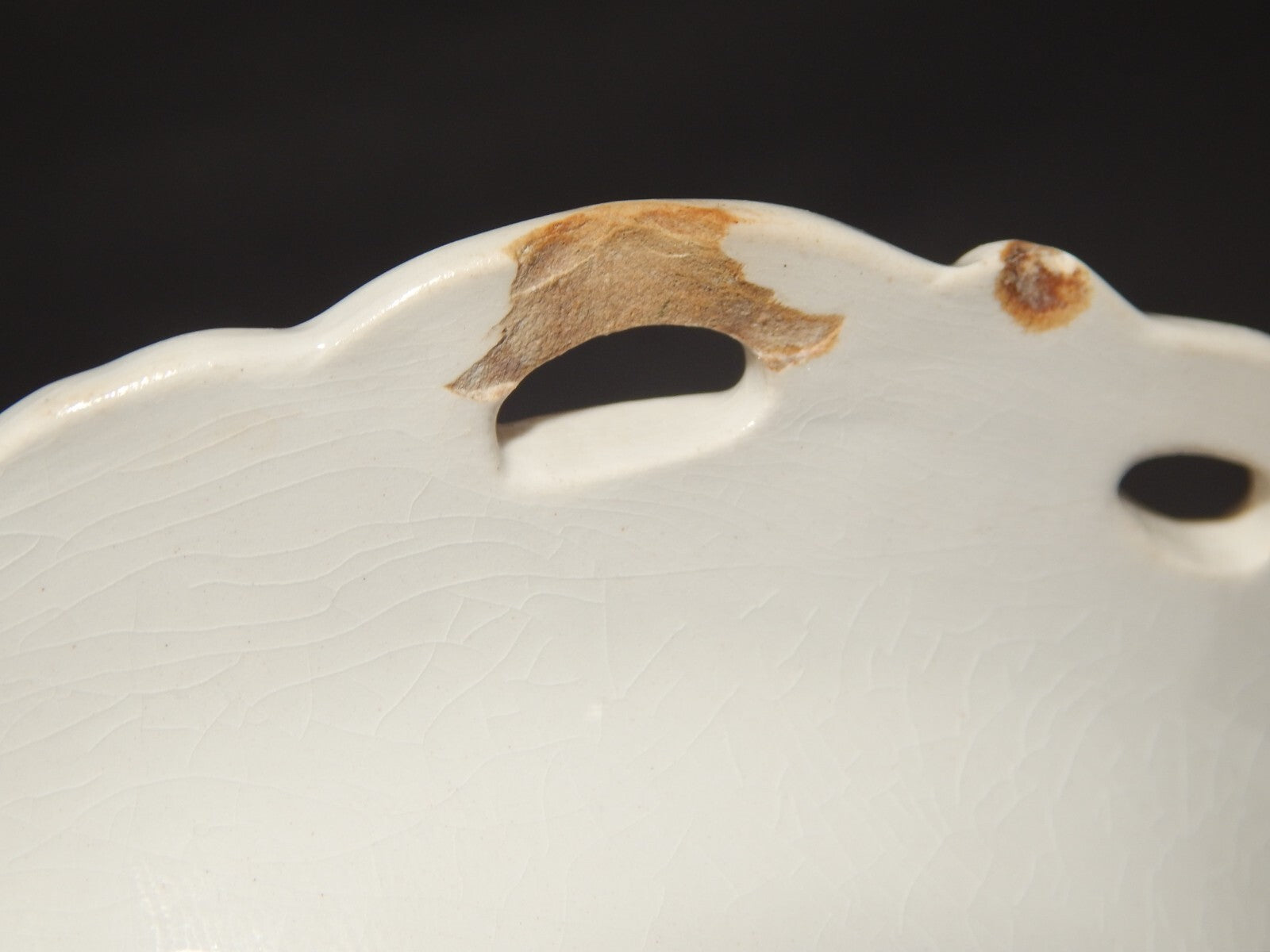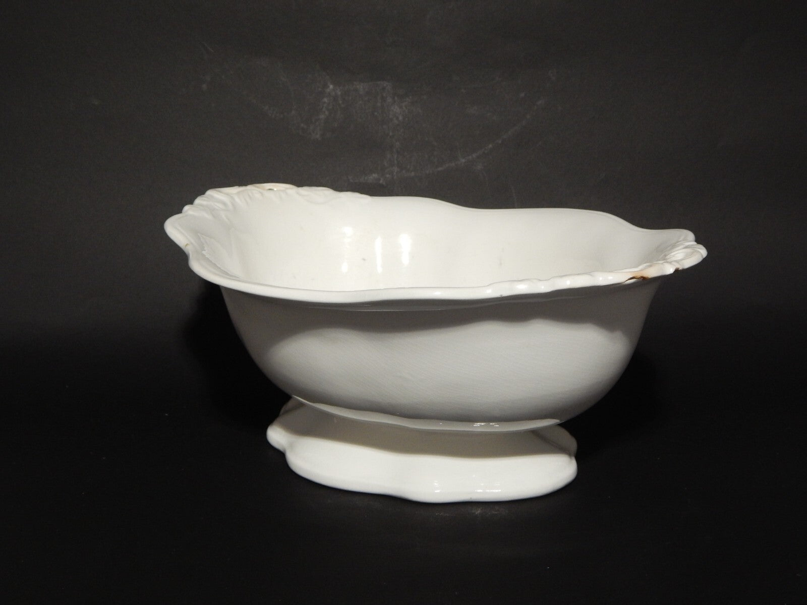 La fruttiera o centrotavola in ceramica bianca misura 33 x 22,5 cm e 11 cm di altezza, come si può vedere dalle foto sono presenti delle scheggiature sotto il bordo