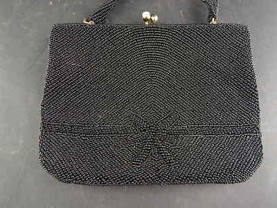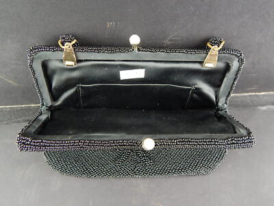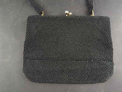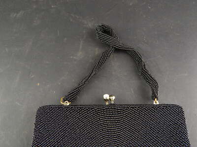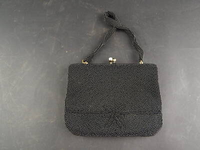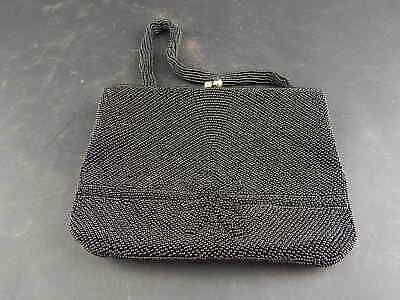 In questa inserzione viene presentata un'antica borsetta da teatro nera realizzata in seta e perline cucite a mano