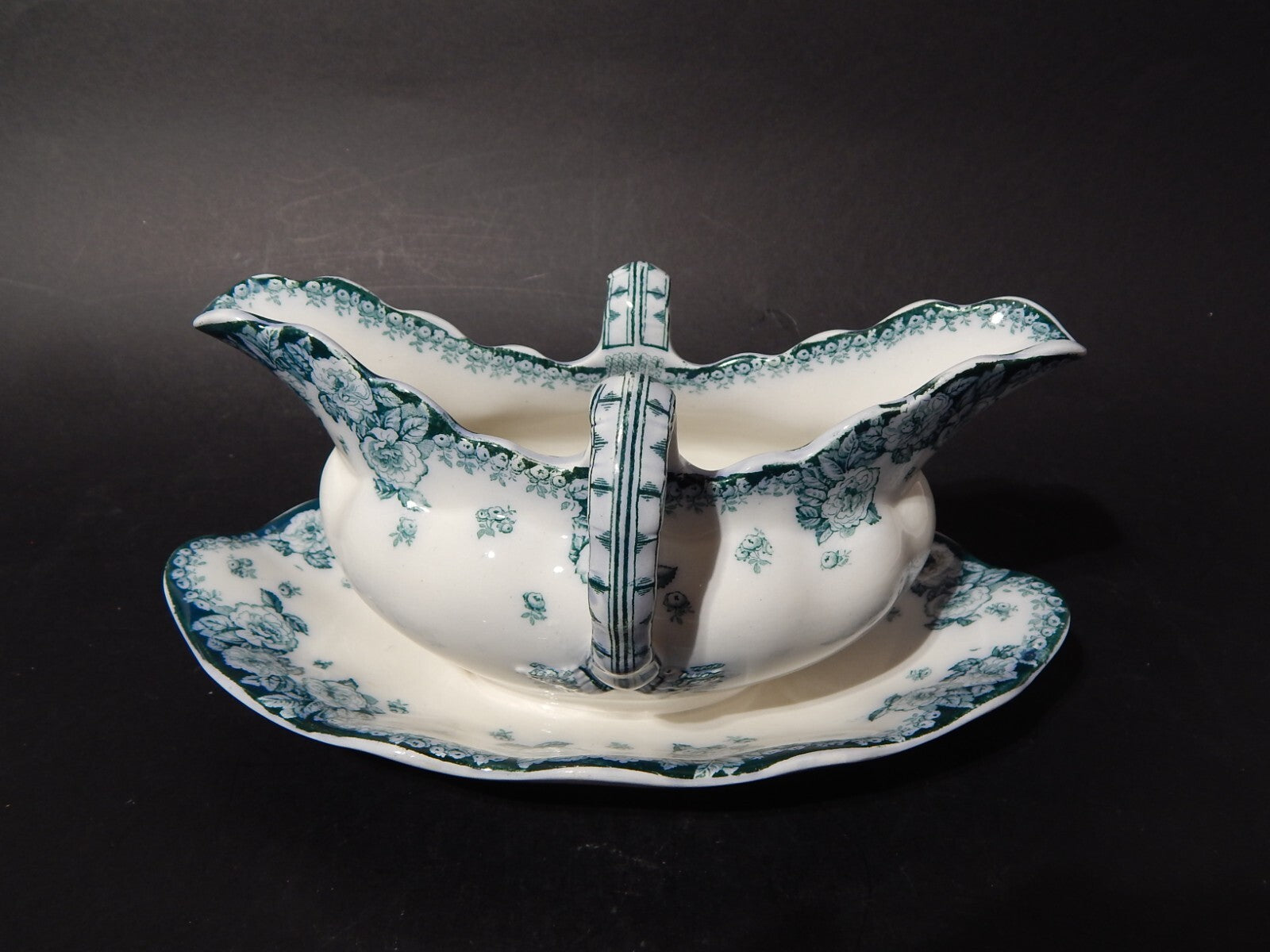 In questa inserzione viene presentata un'antica e rara salsiera realizzata a fine 800 dalla manifattura inglese Furnivals nel decoro English Rose