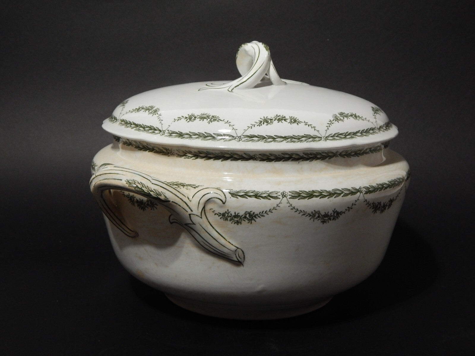 In questa inserzione viene presentata una zuppiera realizzata in ceramica e decorata sottosmalto in verde dalla rinomata manifattura olandese Petrus Regout di Maastricht a metà del 1800