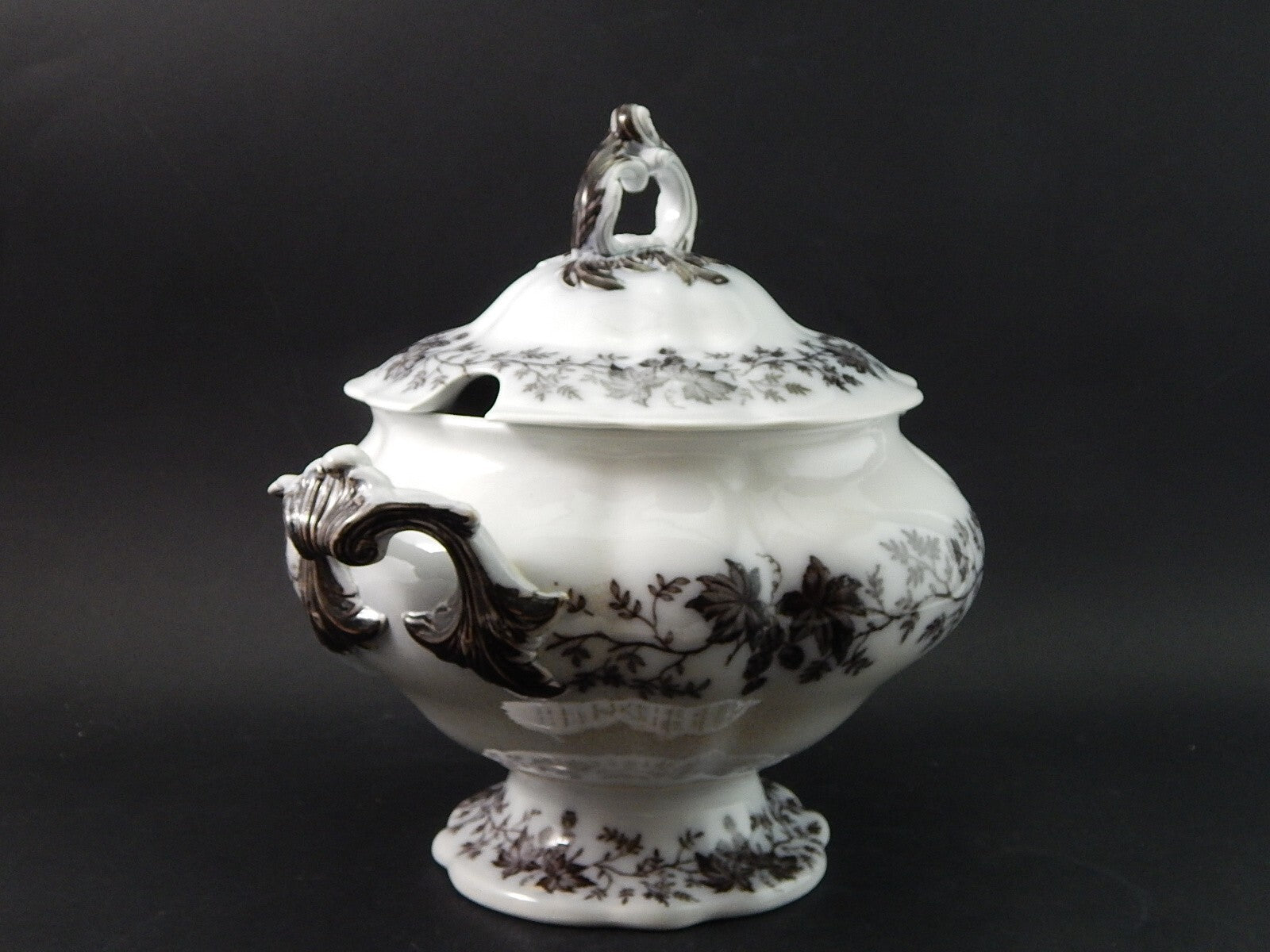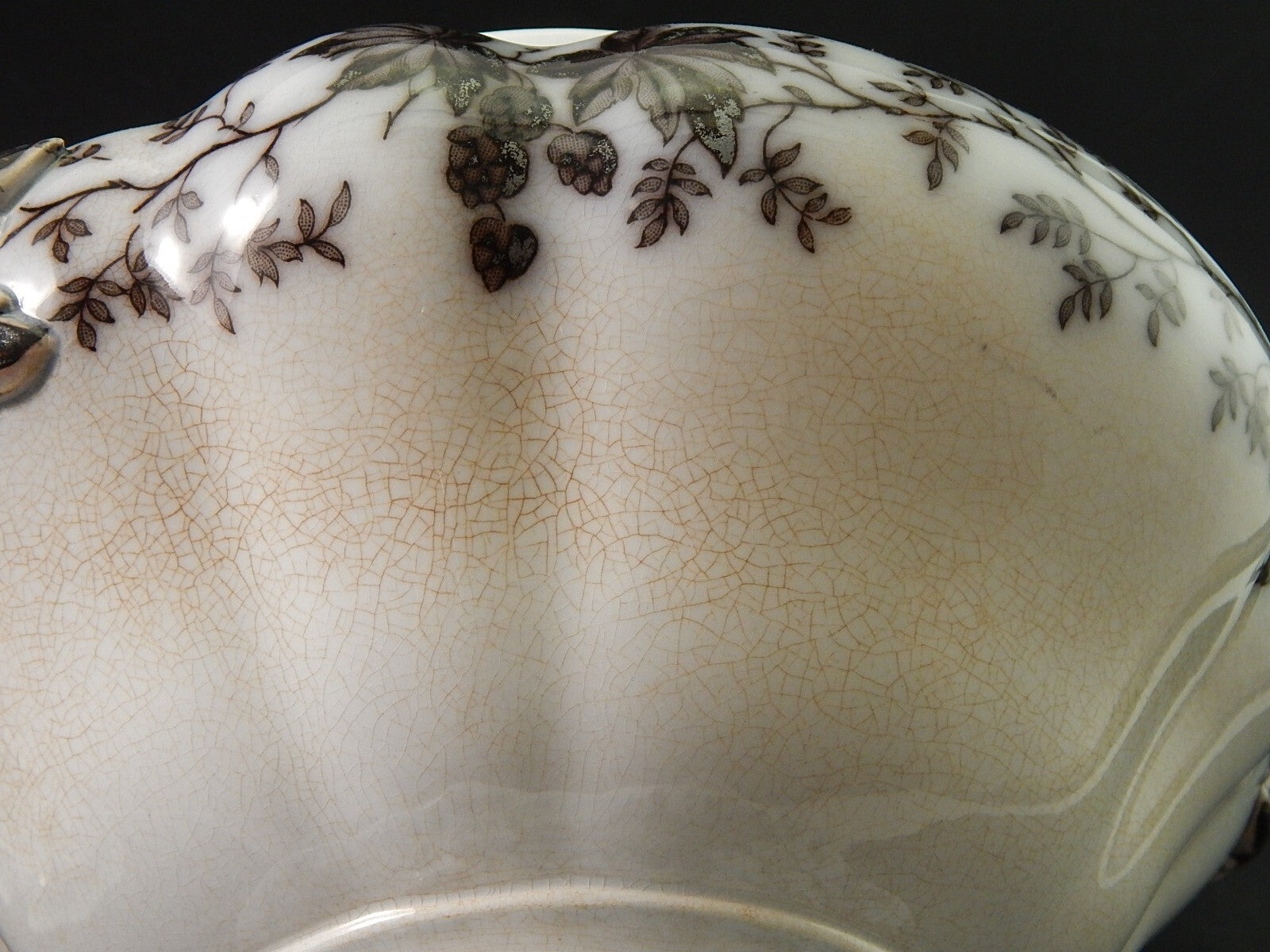 In questa inserzione viene presentata un'antica zuppiera in ceramica risalente alla seconda metà del 1800 realizzata in Francia dalla rinomata manifattura Sarreguemines con decoro Hublon