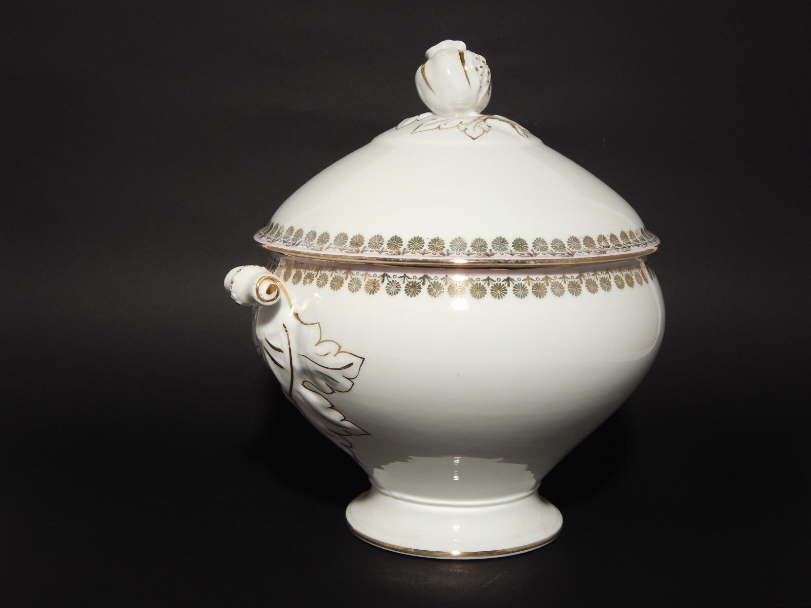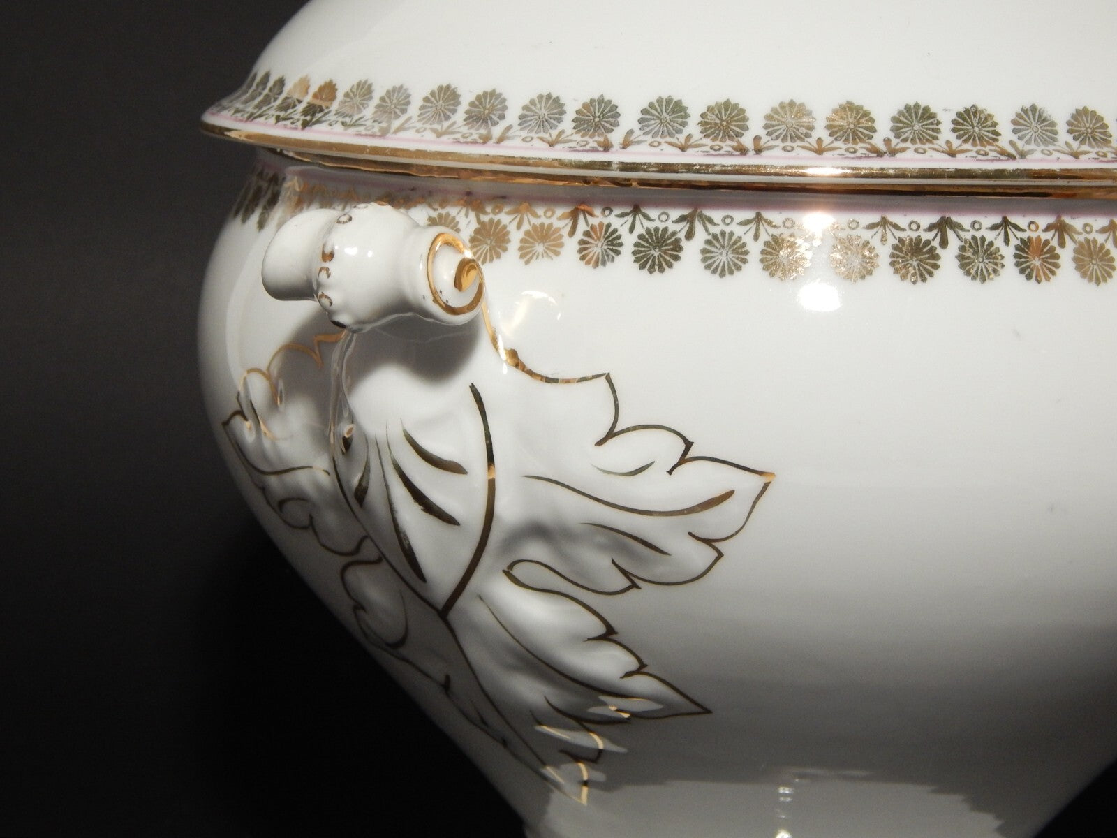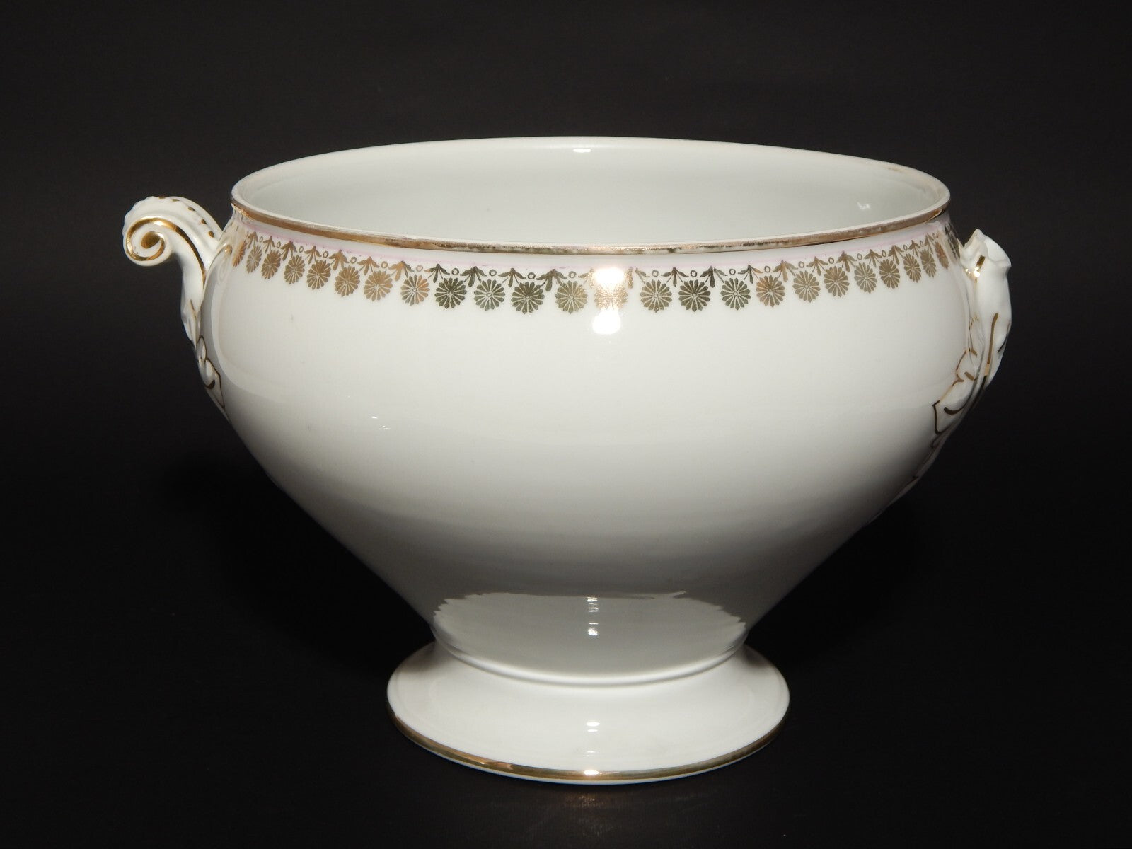 La zuppiera in porcellana bianca è decorata a mano con un profilo rosa e disegni in oro zecchino