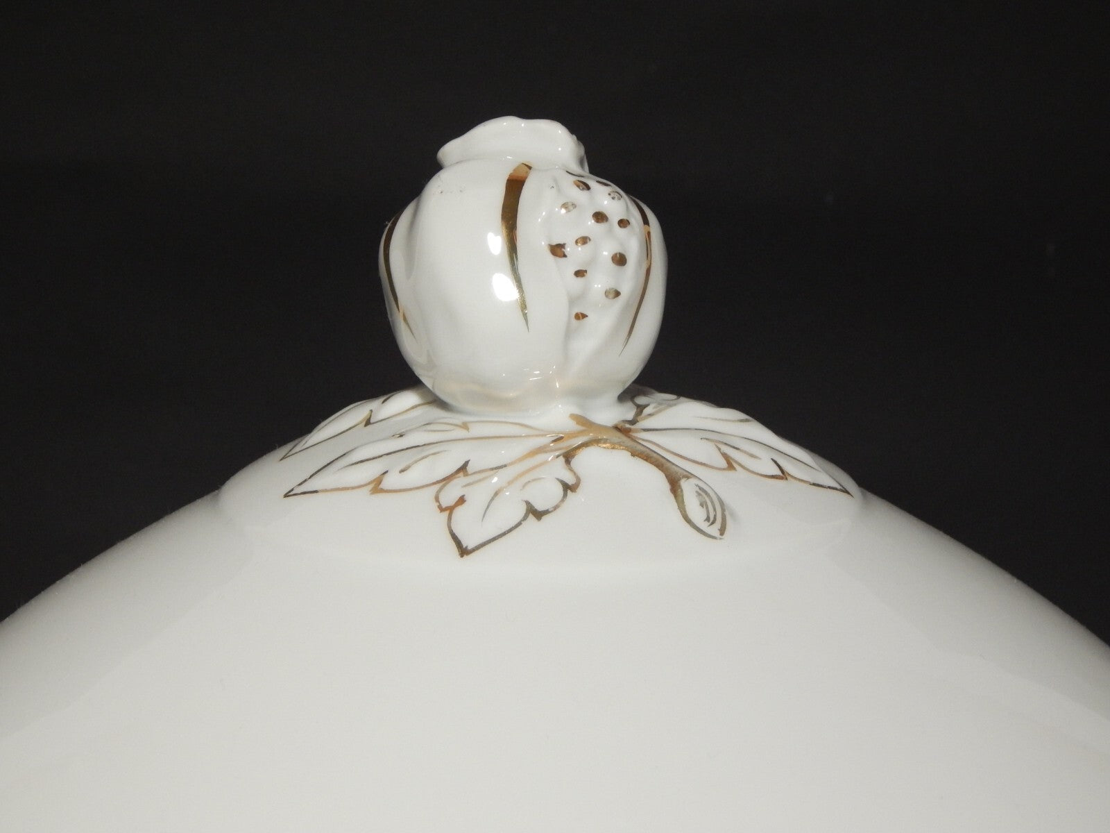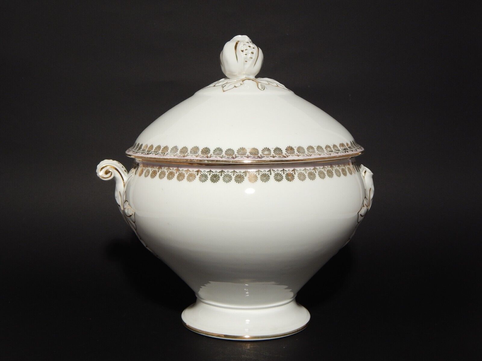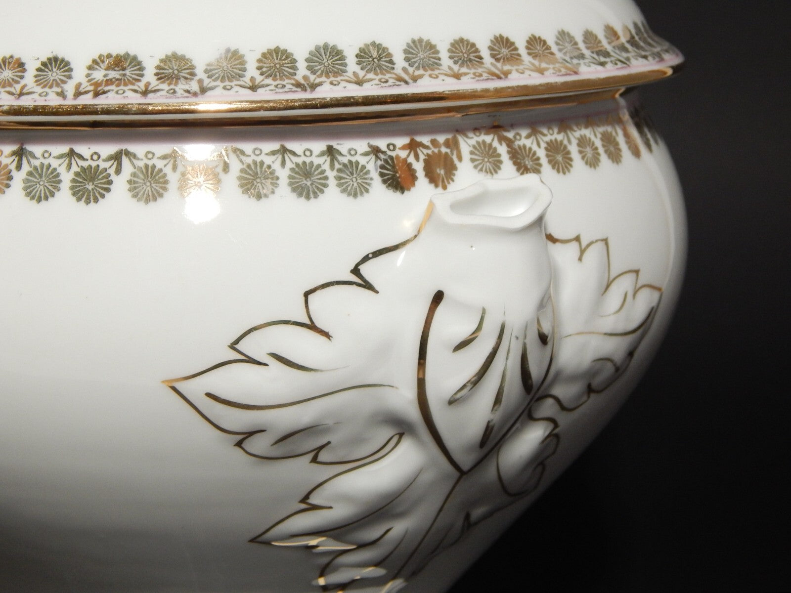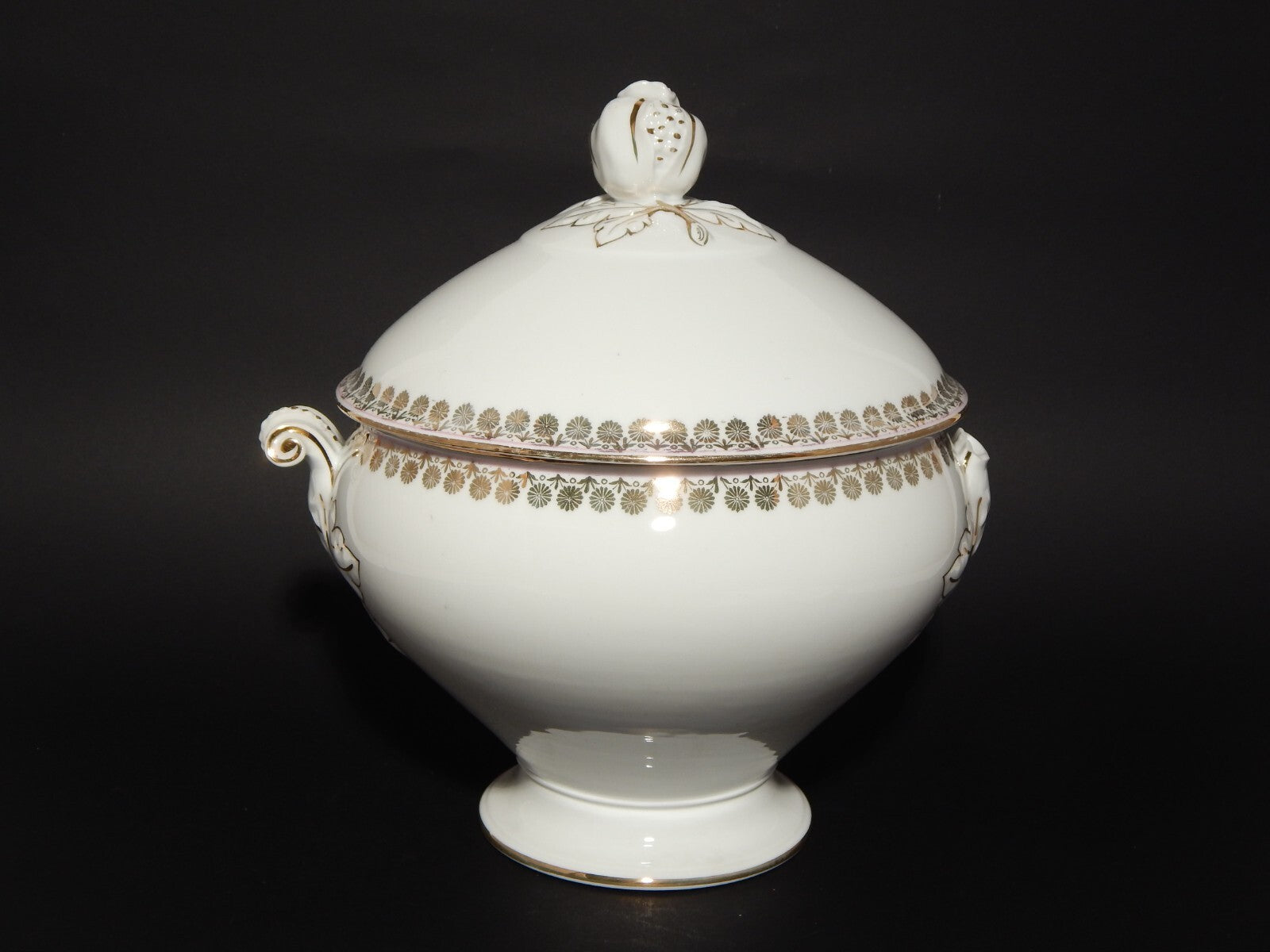 La zuppiera in porcellana bianca è decorata a mano con un profilo rosa e disegni in oro zecchino