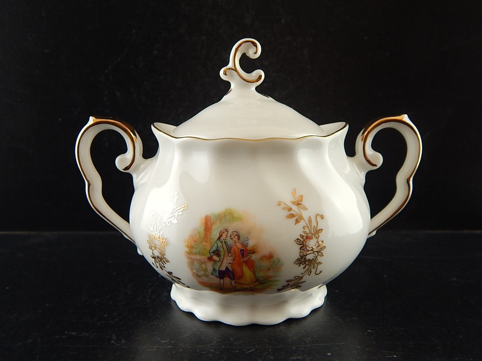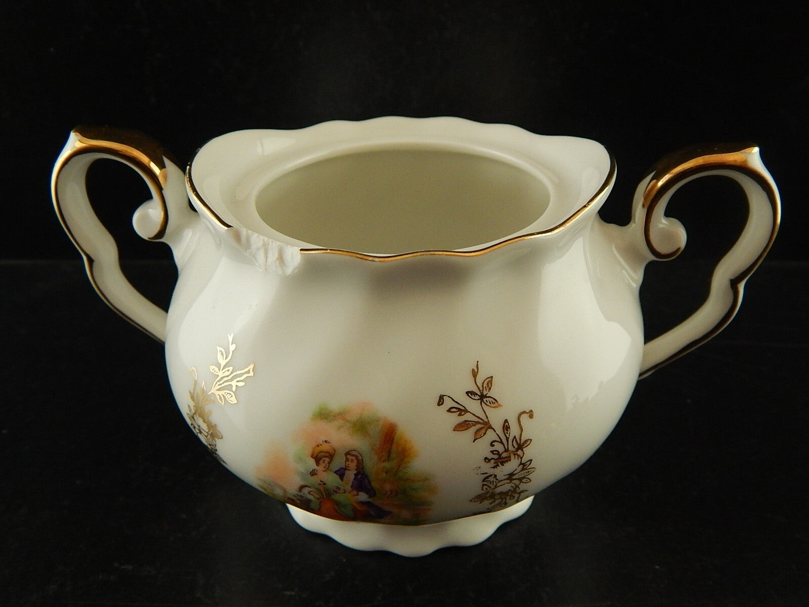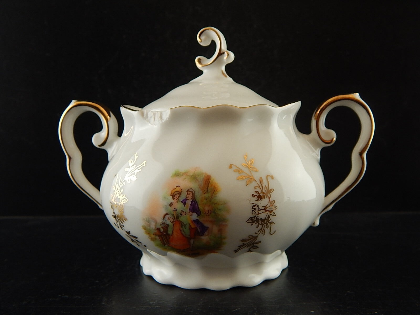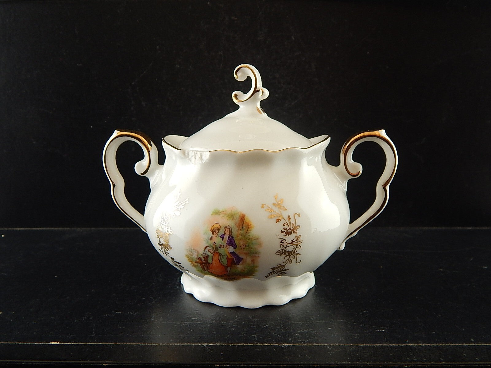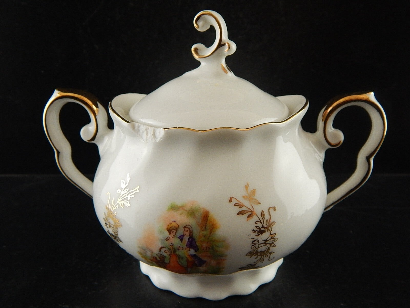 La zuccheriera in porcellana bianca decorata con scena galante misura 14 cm da manico a manico e 10 cm di altezza, come si può vedere dalle foto è scheggiata sul bordo.